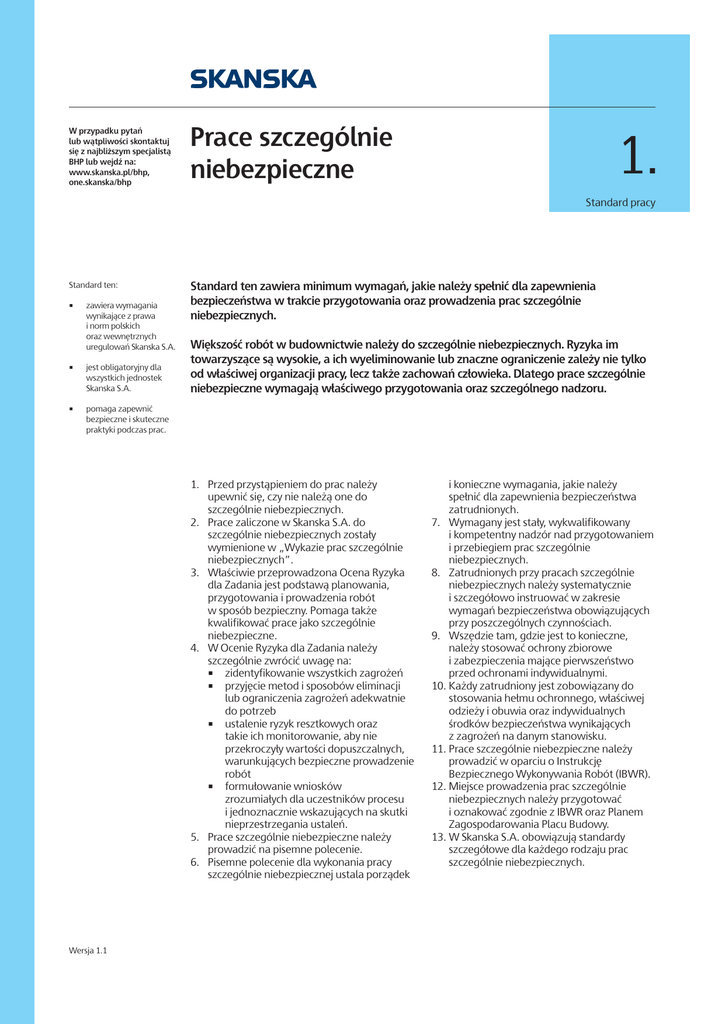 W przypadku pytań lub wątpliwości skontaktuj się z najbliższym specjalistą BHP lub wejdź na: www.skanska.pl/bhp, one.skanska/bhp Prace szczególnie niebezpieczne 1. Standard pracy Standard ten: • zawiera wymagania wynikające z prawa i norm polskich oraz wewnętrznych uregulowań Skanska S.A. • jest obligatoryjny dla wszystkich jednostek Skanska S.A. • pomaga zapewnić bezpieczne i skuteczne praktyki podczas prac. Standard ten zawiera minimum wymagań, jakie należy spełnić dla zapewnienia bezpieczeństwa w trakcie przygotowania oraz prowadzenia prac szczególnie niebezpiecznych. Większość robót w budownictwie należy do szczególnie niebezpiecznych. Ryzyka im towarzyszące są wysokie, a ich wyeliminowanie lub znaczne ograniczenie zależy nie tylko od właściwej organizacji pracy, lecz także zachowań człowieka. Dlatego prace szczególnie niebezpieczne wymagają właściwego przygotowania oraz szczególnego nadzoru. 1. Przed przystąpieniem do prac należy upewnić się, czy nie należą one do szczególnie niebezpiecznych. 2. Prace zaliczone w Skanska S.A. do szczególnie niebezpiecznych zostały wymienione w „Wykazie prac szczególnie niebezpiecznych”. 3. Właściwie przeprowadzona Ocena Ryzyka dla Zadania jest podstawą planowania, przygotowania i prowadzenia robót w sposób bezpieczny. Pomaga także kwalifikować prace jako szczególnie niebezpieczne. 4. W Ocenie Ryzyka dla Zadania należy szczególnie zwrócić uwagę na: • zidentyfikowanie wszystkich zagrożeń • przyjęcie metod i sposobów eliminacji lub ograniczenia zagrożeń adekwatnie do potrzeb • ustalenie ryzyk resztkowych oraz takie ich monitorowanie, aby nie przekroczyły wartości dopuszczalnych, warunkujących bezpieczne prowadzenie robót • formułowanie wniosków zrozumiałych dla uczestników procesu i jednoznacznie wskazujących na skutki nieprzestrzegania ustaleń. 5. Prace szczególnie niebezpieczne należy prowadzić na pisemne polecenie. 6. Pisemne polecenie dla wykonania pracy szczególnie niebezpiecznej ustala porządek Wersja 1.1 i konieczne wymagania, jakie należy spełnić dla zapewnienia bezpieczeństwa zatrudnionych. 7. Wymagany jest stały, wykwalifikowany i kompetentny nadzór nad przygotowaniem i przebiegiem prac szczególnie niebezpiecznych. 8. Zatrudnionych przy pracach szczególnie niebezpiecznych należy systematycznie i szczegółowo instruować w zakresie wymagań bezpieczeństwa obowiązujących przy poszczególnych czynnościach. 9. Wszędzie tam, gdzie jest to konieczne, należy stosować ochrony zbiorowe i zabezpieczenia mające pierwszeństwo przed ochronami indywidualnymi. 10. Każdy zatrudniony jest zobowiązany do stosowania hełmu ochronnego, właściwej odzieży i obuwia oraz indywidualnych środków bezpieczeństwa wynikających z zagrożeń na danym stanowisku. 11. Prace szczególnie niebezpieczne należy prowadzić w oparciu o Instrukcję Bezpiecznego Wykonywania Robót (IBWR). 12. Miejsce prowadzenia prac szczególnie niebezpiecznych należy przygotować i oznakować zgodnie z IBWR oraz Planem Zagospodarowania Placu Budowy. 13. W Skanska S.A. obowiązują standardy szczegółowe dla każdego rodzaju prac szczególnie niebezpiecznych.