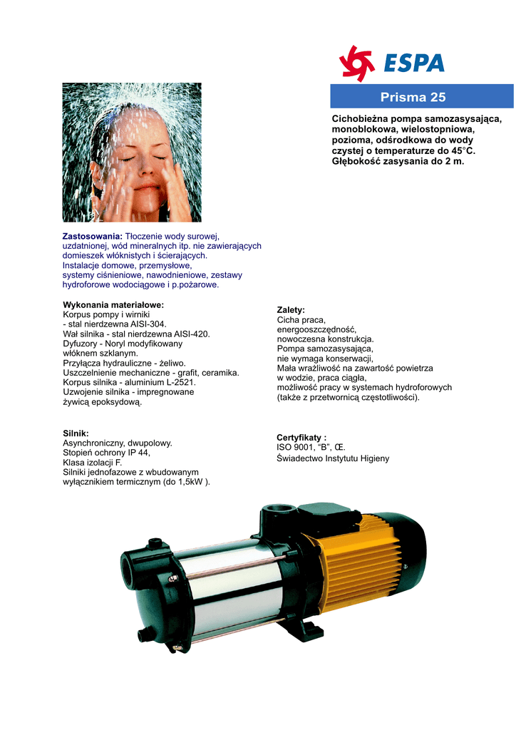 Prisma 25 Cichobieżna pompa samozasysająca, monoblokowa, wielostopniowa, pozioma, odśrodkowa do wody czystej o temperaturze do 45°C. Głębokość zasysania do 2 m. Zastosowania: Tłoczenie wody surowej, uzdatnionej, wód mineralnych itp. nie zawierających domieszek włóknistych i ścierających. Instalacje domowe, przemysłowe, systemy ciśnieniowe, nawodnieniowe, zestawy hydroforowe wodociągowe i p.pożarowe. Wykonania materiałowe: Korpus pompy i wirniki - stal nierdzewna AISI-304. Wał silnika - stal nierdzewna AISI-420. Dyfuzory - Noryl modyfikowany włóknem szklanym. Przyłącza hydrauliczne - żeliwo. Uszczelnienie mechaniczne - grafit, ceramika. Korpus silnika - aluminium L-2521. Uzwojenie silnika - impregnowane żywicą epoksydową. Silnik: Asynchroniczny, dwupolowy. Stopień ochrony IP 44, Klasa izolacji F. Silniki jednofazowe z wbudowanym wyłącznikiem termicznym (do 1,5kW ). Zalety: Cicha praca, energooszczędność, nowoczesna konstrukcja. Pompa samozasysająca, nie wymaga konserwacji, Mała wrażliwość na zawartość powietrza w wodzie, praca ciągła, możliwość pracy w systemach hydroforowych (także z przetwornicą częstotliwości). Certyfikaty : ISO 9001, “B”, Œ. Świadectwo Instytutu Higieny Prisma 25 Prisma 25 2 Prisma25 2 / 3 / 4 A G A B C D E F G H I J Kg 175.5 127 226 82 75 109.5 218 59 138 8 12.5 Prisma 25 3 202 127 252.5 82 75 109.5 218 59 138 8 13.5 Prisma 25 4 228.5 127 279 82 75 109.5 218 59 138 8 14.6 Prisma 25 5 255 127 328 82 75 109.5 240.5 59 138 8 17.2 I U.S. F 5 H Imp [m] B 7.5 5 10 7.5 12.5 15 17.5 10 12.5 15 20 22.5 25 27.5 17.5 20 22.5 30 32.5 35 25 27.5 30 H [ft] E 225 ¯J C Prisma25 5 D A H G H 200 60 I 175 150 F 40 5 125 4 100 B E ¯J D H 75 3 20 C H 50 2 25 0 0 0 20 0.5 1 40 1.5 2 2.5 60 3 3.5 80 4 4.5 100 5 5.5 6 120 6.5 7 7.5 0 Q [l/1'] 3 Q [m/h] P1 [kW/Stopień] η% 0.4 50 0.35 P1 0.3 40 0.25 30 η 20 0.2 0.15 10 N.P.S.H. [m] 5 4 3 2 1 0 230 V 50 Hz 230/400 V 50 Hz A 1~ 230 V 15 30 45 60 75 90 105 120 0.9 1.8 2.7 3.6 4.5 5.4 6.3 7.2 16 22 21 20.5 19 17 15 12 8 L/1’ P1 (kW) 3~ 230 V 400 V 1~ 3~ kW µF 0.75 3 m/h Prisma 25 2M Prisma 25 2 4.3 2.9 1.7 0.9 Prisma 25 3M Prisma 25 3 5.5 3.5 2 1.2 1 0.75 1 16 33 32 30.5 28 26 22 17 12 Prisma 25 4M Prisma 25 4 6.8 4.3 2.5 1.5 1.4 0.92 1.25 16 43 42 40 37 33 28 22 15 Prisma 25 5M Prisma 25 5 7.4 5.2 3 1.7 1.7 1.1 1.5 25 56 55 52.5 48 43 37 29 20 BELSAN Sp. z o.o. 0.85 0.55 HP Regionalne Biura Techniczno-Handlowe: 04-462 Warszawa ul. Stężycak 9 tel/fax: 022 673 52 17(18) Leszno 065 520 50 26 Bielsko Biała 033 817 39 22 Biała Podlaska 083 343 72 52 e-mail: [email protected] www.belsan.pl [email protected] [email protected] [email protected]