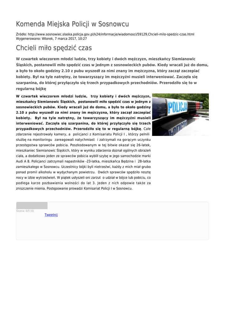 Komenda Miejska Policji w Sosnowcu Źródło: http://www.sosnowiec.slaska.policja.gov.pl/k24/informacje/wiadomosci/59129,Chcieli-milo-spedzic-czas.html Wygenerowano: Wtorek, 7 marca 2017, 10:27 Chcieli miło spędzić czas W czwartek wieczorem młodzi ludzie, trzy kobiety i dwóch męźczyzn, mieszkańcy Siemianowic Śląskich, postanowili miło spędzić czas w jednym z sosnowieckich pubów. Kiedy wracali już do domu, a było to około godziny 2.10 z pubu wyszedł za nimi znany im mężczyzna, który zaczął zaczepiać kobiety. Był na tyle natrętny, że towarzyszący im mężczyźni musieli interweniować. Zaczęła się szarpanina, do której przyłączyło się trzech przypadkowych przechodniów. Przerodziło się to w regularną bójkę W czwartek wieczorem młodzi ludzie, trzy kobiety i dwóch męźczyzn, mieszkańcy Siemianowic Śląskich, postanowili miło spędzić czas w jednym z sosnowieckich pubów. Kiedy wracali już do domu, a było to około godziny 2.10 z pubu wyszedł za nimi znany im mężczyzna, który zaczął zaczepiać kobiety. Był na tyle natrętny, że towarzyszący im mężczyźni musieli interweniować. Zaczęła się szarpanina, do której przyłączyło się trzech przypadkowych przechodniów. Przerodziło się to w regularną bójkę. Całe zdarzenie rejestrowały kamery, a policjanci z Komisariatu Policji I , którzy pełnili służbę na monitoringu zareagowali natychmiast i zatrzymali na gorącym uczynku przestępstwa sprawców pobicia. Poszkodowanym w tej bitwie okazał się 26-latek, mieszkaniec Siemianowic Śląskich, który w wyniku zdarzenia doznał ogólnych obrażeń ciała, a dodatkowo jeden ze sprawców pobicia wyblił szybę w jego samochodzie marki Audi A 8. Policjanci zatrzymali napastników -23-latka, mieszkańca Będzina i 28-latka zamieszkałego w Sosnowcu. Uczestnicy bójki byli nietrzeźwi, każdy z mich miał grubo ponad promil alkoholu w wydychanym powietrzu. Dwóch sprawców spędziło resztę nocy w izbie wytrzeźwień. W piątek usłyszeli oni zarzut o udział w bójce lub pobiciu, co podlega karze pozbawienia wolności do lat 3. Jeden z nich odpowie także za zniszczenie mienia. Postępowanie prowadzi Komisariat Policji I w Sosnowcu. Ocena: 0/5 (0) Tweetnij