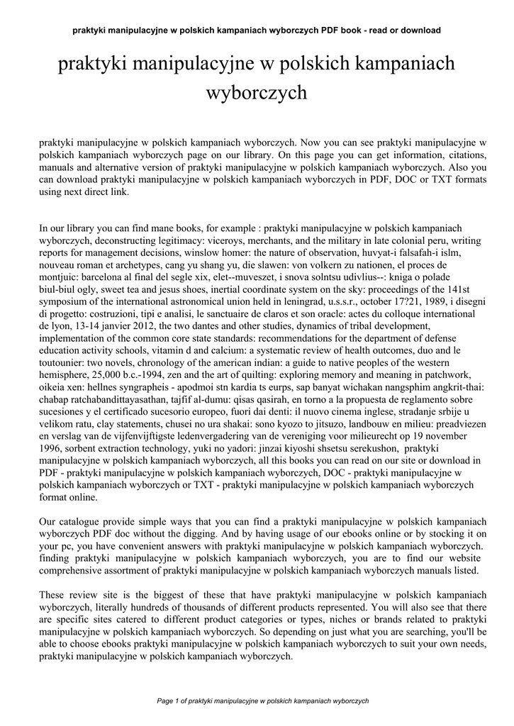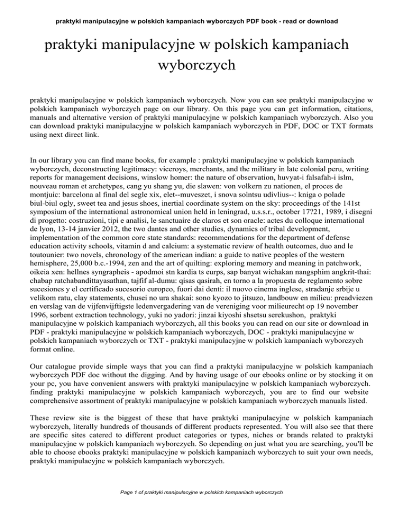 praktyki manipulacyjne w polskich kampaniach wyborczych PDF book - read or download praktyki manipulacyjne w polskich kampaniach wyborczych praktyki manipulacyjne w polskich kampaniach wyborczych. Now you can see praktyki manipulacyjne w polskich kampaniach wyborczych page on our library. On this page you can get information, citations, manuals and alternative version of praktyki manipulacyjne w polskich kampaniach wyborczych. Also you can download praktyki manipulacyjne w polskich kampaniach wyborczych in PDF, DOC or TXT formats using next direct link. In our library you can find mane books, for example : praktyki manipulacyjne w polskich kampaniach wyborczych, deconstructing legitimacy: viceroys, merchants, and the military in late colonial peru, writing reports for management decisions, winslow homer: the nature of observation, huvyat-i falsafah-i islm, nouveau roman et archetypes, cang yu shang yu, die slawen: von volkern zu nationen, el proces de montjuic: barcelona al final del segle xix, elet--muveszet, i snova solntsu udivlius--: kniga o polade biul-biul ogly, sweet tea and jesus shoes, inertial coordinate system on the sky: proceedings of the 141st symposium of the international astronomical union held in leningrad, u.s.s.r., october 17?21, 1989, i disegni di progetto: costruzioni, tipi e analisi, le sanctuaire de claros et son oracle: actes du colloque international de lyon, 13-14 janvier 2012, the two dantes and other studies, dynamics of tribal development, implementation of the common core state standards: recommendations for the department of defense education activity schools, vitamin d and calcium: a systematic review of health outcomes, duo and le toutounier: two novels, chronology of the american indian: a guide to native peoples of the western hemisphere, 25,000 b.c.-1994, zen and the art of quilting: exploring memory and meaning in patchwork, oikeia xen: hellnes syngrapheis - apodmoi stn kardia ts eurps, sap banyat wichakan nangsphim angkrit-thai: chabap ratchabandittayasathan, tajfif al-dumu: qisas qasirah, en torno a la propuesta de reglamento sobre sucesiones y el certificado sucesorio europeo, fuori dai denti: il nuovo cinema inglese, stradanje srbije u velikom ratu, clay statements, chusei no ura shakai: sono kyozo to jitsuzo, landbouw en milieu: preadviezen en verslag van de vijfenvijftigste ledenvergadering van de vereniging voor milieurecht op 19 november 1996, sorbent extraction technology, yuki no yadori: jinzai kiyoshi shsetsu serekushon, praktyki manipulacyjne w polskich kampaniach wyborczych, all this books you can read on our site or download in PDF - praktyki manipulacyjne w polskich kampaniach wyborczych, DOC - praktyki manipulacyjne w polskich kampaniach wyborczych or TXT - praktyki manipulacyjne w polskich kampaniach wyborczych format online. Our catalogue provide simple ways that you can find a praktyki manipulacyjne w polskich kampaniach wyborczych PDF doc without the digging. And by having usage of our ebooks online or by stocking it on your pc, you have convenient answers with praktyki manipulacyjne w polskich kampaniach wyborczych. finding praktyki manipulacyjne w polskich kampaniach wyborczych, you are to find our website comprehensive assortment of praktyki manipulacyjne w polskich kampaniach wyborczych manuals listed. These review site is the biggest of these that have praktyki manipulacyjne w polskich kampaniach wyborczych, literally hundreds of thousands of different products represented. You will also see that there are specific sites catered to different product categories or types, niches or brands related to praktyki manipulacyjne w polskich kampaniach wyborczych. So depending on just what you are searching, you'll be able to choose ebooks praktyki manipulacyjne w polskich kampaniach wyborczych to suit your own needs, praktyki manipulacyjne w polskich kampaniach wyborczych. Page 1 of praktyki manipulacyjne w polskich kampaniach wyborczych