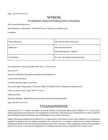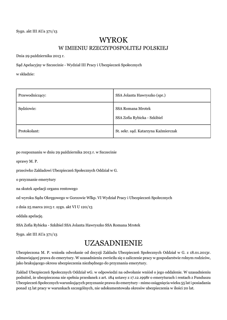 Sygn. akt III AUa 371/13 WYROK W IMIENIU RZECZYPOSPOLITEJ POLSKIEJ Dnia 29 października 2013 r. Sąd Apelacyjny w Szczecinie - Wydział III Pracy i Ubezpieczeń Społecznych w składzie: Przewodniczący: SSA Jolanta Hawryszko (spr.) Sędziowie: SSA Romana Mrotek SSA Zofia Rybicka - Szkibiel Protokolant: St. sekr. sąd. Katarzyna Kaźmierczak po rozpoznaniu w dniu 29 października 2013 r. w Szczecinie sprawy M. P. przeciwko Zakładowi Ubezpieczeń Społecznych Oddział w G. o przyznanie emerytury na skutek apelacji organu rentowego od wyroku Sądu Okręgowego w Gorzowie Wlkp. VI Wydział Pracy i Ubezpieczeń Społecznych z dnia 25 marca 2013 r. sygn. akt VI U 120/13 oddala apelację. SSA Zofia Rybicka - Szkibiel SSA Jolanta Hawryszko SSA Romana Mrotek Sygn. akt III AUa 371/13 UZASADNIENIE Ubezpieczona M. P. wniosła odwołanie od decyzji Zakładu Ubezpieczeń Społecznych Oddział w G. z 18.01.2013r. odmawiającej prawa do emerytury. W uzasadnieniu zwróciła się o zaliczenie pracy w gospodarstwie rolnym rodziców, jako brakującego okresu ubezpieczenia niezbędnego do przyznania emerytury. Zakład Ubezpieczeń Społecznych Oddział wG. w odpowiedzi na odwołanie wniósł o jego oddalenie. W uzasadnieniu podniósł, że ubezpieczona nie spełnia przesłanek z art. 184 ustawy z 17.12.1998r o emeryturach i rentach z Funduszu Ubezpieczeń Społecznych warunkujących przyznanie prawa do emerytury - mimo osiągnięcia wieku 55 lat i posiadania ponad 15 lat pracy w warunkach szczególnych, nie udokumentowała okresów ubezpieczenia w ilości 20 lat. Sąd Okręgowy w Gorzowie Wielkopolskim wyrokiem z 25 marca 2013 r. zmienił zaskarżoną decyzję i przyznał M. P. prawo do emerytury od 1 stycznia 2013 r. W toku postępowania przed sądem I instancji ustalono, że M. P. w okresie od 3.02.1958r. do 30.11.1981r. była zameldowana na pobyt stały w G. nr (...) gdzie znajdowało się gospodarstwo rolne rodziców. Gospodarstwo, o powierzchni 9,71 ha należało do rodziców ubezpieczonej M. i T. w okresie od 1964r. do 15.07.1980 r., kiedy to przekazali je na Skarb Państwa w zamian za świadczenia rentowe. M. P. po ukończeniu szkoły podstawowej podjęła naukę w Liceum Ogólnokształcącym w R.. Szkoła położona była w odległości 20 km od G.i podróż w jedną stronę trwała około pół godziny. Przez pierwsze dwa lata nauki w liceum M. P. mieszkała w internacie i do domu przyjeżdżała w miarę możliwości, średnio dwa, trzy razy w tygodniu oraz na weekendy. Po dwóch latach zrezygnowała z internatu i do szkoły dojeżdżała codziennie przez następne dwa lata. Do domu wracała około 16.00 i przez 4-5 godzin codziennie wykonywała czynności związane z przygotowaniem pożywienia dla zwierząt (świń, krów, koni i drobiu). Należało do nich min. przyniesienie wielokilogramowych koszy z ziemniakami do parownika, parowanie ich i następnie przygotowanie specjalnego pożywienia, siekanie sieczki, szykowanie paszy, karmienie i obrządzanie zwierząt (sprzątanie); często doiła krowy, rozlewała mleko przeznaczone do rozlewni, przyprowadzała krowy z pastwiska. Czynności te wykonywała codziennie przez cały rok kalendarzowy. Ponadto pracowała w polu przy pracach siewnych, przy hakaniu i plewieniu buraków, przy ziemniakach (w tym wykopkach). Po zakończeniu codziennych obowiązków w godzinach wieczornych przystępowała do nauki. W okresach wakacji letnich M. P. nigdzie nie wyjeżdżała i stale pracowała w gospodarstwie z uwagi na nasilenie prac polowych, zwłaszcza w okresie żniw. Po zakończeniu nauki w Liceum Ogólnokształcącym od 1.09.1977 r. M. P. podjęła naukę w (...)Studium Zawodowym w Z.. Do szkoły wyjeżdżała około godziny 5.00 rano autobusem do R., a następnie przez ponad godzinę pociągiem. W czasie tej podróży uczyła się. Podobnie było kiedy wracała ze szkoły. Zajęć w szkole nie było dużo i w domu M. P. była około 16.00. Przez resztę dnia pracowała w wymiarze co najmniej 4-5 godzin dziennie, przy tych samych czynnościach, które wykonywała ucząc się w Liceum. Naukę zakończyła w maju 1979r. a od 1.09.1979 r. rozpoczęła pracę w SP ZOZ w S. i mieszkała w hotelu robotniczym. Po 5 miesiącach wróciła do gospodarstwa rodziców. Gospodarstwo rodziców ubezpieczonej zajmowało się uprawą zbóż, buraków i ziemniaków. Hodowano także krowy (4), młode bydło oraz trzodę chlewną i drób: kaczki, kury. Nie było zmechanizowane, wszystkie prace wykonywane były ręcznie. W gospodarstwie, po ukończeniu przez M. P. 16 lat, oprócz rodziców pracowała tylko ona. Młodszy o półtora roku brat wyjechał go G.. gdzie uczył się i pracował w (...), a starsza siostra po wyjściu za mąż w roku 1971 wyprowadziła się do męża. Matka ubezpieczonej była bardzo schorowana i głównie, w okresach lepszego samopoczucia, zajmowała się prowadzeniem domu. Pozostałe prace wykonywała M. P. z ojcem. Zdarzało się im korzystać z pomocy sąsiedzkiej, co następnie musieli odpracować. Czasami w nasilonych pracach pomagał mąż siostry. Łącznie pozwany zaliczył ubezpieczonej okres ubezpieczenia w ilości 17 lat i 15 dni. Ubezpieczona nie jest członkiem Otwartego Funduszu Emerytalnego. Do 31.12.2012r. pozostawała w stosunku pracy. Sąd okręgowy na podstawie zeznań świadków uznał, że ubezpieczona pracowała w gospodarstwie rodziców podczas wakacji letnich i ferii zimowych czyli łącznie okres pięciu miesięcy pracy ( od 1.07.1974 r. do 31.08.1974 r. oraz od 1.07.1975 r. do 31.08.1975 r. a także dwa razy po dwa tygodnie ferii zimowych - zimą 1974 r. 1 zimą 1975 r. ). Natomiast w kolejnych latach nauki w liceum, sąd zaliczył nie tylko okres dwukrotnych ferii zimowych i wakacji letnich w łącznym wymiarze 5 miesięcy, ale także pracę w ciągu roku szkolnego w wymiarze co najmniej 4 godzin dziennie, gdyż ubezpieczona po zajęciach szkolnych, z których wracała o godzinie 16 pracowała w gospodarstwie. Pracę w gospodars