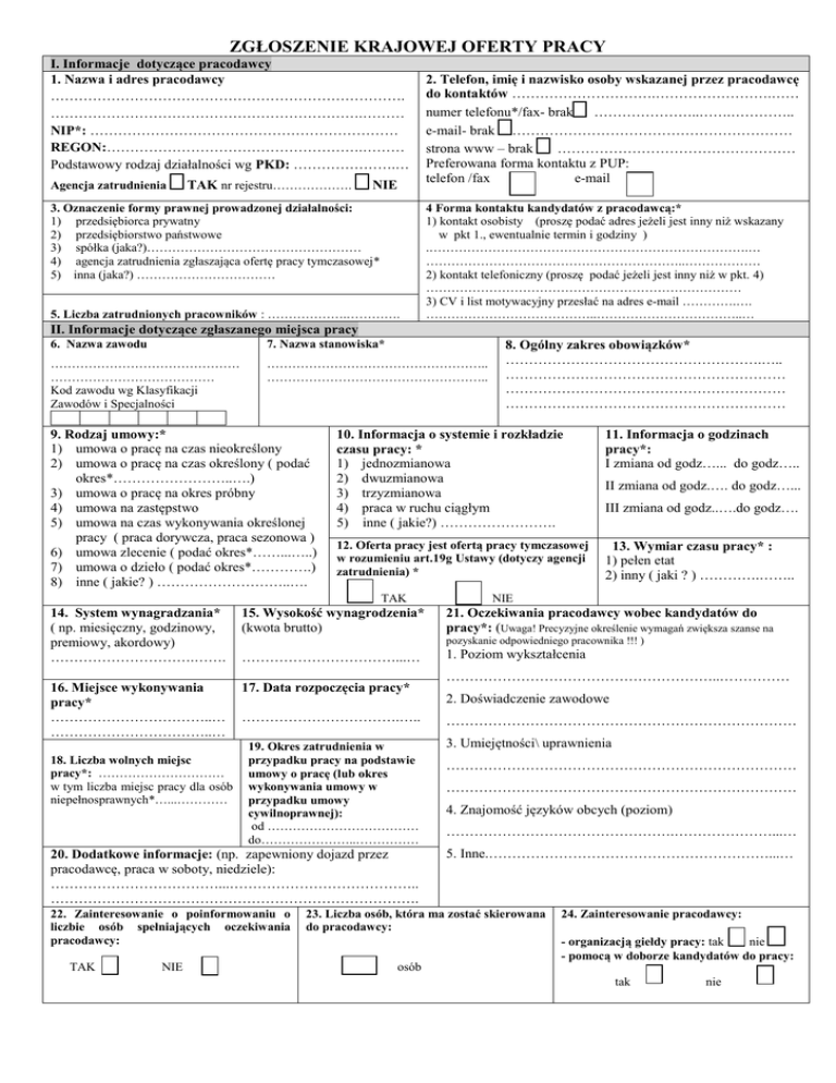 ZGŁOSZENIE KRAJOWEJ OFERTY PRACY I. Informacje dotyczące pracodawcy 1. Nazwa i adres pracodawcy …………………………………………………………………. ………………………………………………………….……… NIP*: ………………………………………………………… REGON:……………………………………………….……… Podstawowy rodzaj działalności wg PKD: ………………….… Agencja zatrudnienia TAK nr rejestru………………. NIE 3. Oznaczenie formy prawnej prowadzonej działalności: 1) przedsiębiorca prywatny 2) przedsiębiorstwo państwowe 3) spółka (jaka?)…………………………………………… 4) agencja zatrudnienia zgłaszająca ofertę pracy tymczasowej* 5) inna (jaka?) …………………………… 5. Liczba zatrudnionych pracowników : ……………….…………. 2. Telefon, imię i nazwisko osoby wskazanej przez pracodawcę do kontaktów ………………………….…………………….…… numer telefonu*/fax- brak …………………..…….………….. e-mail- brak …………………………………………………… strona www – brak …………………………………………… Preferowana forma kontaktu z PUP: telefon /fax e-mail 4 Forma kontaktu kandydatów z pracodawcą:* 1) kontakt osobisty (proszę podać adres jeżeli jest inny niż wskazany w pkt 1., ewentualnie termin i godziny ) .………………………………………………………………….… ……………………………………………………..……………… 2) kontakt telefoniczny (proszę podać jeżeli jest inny niż w pkt. 4) ………………………………………………………………… 3) CV i list motywacyjny przesłać na adres e-mail ………….…. …………………………………..……………………………..… II. Informacje dotyczące zgłaszanego miejsca pracy 6. Nazwa zawodu 7. Nazwa stanowiska* ……………………………………… ………………………………… Kod zawodu wg Klasyfikacji Zawodów i Specjalności …………………………………………….. …………………………………………….. 9. Rodzaj umowy:* 1) umowa o pracę na czas nieokreślony 2) umowa o pracę na czas określony ( podać okres*……………………..….) 3) umowa o pracę na okres próbny 4) umowa na zastępstwo 5) umowa na czas wykonywania określonej pracy ( praca dorywcza, praca sezonowa ) 6) umowa zlecenie ( podać okres*……...…..) 7) umowa o dzieło ( podać okres*………….) 8) inne ( jakie? ) ………………………..…. 10. Informacja o systemie i rozkładzie czasu pracy: * 1) jednozmianowa 2) dwuzmianowa 3) trzyzmianowa 4) praca w ruchu ciągłym 5) inne ( jakie?) ……………………. 11. Informacja o godzinach pracy*: I zmiana od godz…... do godz….. 12. Oferta pracy jest ofertą pracy tymczasowej w rozumieniu art.19g Ustawy (dotyczy agencji zatrudnienia) * 13. Wymiar czasu pracy* : 1) pełen etat 2) inny ( jaki ? ) ………….…….. TAK 14. System wynagradzania* ( np. miesięczny, godzinowy, premiowy, akordowy) ………………………….……. 15. Wysokość wynagrodzenia* (kwota brutto) 16. Miejsce wykonywania pracy* ……………………………..… ……………………………..… 17. Data rozpoczęcia pracy* 18. Liczba wolnych miejsc pracy*: ………………………… w tym liczba miejsc pracy dla osób niepełnosprawnych*…...………… …………………………….….. 19. Okres zatrudnienia w przypadku pracy na podstawie umowy o pracę (lub okres wykonywania umowy w przypadku umowy cywilnoprawnej): od ……………………………… do…………………..…………… 22. Zainteresowanie o poinformowaniu o liczbie osób spełniających oczekiwania pracodawcy: NIE II zmiana od godz.…. do godz…... III zmiana od godz..….do godz…. NIE 21. Oczekiwania pracodawcy wobec kandydatów do pracy*: (Uwaga! Precyzyjne określenie wymagań zwiększa szanse na pozyskanie odpowiedniego pracownika !!! ) ……………………………...… 20. Dodatkowe informacje: (np. zapewniony dojazd przez pracodawcę, praca w soboty, niedziele): ………………………………...………………………………….. ……………………………………………………………………. TAK 8. Ogólny zakres obowiązków* ……………………………………………….….. …………………………………………………… …………………………………………………… …………………………………………………… 1. Poziom wykształcenia …………………………………………………..…………… 2. Doświadczenie zawodowe ………………………………………………………………… 3. Umiejętności\ uprawnienia ………………………………………………………………… ………………………………………………………………… 4. Znajomość języków obcych (poziom) ………………………………………….…………………...… 5. Inne.……………………………………………………...… 23. Liczba osób, która ma zostać skierowana do pracodawcy: osób 24. Zainteresowanie pracodawcy: - organizacją giełdy pracy: tak nie - pomocą w doborze kandydatów do pracy: tak nie 25. Forma upowszechniania oferty*: ( Uwaga! Należy wybrać odpowiednią formę - właściwe zakreślić ) Otwarta, która zawiera dane umożliwiające identyfikację pracodawcy krajowego (Pracodawca wyraża zgodę na upublicznienie danych teleadresowych umożliwiających zainteresowanym osobom nawiązanie z nimi bezpośredniego kontaktu ) Zamknięta, która nie zawiera danych pracodawcy krajowego ( Do pracodawcy na rozmowę kwalifikacyjną w sprawie pracy kierowane są tylko osoby spełni