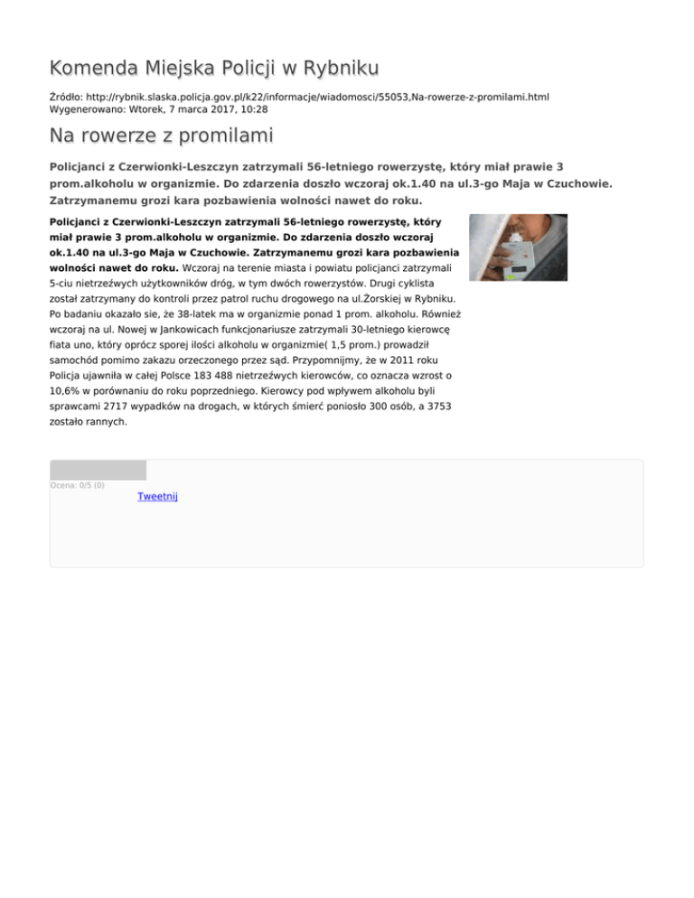 Komenda Miejska Policji w Rybniku Źródło: http://rybnik.slaska.policja.gov.pl/k22/informacje/wiadomosci/55053,Na-rowerze-z-promilami.html Wygenerowano: Wtorek, 7 marca 2017, 10:28 Na rowerze z promilami Policjanci z Czerwionki-Leszczyn zatrzymali 56-letniego rowerzystę, który miał prawie 3 prom.alkoholu w organizmie. Do zdarzenia doszło wczoraj ok.1.40 na ul.3-go Maja w Czuchowie. Zatrzymanemu grozi kara pozbawienia wolności nawet do roku. Policjanci z Czerwionki-Leszczyn zatrzymali 56-letniego rowerzystę, który miał prawie 3 prom.alkoholu w organizmie. Do zdarzenia doszło wczoraj ok.1.40 na ul.3-go Maja w Czuchowie. Zatrzymanemu grozi kara pozbawienia wolności nawet do roku. Wczoraj na terenie miasta i powiatu policjanci zatrzymali 5-ciu nietrzeźwych użytkowników dróg, w tym dwóch rowerzystów. Drugi cyklista został zatrzymany do kontroli przez patrol ruchu drogowego na ul.Żorskiej w Rybniku. Po badaniu okazało sie, że 38-latek ma w organizmie ponad 1 prom. alkoholu. Również wczoraj na ul. Nowej w Jankowicach funkcjonariusze zatrzymali 30-letniego kierowcę fiata uno, który oprócz sporej ilości alkoholu w organizmie( 1,5 prom.) prowadził samochód pomimo zakazu orzeczonego przez sąd. Przypomnijmy, że w 2011 roku Policja ujawniła w całej Polsce 183 488 nietrzeźwych kierowców, co oznacza wzrost o 10,6% w porównaniu do roku poprzedniego. Kierowcy pod wpływem alkoholu byli sprawcami 2717 wypadków na drogach, w których śmierć poniosło 300 osób, a 3753 zostało rannych. Ocena: 0/5 (0) Tweetnij