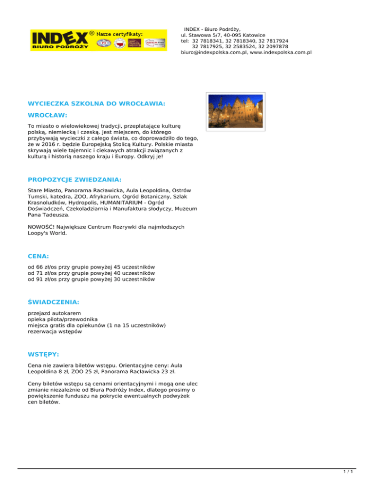 INDEX - Biuro Podróży, ul. Stawowa 5/7, 40-095 Katowice tel: 32 7818341, 32 7818340, 32 7817924 32 7817925, 32 2583524, 32 2097878 [email protected], www.indexpolska.com.pl WYCIECZKA SZKOLNA DO WROCŁAWIA: WROCŁAW: To miasto o wielowiekowej tradycji, przeplatające kulturę polską, niemiecką i czeską. Jest miejscem, do którego przybywają wycieczki z całego świata, co doprowadziło do tego, że w 2016 r. będzie Europejską Stolicą Kultury. Polskie miasta skrywają wiele tajemnic i ciekawych atrakcji związanych z kulturą i historią naszego kraju i Europy. Odkryj je! PROPOZYCJE ZWIEDZANIA: Stare Miasto, Panorama Racławicka, Aula Leopoldina, Ostrów Tumski, katedra, ZOO, Afrykarium, Ogród Botaniczny, Szlak Krasnoludków, Hydropolis, HUMANITARIUM - Ogród Doświadczeń, Czekoladziarnia i Manufaktura słodyczy, Muzeum Pana Tadeusza. NOWOŚĆ! Największe Centrum Rozrywki dla najmłodszych Loopy's World. CENA: od 66 zł/os przy grupie powyżej 45 uczestników od 71 zł/os przy grupie powyżej 40 uczestników od 91 zł/os przy grupie powyżej 30 uczestników ŚWIADCZENIA: przejazd autokarem opieka pilota/przewodnika miejsca gratis dla opiekunów (1 na 15 uczestników) rezerwacja wstępów WSTĘPY: Cena nie zawiera biletów wstępu. Orientacyjne ceny: Aula Leopoldina 8 zł, ZOO 25 zł, Panorama Racławicka 23 zł. Ceny biletów wstępu są cenami orientacyjnymi i mogą one ulec zmianie niezależnie od Biura Podróży Index, dlatego prosimy o powiększenie funduszu na pokrycie ewentualnych podwyżek cen biletów. 1/1 Powered by TCPDF (www.tcpdf.org)