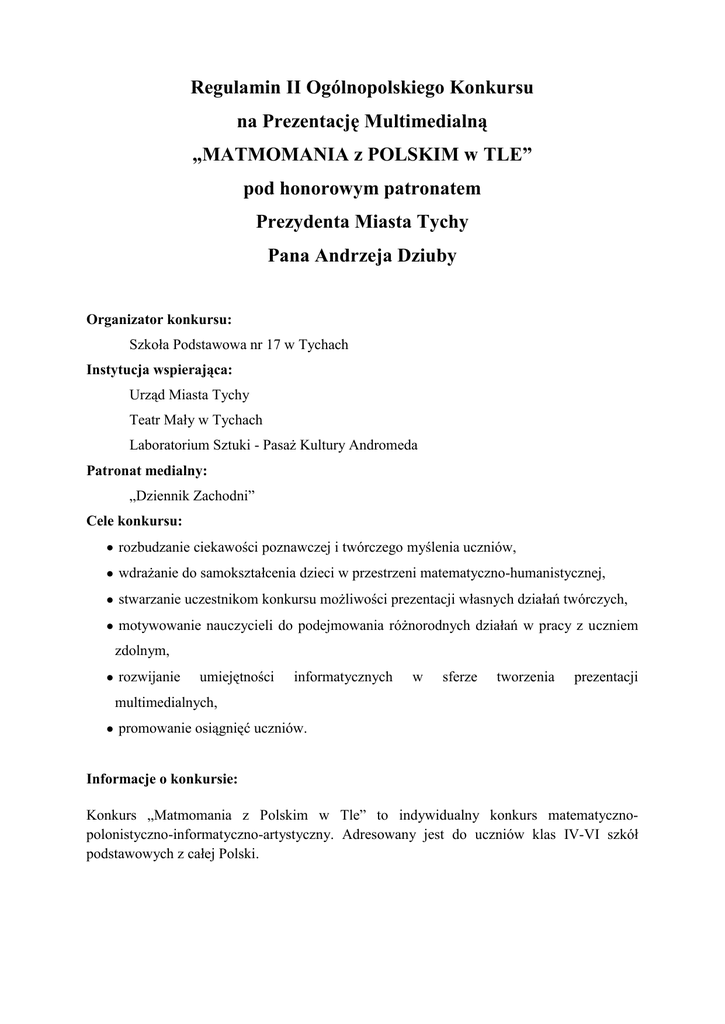 Regulamin II Ogólnopolskiego Konkursu na Prezentację Multimedialną „MATMOMANIA z POLSKIM w TLE” pod honorowym patronatem Prezydenta Miasta Tychy Pana Andrzeja Dziuby Organizator konkursu: Szkoła Podstawowa nr 17 w Tychach Instytucja wspierająca: Urząd Miasta Tychy Teatr Mały w Tychach Laboratorium Sztuki - Pasaż Kultury Andromeda Patronat medialny: „Dziennik Zachodni” Cele konkursu: rozbudzanie ciekawości poznawczej i twórczego myślenia uczniów, wdrażanie do samokształcenia dzieci w przestrzeni matematyczno-humanistycznej, stwarzanie uczestnikom konkursu możliwości prezentacji własnych działań twórczych, motywowanie nauczycieli do podejmowania różnorodnych działań w pracy z uczniem zdolnym, rozwijanie umiejętności informatycznych w sferze tworzenia prezentacji multimedialnych, promowanie osiągnięć uczniów. Informacje o konkursie: Konkurs „Matmomania z Polskim w Tle” to indywidualny konkurs matematycznopolonistyczno-informatyczno-artystyczny. Adresowany jest do uczniów klas IV-VI szkół podstawowych z całej Polski. Warunki uczestnictwa: 1. Uczestnikami konkursu mogą być wyłącznie uczniowie szkół podstawowych z całej Polski. 2. Przedmiotem konkursu jest stworzenie prezentacji w programie Microsoft PowerPoint (wewnętrzna organizacja, ilustracja i ilość slajdów dowolna), w której będzie zawarta tylko jedna z poniższych prac: a) akrostych z ukrytym hasłem związanym z królową nauk, b) akromonogram odwołujący się do matematyki, c) dowolny stroficzny utwór liryczny, którego treść bliska będzie słowom Galileusza „Matematyka jest alfabetem, za pomocą którego Bóg opisał wszechświat”, d) ciekawa praca obrazującą myśl A. Einsteina – „Matematyka to poezja logicznego myślenia”. 3. Zwycięskie prace z I edycji konkursu oraz wszystkie niezbędne informacje znajdują się na stronie internetowej www.sp17.tychy.szkolnastrona.pl w zakładce Konkurs na Prezentację Multimedialną. 4. W prezentacji mogą znajdować się zdjęcia, rysunki (najlepiej wykonane samodzielnie przez ucznia), podkład muzyczny, dialogi, filmy. Ostatni slajd w prezentacji powinien zawierać informacje według wzoru: Imię, nazwisko autora: Klasa: Imię, nazwisko nauczyciela prowadzącego: E-mail nauczyciela (opcjonalnie): Nazwa szkoły: Adres szkoły: E-mail szkoły: Telefon szkoły: 5. Każdy uczestnik może przesłać na konkurs maksymalnie jedną pracę. 6. Metody przesyłania prac konkursowych: Prezentację należy nagrać na płytę CD lub DVD i dostarczyć wraz z wydrukowanym oświadczeniem uczestnika (załącznik) na poniższy adres do dnia 24 marca 2017 roku Szkoła Podstawowa nr 17 ul. Begonii 5 43-100 Tychy Z dopiskiem: konkurs „Matmomania z Polskim w Tle”. Prezentację wraz z zeskanowanym oświadczeniem należy przesłać na maila [email protected] lub w przypadku dużego rozmiaru pliku przez bezpłatną stronę internetową www.wetransfer.com postępując następująco: - w polu „Add your file” przesłać prezentację wraz z oświadczeniem - w polu ”Email to” wpisać [email protected] - w polu „Your email” wpisać swój email - w polu „Message” wpisać nazwę i adres szkoły wraz z danymi uczestnika oraz opiekuna 7. Jednostką zgłaszającą indywidualne prace do konkursu jest szkoła, która wysyła prace do Organizatora na własny koszt. 8. Prace nadesłane po terminie, wykonane zbiorowo lub wcześniej publikowane nie będą brały udziału w konkursie. 9. Zgłoszone na konkurs prezentacje przechodzą na własność Organizatora i nie będą odsyłane. 10. Organizator zastrzega sobie prawo do nieodpłatnego wykorzystywania wszystkich prac do celów ekspozycyjnych oraz publikacji w formie elektronicznej w celu popularyzacji konkursu. 11. Prace zostaną ocenione przez Komisję Konkursową powołaną przez Organizatora, która wyłoni zwycięzców. Komisja konkursowa oceniać będzie: zastosowanie się do zapisów niniejszego Regulaminu, poprawność merytoryczną zamieszczonych w prezentacji informacji, stopień trudności użytych technik, estetykę wykonania i sposób prezentacji, a przede wszystkim oryginalność, kreatywność i pomysłowość w podejściu do tematu. 12. Decyzja jury jest ostateczna. 13. Organizator zobowiązuje się do ufundowania dyplomów oraz upominków rzeczowych autorom najlepszych prac. 14. Ogłoszenie wyników nastąpi do 4 kwietnia 2017 roku. Informacja zwrotna pojawi się na stronie internetowej szkoły www.sp17.tychy.szkolnastrona.pl i zostanie przesłana drogą mailową do nauczyciela lub szkoły zgłaszającej uczestnika. 15. Wręczenie nagród i wyróżnień nastąpi podczas otwarcia wystawy pokonkursowej, która odbędzie się dnia 12 kwietnia 2017 roku w Laboratorium Sztuki - Pasaż Kultury Andromeda, Plac Baczyńskiego 2, Tychy. 16. Obecność laureatów nie jest obowiązkowa. W przypadku nieobecności laureata nagroda zostanie wysłana przez Organizatora pocztą na adres placówki oświatowej w terminie 7 dni. 17. Zgłoszenie prac oznacza akceptację warunków konkursu i regulaminu. Udział w konkursie jest równoznaczny z wyrażeniem przez osoby uczestniczące zgody na przetwarzanie danych osobowych na potrzeby konkursu oraz w celach marketingowych Organizatora / ustawa o ochronie danych osobowych z dnia 29.08.1997 r. Dz. U. Nr 133 poz. 833 z późniejszymi zmianami./ Wszelkie pytania można kierować na adres [email protected] lub pod nr. telefonów: (32) 227 32 10, 533 444 727, 533 544 157 Organizatorzy: mgr Zofia Stacha, mgr Artur Biskup
