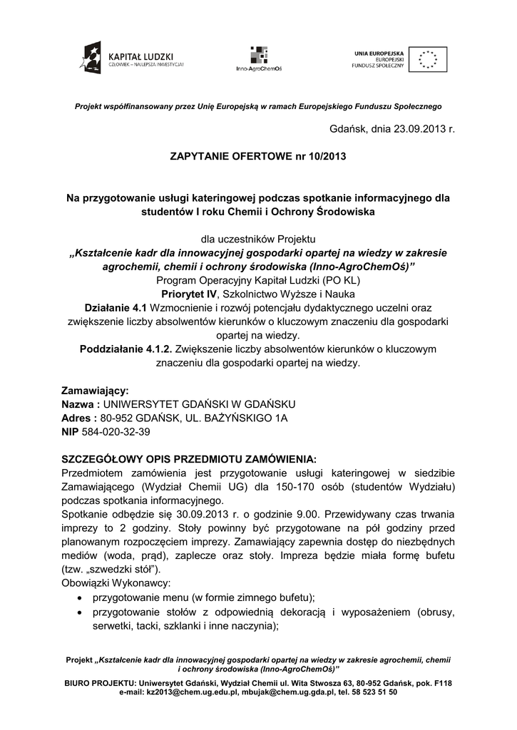 Projekt współfinansowany przez Unię Europejską w ramach Europejskiego Funduszu Społecznego Gdańsk, dnia 23.09.2013 r. ZAPYTANIE OFERTOWE nr 10/2013 Na przygotowanie usługi kateringowej podczas spotkanie informacyjnego dla studentów I roku Chemii i Ochrony Środowiska dla uczestników Projektu „Kształcenie kadr dla innowacyjnej gospodarki opartej na wiedzy w zakresie agrochemii, chemii i ochrony środowiska (Inno-AgroChemOś)” Program Operacyjny Kapitał Ludzki (PO KL) Priorytet IV, Szkolnictwo Wyższe i Nauka Działanie 4.1 Wzmocnienie i rozwój potencjału dydaktycznego uczelni oraz zwiększenie liczby absolwentów kierunków o kluczowym znaczeniu dla gospodarki opartej na wiedzy. Poddziałanie 4.1.2. Zwiększenie liczby absolwentów kierunków o kluczowym znaczeniu dla gospodarki opartej na wiedzy. Zamawiający: Nazwa : UNIWERSYTET GDAŃSKI W GDAŃSKU Adres : 80-952 GDAŃSK, UL. BAŻYŃSKIGO 1A NIP 584-020-32-39 SZCZEGÓŁOWY OPIS PRZEDMIOTU ZAMÓWIENIA: Przedmiotem zamówienia jest przygotowanie usługi kateringowej w siedzibie Zamawiającego (Wydział Chemii UG) dla 150-170 osób (studentów Wydziału) podczas spotkania informacyjnego. Spotkanie odbędzie się 30.09.2013 r. o godzinie 9.00. Przewidywany czas trwania imprezy to 2 godziny. Stoły powinny być przygotowane na pół godziny przed planowanym rozpoczęciem imprezy. Zamawiający zapewnia dostęp do niezbędnych mediów (woda, prąd), zaplecze oraz stoły. Impreza będzie miała formę bufetu (tzw. „szwedzki stół”). Obowiązki Wykonawcy: przygotowanie menu (w formie zimnego bufetu); przygotowanie stołów z odpowiednią dekoracją i wyposażeniem (obrusy, serwetki, tacki, szklanki i inne naczynia); Projekt „Kształcenie kadr dla innowacyjnej gospodarki opartej na wiedzy w zakresie agrochemii, chemii i ochrony środowiska (Inno-AgroChemOś)” BIURO PROJEKTU: Uniwersytet Gdański, Wydział Chemii ul. Wita Stwosza 63, 80-952 Gdańsk, pok. F118 e-mail: [email protected], [email protected], tel. 58 523 51 50 Projekt współfinansowany przez Unię Europejską w ramach Europejskiego Funduszu Społecznego dowóz do Zamawiającego zgodnie ze standardami sanitarnymi dotyczącymi przewozu żywności; zapewnienie personelu do obsługi imprezy; uporządkowanie miejsca po zakończeniu imprezy (usługa sprzątania). Przykładowe menu: 2 rodzaje ciastka na osobę; owoce 300g/os.; woda niegazowana 0,5l/os.; Sok (różne smaki) 0,25;/os. WYMOGI FORMALNE: Oferta powinna zawierać 1) Pełną nazwę oferenta oraz adres lub siedzibę. 2) Dane osoby uprawnionej do kontaktu w imieniu Wykonawcy (imię, nazwisko, telefon, e-mail). 3) Wycenę zamówienia: Oferuję wykonanie przedmiotu zamówienia za: cenę netto ....................................zł. (słownie)......................................................................................................................... ....... podatek VAT (słownie)......................................................................................................................... ....... cenę brutto ...................................zł. (słownie)......................................................................................................................... ....... Sposób i termin złożenia oferty Oferta powinna być sporządzona w języku polskim i podpisana przez osobę upoważnioną. Podpisany skan oferty powinien zostać przesłany na adres: [email protected] Ofertę prosimy złożyć do dnia 27.09.2013 r. Osoba do kontaktu: Michał Bujak, tel. 723 969 508 e-mail: [email protected] Projekt „Kształcenie kadr dla innowacyjnej gospodarki opartej na wiedzy w zakresie agrochemii, chemii i ochrony środowiska (Inno-AgroChemOś)” BIURO PROJEKTU: Uniwersytet Gdański, Wydział Chemii ul. Wita Stwosza 63, 80-952 Gdańsk, pok. F118 e-mail: [email protected], [email protected], tel. 58 523 51 50 Projekt współfinansowany przez Unię Europejską w ramach Europejskiego Funduszu Społecznego Niniejsze zapytanie ofertowe nie jest zamówieniem i otrzymanie od Państwa oferty nie powoduje powstania zobowiązania wobec stron. Zamawiający informuje, że przedmiot niniejszego zapytania będzie współfinansowany przez Unię Europejską ze środków Europejskiego Funduszu Społecznego w ramach Programu Operacyjnego Kapitał Ludzki. Projekt „Kształcenie kadr dla innowacyjnej gospodarki opartej na wiedzy w zakresie agrochemii, chemii i ochrony środowiska (Inno-AgroChemOś)” BIURO PROJEKTU: Uniwersytet Gdański, Wydział Chemii ul. Wita Stwosza 63, 80-952 Gdańsk, pok. F118 e-mail: [email protected], [email protected], tel. 58 523 51 50