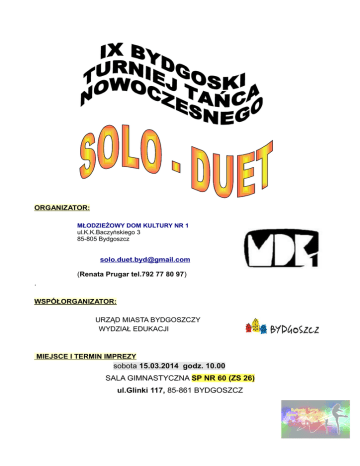 ORGANIZATOR: MŁODZIEŻOWY DOM KULTURY NR 1 ul.K.K.Baczyńskiego 3 85-805 Bydgoszcz tel. /52/ 375 53 49, fax. /52/ 345 06 28 www.mdk1.bydgoszcz.pl e-mail : [email protected] (Renata Prugar tel.792 77 80 97) . WSPÓŁORGANIZATOR: URZĄD MIASTA BYDGOSZCZY WYDZIAŁ EDUKACJI MIEJSCE I TERMIN IMPREZY sobota 15.03.2014 godz. 10.00 SALA GIMNASTYCZNA SP NR 60 (ZS 26) ul.Glinki 117, 85-861 BYDGOSZCZ ORGANIZATOR: Młodzieżowy Dom Kultury nr 1 ul.K.K.Baczyńskiego 3 85-805 Bydgoszcz tel. /52/ 375 53 49, fax. /52/ 345 06 28 www.mdk1.bydgoszcz.pl e-mail : [email protected] (Renata Prugar tel.792 77 80 97) CELE KONKURSU wyzwalanie u dzieci inwencji twórczej podczas występów indywidualnych i grupowych, upowszechnianie amatorskiego ruchu tanecznego, rozwijanie zainteresowań tanecznych jako szczególnego hobby-formy aktywnego wypoczynku, wymiana doświadczeń i pomysłów w prezentacjach własnych, twórcza konfrontacja umiejętności i poziomu tanecznego uczestników, promocja utalentowanych wykonawców, wyłanianie najlepszych zespołów i solistów, popularyzacja różnych technik tanecznych PRZEPISY OGÓLNE: regulamin konkursu jest priorytetem w podejmowaniu oceny jury, a ocena jury jest ostateczna i nie podlega zmianom, zgłoszenia przyjmowane będą do dn. 10.03.2014 r.drogą mailową, fax, listownie, Po tym terminie o wszelkich ewentualnych zmianach proszę informować organizatora na bieżąco TELEFONICZNIE w celu weryfikacji list startowych- co pozwoli na sprawniejszą organizację wpisowe: pierwsze wejście 10 zł od osoby, każde kolejne 10 zł zł za każdą następną konkurencję, akredytację proszę uregulować na konto: RADA RODZICÓW PRZY MDK 1 , ul.Baczyńskiego 3, 85-305 Bydgoszcz 81 1320 1117 2043 5343 2000 0001 l Z DOPISKIEM: TANIEC S-D i wymienić za jakie kategorie państwo regulują akredytację np. 3xS D, 2xD HH, 1x F J, 2x MF HH, itd jedna osoba może brać udział w kilku kategoriach tanecznych, koszty związane z dojazdem i ubezpieczeniem pokrywa instytucja delegująca, potwierdzenie zgłoszenie uczestnika, jego rejestracja i odbiór numerka startowegogodzinę przed rozpoczęciem danej kategorii-PATRZ PROGRAM TURNIEJU scena dla tańczących 6 x 8 m, organizatorzy zapewniają akustyka, sprzęt nagłaśniający, jury, finaliści otrzymują dyplomy (miejsca od I do VI), puchary i medale (miejsca od I do III), w przypadku niskiej frekwencji organizatorzy zastrzegają sobie możliwość łączenia poszczególnych kategorii wszelkie sprawy sporne rozstrzyga sędzia główny turnieju, pytania, ewentualne zmiany rozbieżne z regulaminem należy kierować do organizatorakoordynatora p.RENATY PRUGAR każdy uczestnik powinien posiadać ze sobą legitymację szkolną potwierdzającą wybór kategorii wiekowej. W przypadku wątpliwości jury- ma prawo przenieść tancerza lub zespół do innej kategorii wiekowej lub konkursowej. może też zdyskwalifikować uczestnika i pozbawić go uczestnictwa w dalszej części konkursu jeśli będą ku temu podstawy- np. celowe zaniżenie wieku tancerza!!! O PRZYNALEŻNOŚCI DO DANEJ KATEGORII WIEKOWEJ DECYDUJE w przypadku MINI FORMACJI I FORMACJI 60% ZESPOŁU, w przypadku DUETÓW STARSZY TANCERZ. KATEGORIE WIEKOWE I KONKURSOWE: • • • • • 5-7 lat (roczniki 2009, 2008, 2007) 8-10 lat (roczniki 2006, 2005, 2004) 11-13 lat (roczniki 2003, 2002, 2001) 14-16 lat (roczniki 2000, 1999, 1998) 17 lat i powyżej (1997, 1996, itd) DISCO (dance, dla formacji show) • SOLO 5-7 lat, 8-10 lat, 11-13 lat, 14-16 lat, 17 i i powyżej – • DUETY 5-8 lat, 9-12 lat, 13-16 lat, 17 i powyżej – • MINI-FORMACJE (3-7 os.) do 9 lat, 10-13, 14 i powyżej • FORMACJE (8-24 os.) do 9 lat, 10-13, 14 i powyżej do muz.organizatora 1.00 do muz.organizatora 1.00 do muz własnej do 2.00 do muz własnej do 3,50 JAZZ • • • • SOLO 5-7 lat, 8-10 lat, 11-13 lat, 14-16 lat, 17 i i powyżej – DUETY 5-9 lat, 10-13 lat, 14-16, 17 I powyżej MINI-FORMACJE (3-7 os.) do 9 lat, 10-13 lat, 14 i powyżej FORMACJE (8-24 os.) do 9 lat, 10-13 lat, , 14 i powyżej INNE FORMY • FORMACJE (8-24 os.) do 9 lat, 10-13 lat, , 14 i powyżej do muz.organizatora 1.30 do muz własnej 1.30 do muz własnej do 2.50 do muz własnej do 4.00 do muz własnej do 4.00 HIP-HOP • SOLO 5-7 lat, 8-10 lat, 11-13 lat, 14-16 lat, 17 i i powyżej – • DUETY 6-9 lat, 10-13 lat, 14-16 lat , 17 i powyżej – • MINI-FORMACJE (3-7 os.) do 9 lat, 10-13 lat, 14 i powyżej • FORMACJE (8-24 os.) do 9 lat, 10-13 lat, , 14 i powyżej do muz.organizatora 1.00 do muz.organizatora 1.00 do muz własnej do 2.00 do muz własnej do 3.50 C-WALK • SOLO bez ograniczeń wiekowych do muz organizatora 1.00 PROGRAM TURNIEJU(może ulec drobnym zmianom czasowym!!) • • • • DISCO godz.8.00-9.45 przyjazd i rejestracja uczestników kat DISCO godz.10.00 rozpoczęcie turnieju godz. 10.15-13.00 przesłuchania kategorii DISCO (solo, duety, formacje i mini formacje) godz. 13.00-13.15 OGŁOSZENIE WYNIKÓW, ROZDANIE NAGRÓD I PUCHARÓW ZAKOŃCZENIE KATEGORII DISCO. • • • JAZZ godz.12.00-12.45 przyjazd i rejestracja uczestników kat JAZZ i INNE FORMY godz. 13.15-16.00. przesłuchania kategorii JAZZ, (solo, duety, formacje i mini formacje), INNE godz. 16.00-16.15 OGŁOSZENIE WYNIKÓW, ROZDANIE NAGRÓD I PUCHARÓW – ZAKOŃCZENIE KATEGORII JAZZ I INNE • • • HIP-HOP godz.15.00-15.45 przyjazd i rejestracja uczestników kat HIP-HOP godz. 16.15-19.30 przesłuchania kategorii C-WALK (solo) i HIP-HOP(solo, duety, mini i formacje) godz. 19.30-20.00 OGŁOSZENIE WYNIKÓW, ROZDANIE NAGRÓD I PUCHARÓW – ZAKOŃCZENIE KATEGORII C-WALK I HIP-HOP ŻYCZYMY UDANEJ ZABAWY, ZDROWEJ RYWALIZACJI, ZADOWOLENIA Z PREZENTACJI I SAMYCH PIERWSZYCH MIEJSC!!!!!!!!!!!!!!!!! – ORGANIZATORZY I KOORDYNATOR IMPREZY: MDK 1- RENATA PRUGAR
