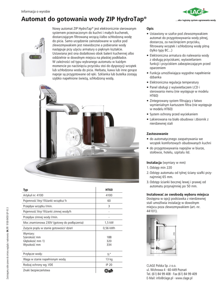 Informacja o wyrobie Automat do gotowania wody ZIP HydroTap® Nowy automat ZIP HydroTap® jest elektronicznie sterowanym systemem przeznaczonym do kuchni i małych kuchenek, dostarczającym filtrowaną wrzącą i/albo schłodzoną wodę do picia. Samo urządzenie zainstalowane w szafce pod zlewozmywakiem jest niewidoczne a pobieranie wody następuje przy użyciu armatury o pięknym kształcie. Ustawiana jest ona dodatkowo obok baterii kuchennej albo oddzielnie w dowolnym miejscu na płaskiej podkładce. W zależności od typu wybranego automatu w każdym momencie po naciśnięciu przycisku stoi do dyspozycji wrzątek lub schłodzona woda do picia. Herbata, kawa lub inne gorące napoje są przygotowane od ręki. Szklanka lub butelka zostają szybko napełnione świeżą, schłodzoną wodą. Opis • Ustawiony w szafce pod zlewozmywakiem automat do przygotowywania wody pitnej, dostarcza, za naciśnięciem przycisku, filtrowany wrzątek i schłodzoną wodę pitną (tylko typy BC...) • Elektroniczna armatura do nalewania wody z obsługą przyciskami, wyświetlaniem funkcji i przyciskiem zabezpieczającym przed oparzeniem • Funkcja umożliwiająca wygodne napełnienie dzbanka • Elektroniczna regulacja temperatury • Panel obsługi z wyświetlaczem LCD i sterowania menu (nie występuje w modelu HT60) • Zintegrowany system filtrujący z łatwo wymienialnym kartuszem filtra (nie występuje w modelu HT60) • System ochrony przed wyciekaniem • Lakierowana na biało obudowa i zbiornik z nierdzewnej stali Typ HT60 Artykuł nr: 4100 4100 Pojemność litry/ filiżanki wrzątku/ h 60 Przepływ wrzątku l/min. 3 Pojemność litry/ filiżanki zimnej wody/h - Przepływ zimnej wody l/min. 1,5 kW 0,56 kWh Wymiary: Szerokość mm Głębokość mm 1) Wysokość mm 188 320 334 Przyłącze wody: ½“ Waga w stanie napełnionym wodą 13 kg Rodzaj ochrony wg. VDE IP 20 Znaki bezpieczeństwa 210 Zużycie prądu w stanie gotowości/ dzień Instalować ze swobodą wyboru miejsca Dostępna w opcji podstawka z nierdzewnej stali umożliwia instalację w dowolnym miejscu poza zlewozmywakiem (art.-nr. 44101). 210 Moc znamionowa 230V (gotowy do podłączenia) Instalacja (wymiary w mm) 1.Odstęp min 220 2.Odstęp automatu od tylnej ściany szafki przynajmniej 65 mm. 3.Odstęp ścianki bocznej lewej i prawej od automatu przynajmniej po 50 mm. 80 Zastrzegamy sobie prawo do zmiany wyglądu i wykonania. 04.11 9100-9459 GP-VS 3 Zastosowanie • do automatycznego zaopatrywania we wrzątek komfortowych obudowanych kuchni • do przygotowywania napojów w biurze, stołówce, hotelu, szpitalu itd. 215 CLAGE Polska Sp. z o.o. ul. Wichrowa 4 · 60-449 Poznań Tel. (61) 84 99 408 · Fax (61) 84 99 409 E-Mail: [email protected] · www.clage.pl Szkic instalacyjny System wody pitnej ZIP HydroTap® Podczas dokonywania wyboru właściwego modelu należy uwzględnić codzienne zapotrzebowanie oraz dostępną powierzchnię w szafce pod specjalną armaturą 69 opcjonalnie wymiennik jonów min. 220 125 208 Średnica otworu do wywiercenia pod armaturę = 35 mm 46 Odstęp od urządzenia z prawej i lewej strony po min 50 mm Wymiary w mm Należy przestrzegać instrukcji montażu i użytkowania. Pytania podczas instalacji? Wsparcie serwisowe: (61) 84 99 408 CLAGE Polska Sp. z o.o. ul. Wichrowa 4 · 60-449 Poznań Tel. (61) 84 99 408 · Fax (61) 84 99 409 E-Mail: [email protected] · www.clage.pl Odstęp urządzenia od tylnej ściany min 65 mm Opcjonalny wymiennik jonów Niefiltrowana woda z instalacji może prowadzić do blokad urządzeń do wrzątku oraz może prowadzic do nieprzyjemnego posmaku gorącego napoju. Problemów tych mozna uniknąć, stosując ten specjalny filtr na przyłączu wody przed automatem do wrzątku. Filtr ESO (nr art. 84493) jest wymiennikiem jonów zmiękczającym wodę, który łączy zmiękczanie wody z jej filtracją oraz regulacją pH. Metoda ta pozwala w niedrogi, kompaktowy i pewny sposób zredukowac twardość wody. Wkłady filtra nie muszą byc regenerowane. Po zużyciu zostają zastąpione nowymi.