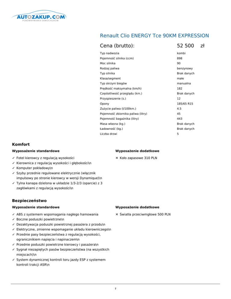 Renault Clio ENERGY Tce 90KM EXPRESSION Cena (brutto): 52 500 Typ nadwozia kombi Pojemność silnika (ccm) 898 Moc silnika 90 Rodzaj paliwa benzynowy Typ silnika Brak danych Klasa/segment małe Typ skrzyni biegów manualna Prędkość maksymalna (km/h) 182 Częstotliwość przeglądu (km.) Brak danych Przyspieszenie (s.) 12 Opony 185/65 R15 Zużycie paliwa (l/100km.) 4.5 Pojemność zbiornika paliwa (litry) 45 Pojemność bagażnika (litry) 443 Masa własna (kg.) Brak danych Ładowność (kg.) Brak danych Liczba drzwi 5 Komfort Wyposażenie standardowe Wyposażenie dodatkowe ✓ Fotel kierowcy z regulacją wysokości ✕ Koło zapasowe 310 PLN ✓ Kierownica z regulacją wysokości i głębokości\n ✓ Komputer pokładowy\n ✓ Szyby przednie regulowane elektrycznie (włącznik impulsowy po stronie kierowcy w wersji Dynamique)\n ✓ Tylna kanapa dzielona w układzie 1/3-2/3 (oparcie) z 3 zagłówkami z regulacją wysokości\n Bezpieczeństwo Wyposażenie standardowe Wyposażenie dodatkowe ✓ ABS z systemem wspomagania nagłego hamowania ✕ Światła przeciwmgłowe 500 PLN ✓ Boczne poduszki powietrzne\n ✓ Dezaktywacja poduszki powietrznej pasażera z przodu\n ✓ Elektryczne, zmienne wspomaganie układu kierowniczego\n ✓ Przednie pasy bezpieczeństwa z regulacją wysokości, ogranicznikiem napięcia i napinaczem\n ✓ Przednie poduszki powietrzne kierowcy i pasażera\n ✓ Sygnał niezapiętych pasów bezpieczeństwa (na wszystkich miejscach)\n ✓ System dynamicznej kontroli toru jazdy ESP z systemem kontroli trakcji ASR\n 1 zł ✓ System mocowania fotelików dla dziecka Isofix na bocznych miejscach z tyłu i miejsca pasażera z przodu (tyłem do kierunku jazdy)\n ✓ System wspomagania ruszania pod górę (Hill Start Assist)\n ✓ Tylne pasy bezpieczeństwa: 3-punktowe, z ogranicznikami napięcia na bocznych miejscach\n ✓ Zagłówki przednie z regulacją wysokości\n Dodatki Wyposażenie standardowe Wyposażenie dodatkowe ✓ Automatyczne włączanie tylnej wycieraczki podczas cofania ✕ Instalacja do montażu alarmu 300 PLN ✓ Autostradowy tryb pracy kierunkowskazów ✕ Kierownica skórzana z elementem ozdobnym w kolorze lśniącej czerni 300 PLN ✓ Boczne listwy ochronne i listwa zderzaka tylnego w kolorze ✕ Lakier metalizowany 1800 PLN czarnym o ziarnistej fakturze ✓ Chromowane wstawki: w górnej, ozdobnej listwie chłodnicy ✕ Lakier metalizowany specjalny 2000 PLN (seryjnie w Expression), w bocznych listwach ochronnych drzwi oraz w listwie tylnego zderzaka ✓ Górna listwa ozdobna chłodnicy w kolorze lśniącej czerni z ✕ Lakier niemetalizowany 0 PLN chromowanym logo Renault ✓ Instalacja do montażu radioodtwarzacza ✕ lakier niemetalizowany specjalny 650 PLN ✓ Karta Renault sterująca centralnym zamkiem i służąca do ✕ Obręcze kół ze stopu metali lekkich 16", wzór Passion uruchamiania auta (zamiast kluczyka) ✓ Lusterka boczne regulowane elektrycznie, podgrzewane, z 1500 PLN ✕ Ozdobne elementy wnętrza w kolorze lśniącej czerni/kości czujnikiem temperatury słoniowej/czerwonym/niebieskim/z motywem Sport/Elegant/Trendy 600 PLN ✓ MEDIA NAV: multimedialny system z ekranem dotykowym ✕ Pakiet look w kolorze lśniącej czerni z elementami 7", nawigacją, radioodtwarzaczem 4x20W, Bluetooth, chromowanymi/czerwonymi/niebieskimi/czarnymi/kości gniazdem USB i jack słoniowej 800 PLN ✓ Obramowania nawiewów w kolorze lśniącej czerni ✕ Wzór felgi 16" Passion kolor czarny/kość słoniowa 200 PLN ✓ Obudowa lusterek bocznych w kolorze nadwozia\n ✓ Osłona przeciwsłoneczna po stronie pasażera bez lusterka\n ✓ Osłona przeciwsłoneczna z zamykanym lusterkiem po stronie kierowcy\n ✓ Przednie zewnętrzne klamki drzwi w kolorze nadwozia\n ✓ Regulator - ogranicznik prędkości\n ✓ Relingi dachowe chromowane\n ✓ Stalowe obręcze kół 15", wzór Caraibes\n ✓ Światła do jazdy dziennej z diodami LED\n ✓ System Renault BASS REFLEX\n ✓ Tapicerka czarno-szara Fortunate\n ✓ Tonacja grafitowa wnętrza\n ✓ Tylne zewnętrzne klamki drzwi ukryte przy tylnym słupku\n ✓ Tylny spoiler dachowy\n ✓ Uchwyt po stronie pasażera z przodu i na dwóch bocznych miejscach z tyłu\n ✓ 2 Wewnętrzne klamki drzwi chromowane\n 3 ✓ Wskaźnik zmiany biegów\n ✓ Wycieraczki przednie o zmiennej częstotliwości pracy\n ✓ Zderzak przedni i tylny w kolorze nadwozia\n ✓ Zespół wskaźników analogowo cyfrowych\n ✓ Zestaw do naprawy opon\n Doprecyzowanie oferty ✕ PAKIET ALIZE - 2200 PLN Klimatyzacja manualna światła przeciwmgłowe ✕ PAKIET ALIZE PLUS - 2800 PLN Klimatyzacja manualna światła przeciwmgłowe System wspomagania parkowania tyłem ✕ PAKIET LOOK TRENDY RED - 1500 PLN Ozdobne elementy wnętrza w kolorze czerwonym pakiet look w kolorze lśniącej czerni z wstawkami czerwonymi wzór felgi 16" Passion kolor czarny ✕ PAKIET LOOK TRENDY RED plus - 1500 PLN ozdobne elementy wnętrza w kolorze czarnym pakiet look w kolorze lśniącej czerni z wstawkami czerwonymi wzór felgi 16" Passion kolor czarny ✕ PAKIET LOOK SPORT - 1500 PLN pakiet look w kolorze lśniącej czerni z wstawkami chromowanymi wewnętrzne elementy ozdobne z motywem Sport wzór felgi 16" Passion kolor czarny ✕ PAKIET LOOK ELEGANT - 1000 PLN ozdobne elementy wnętrza Elegant pakiet look w kolorze lśniącej czerni z wstawkami chromowanymi wzór felgi 16" Passion standard ✕ Pakiet look TRENDY BLUE - 1000 PLN Deska rozdzielcza w kolorze niebieskim Ozdobne elementy wnętrza z motywem trendy pakiet look w kolorze lśniącej czerni z wstawkami chromowanymi 4 wzór felgi 16" Passion standard ✕ PAKIET LOOK IVORY - 1500 PLN Kontakt: Nazwa użytkownika: admin Nazwa firmy: qqq Adres: qqq 12, 41-706 qqq1, NIP: 954 REGON: 1 Telefon: 123, 1 Fax: 1 Email: 1 www: 5