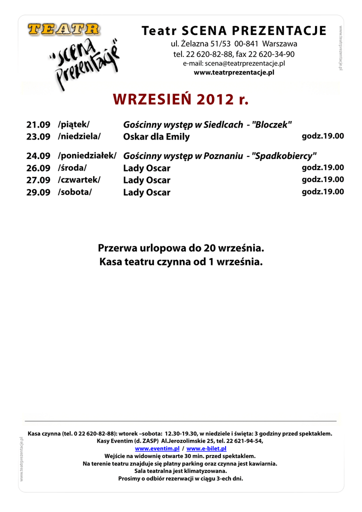 Teatr SCENA PREZENTACJE ul. Żelazna 51/53 00-841 Warszawa tel. 22 620-82-88, fax 22 620-34-90 e-mail: [email protected] www.teatrprezentacje.pl WRZESIEŃ 2012 r. 21.09 /piątek/ 23.09 /niedziela/ 24.09 26.09 27.09 29.09 /poniedziałek/ /środa/ /czwartek/ /sobota/ Gościnny występ w Siedlcach - "Bloczek" Oskar dla Emily godz.19.00 Gościnny występ w Poznaniu - "Spadkobiercy" godz.19.00 godz.19.00 Lady Oscar godz.19.00 Lady Oscar godz.19.00 Lady Oscar Przerwa urlopowa do 20 września. Kasa teatru czynna od 1 września. Kasa czynna (tel. 0 22 620-82-88): wtorek –sobota: 12.30-19.30, w niedziele i święta: 3 godziny przed spektaklem. Kasy Eventim (d. ZASP) Al.Jerozolimskie 25, tel. 22 621-94-54, www.eventim.pl / www.e-bilet.pl Wejście na widownię otwarte 30 min. przed spektaklem. Na terenie teatru znajduje się płatny parking oraz czynna jest kawiarnia. Sala teatralna jest klimatyzowana. Prosimy o odbiór rezerwacji w ciągu 3-ech dni.