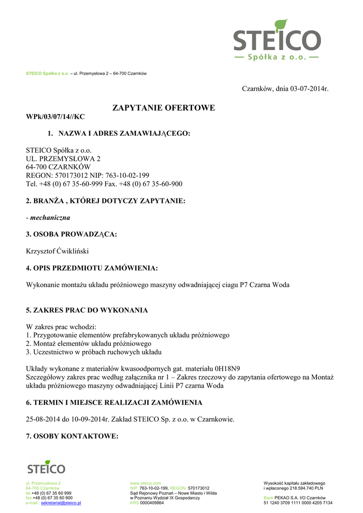 STEICO Spółka z o.o. – ul. Przemysłowa 2 – 64-700 Czarnków Czarnków, dnia 03-07-2014r. ZAPYTANIE OFERTOWE WPk/03/07/14//KC 1. NAZWA I ADRES ZAMAWIAJĄCEGO: STEICO Spółka z o.o. UL. PRZEMYSŁOWA 2 64-700 CZARNKÓW REGON: 570173012 NIP: 763-10-02-199 Tel. +48 (0) 67 35-60-999 Fax. +48 (0) 67 35-60-900 2. BRANśA , KTÓREJ DOTYCZY ZAPYTANIE: - mechaniczna 3. OSOBA PROWADZĄCA: Krzysztof Ćwikliński 4. OPIS PRZEDMIOTU ZAMÓWIENIA: Wykonanie montaŜu układu próŜniowego maszyny odwadniającej ciagu P7 Czarna Woda 5. ZAKRES PRAC DO WYKONANIA W zakres prac wchodzi: 1. Przygotowanie elementów prefabrykowanych układu próŜniowego 2. MontaŜ elementów układu próŜniowego 3. Uczestnictwo w próbach ruchowych układu Układy wykonane z materiałów kwasoodpornych gat. materiału 0H18N9 Szczegółowy zakres prac według załącznika nr 1 – Zakres rzeczowy do zapytania ofertowego na MontaŜ układu próŜniowego maszyny odwadniającej Linii P7 czarna Woda 6. TERMIN I MIEJSCE REALIZACJI ZAMÓWIENIA 25-08-2014 do 10-09-2014r. Zakład STEICO Sp. z o.o. w Czarnkowie. 7. OSOBY KONTAKTOWE: ul. Przemysłowa 2 64-700 Czarnków tel.+48 (0) 67 35 60 999 fax.+48 (0) 67 35 60 900 e-mail : [email protected] www.steico.com NIP :763-10-02-199, REGON :570173012 Sąd Rejonowy Poznań – Nowe Miasto i Wilda w Poznaniu Wydział IX Gospodarczy KRS 0000409864 Wysokość kapitału zakładowego i wpłaconego 218.594.740 PLN Bank PEKAO S.A. I/O Czarnków 51 1240 3709 1111 0000 4205 7134 STEICO Spółka z o.o. – ul. Przemysłowa 2 – 64-700 Czarnków Krzysztof Ćwikliński – sprawy techniczne Tel: +48 (0) 67 35 66 226 Tel. kom.: +48 0 602 723 245 Fax: +48 (0) 67 35 66 357 e-mail: [email protected] Łukasz Nikielski – sprawy merytoryczne Tel. +48 (0) 67 356 63 40 Tel. kom.: +48 0 600 025 254 Fax: +48 (0) 67 356 09 02 e-mail: [email protected] 8. SPOSÓB PRZYGOTOWANIA OFERT. Oferta powinna zawierać: a) krótki opis techniczny, b) harmonogram realizacji zadania, c) Cena powinna zawierać wartość ogólną oferty oraz następujące składniki cenowe: • Wartość elementów prefabrykowanych • Wartość montaŜu układów próŜniowych • Oraz ceny jednostkowe – r-g pracy spawacza, r-g pracy montaŜysty, 9. SPOSÓB ORAZ TERMIN SKŁADANIA OFERT: Termin składania ofert: 11-07-2014r. Sposób składania ofert: - osobiście w dziale WP, - faxem na numer +48 (0) 67 35-66-357 - mailowo na adres [email protected] 10. INFORMACJE DOTYCZĄCE WYBORU NAJKORZYSTNIEJSZEJ OFERTY: - cena: 50% - termin wykonania: 40% - referencje wykonawcy: 10%., 11. UWAGI KOŃCOWE: a. Wykonawca względni utrudnienia wynikające z realizacji zamówienia w czasie prowadzenia procesu w czynnym zakładzie produkcyjnym; b. Wykonawca zrealizuje przedmiot zamówienia zgodnie z zakresem prac (Istotne Warunki Zamówienia) c. Wykonawca musi posiadać ubezpieczenie odpowiedzialności cywilnej z tytułu ul. Przemysłowa 2 64-700 Czarnków tel.+48 (0) 67 35 60 999 fax.+48 (0) 67 35 60 900 e-mail : [email protected] www.steico.com NIP :763-10-02-199, REGON :570173012 Sąd Rejonowy Poznań – Nowe Miasto i Wilda w Poznaniu Wydział IX Gospodarczy KRS 0000409864 Wysokość kapitału zakładowego i wpłaconego 218.594.740 PLN Bank PEKAO S.A. I/O Czarnków 51 1240 3709 1111 0000 4205 7134 STEICO Spółka z o.o. – ul. Przemysłowa 2 – 64-700 Czarnków prowadzonej działalności gospodarczej; d. Steico Sp. z o.o. zastrzega sobie prawo do sprawdzenia kwalifikacji, uprawnień lub badań lekarskich pracowników znajdujących się na terenie Steico przez pracowników działu WP, Kierownika Budowy, Kierownika Koordynatora BHP i PpoŜ.; e. Wykonawca wystawi deklarację zgodności na wykonane przez siebie prace f. Wykonawca zapewnia wszelki sprzęt transportowy g. Dźwig, podnośniki koszowe po stronie Wykonawcy h. Rusztowania winny posiadać wymagane atesty, a uŜytkownicy szkolenia w zakresie ich rozstawiania i odbioru. 12.SPIS ZAŁĄCZNIKÓW: 1. Załącznik nr 1 – Zakres rzeczowy do zapytania nr WPk 03/07/2014 na MontaŜ układu próŜniowego maszyny odwadniającej linii P7 w Czarnej Wodzie 2. Rysunki a. TK-P7-UPN-2014-07-02 . pdf b. TK-P7-UPW-2014-06-30. pdf c. Cyklon Dn=1000 . pdf d. Cyklon Dn=1500 . pdf e. TK-P7-UP- 2014-07-03 Rzut zamaszynowania . pdf ul. Przemysłowa 2 64-700 Czarnków tel.+48 (0) 67 35 60 999 fax.+48 (0) 67 35 60 900 e-mail : [email protected] www.steico.com NIP :763-10-02-199, REGON :570173012 Sąd Rejonowy Poznań – Nowe Miasto i Wilda w Poznaniu Wydział IX Gospodarczy KRS 0000409864 Wysokość kapitału zakładowego i wpłaconego 218.594.740 PLN Bank PEKAO S.A. I/O Czarnków 51 1240 3709 1111 0000 4205 7134