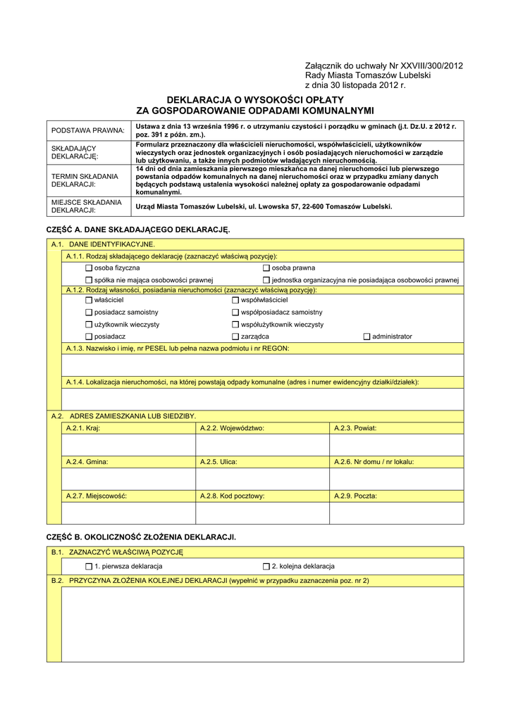 Załącznik do uchwały Nr XXVIII/300/2012 Rady Miasta Tomaszów Lubelski z dnia 30 listopada 2012 r. DEKLARACJA O WYSOKOŚCI OPŁATY ZA GOSPODAROWANIE ODPADAMI KOMUNALNYMI PODSTAWA PRAWNA: SKŁADAJĄCY DEKLARACJĘ: TERMIN SKŁADANIA DEKLARACJI: MIEJSCE SKŁADANIA DEKLARACJI: Ustawa z dnia 13 września 1996 r. o utrzymaniu czystości i porządku w gminach (j.t. Dz.U. z 2012 r. poz. 391 z późn. zm.). Formularz przeznaczony dla właścicieli nieruchomości, współwłaścicieli, użytkowników wieczystych oraz jednostek organizacyjnych i osób posiadających nieruchomości w zarządzie lub użytkowaniu, a także innych podmiotów władających nieruchomością. 14 dni od dnia zamieszkania pierwszego mieszkańca na danej nieruchomości lub pierwszego powstania odpadów komunalnych na danej nieruchomości oraz w przypadku zmiany danych będących podstawą ustalenia wysokości należnej opłaty za gospodarowanie odpadami komunalnymi. Urząd Miasta Tomaszów Lubelski, ul. Lwowska 57, 22-600 Tomaszów Lubelski. CZĘŚĆ A. DANE SKŁADAJĄCEGO DEKLARACJĘ. A.1. DANE IDENTYFIKACYJNE. A.1.1. Rodzaj składającego deklarację (zaznaczyć właściwą pozycję): osoba fizyczna osoba prawna spółka nie mająca osobowości prawnej jednostka organizacyjna nie posiadająca osobowości prawnej A.1.2. Rodzaj własności, posiadania nieruchomości (zaznaczyć właściwą pozycję): właściciel współwłaściciel posiadacz samoistny współposiadacz samoistny użytkownik wieczysty współużytkownik wieczysty posiadacz zarządca administrator A.1.3. Nazwisko i imię, nr PESEL lub pełna nazwa podmiotu i nr REGON: A.1.4. Lokalizacja nieruchomości, na której powstają odpady komunalne (adres i numer ewidencyjny działki/działek): A.2. ADRES ZAMIESZKANIA LUB SIEDZIBY. A.2.1. Kraj: A.2.2. Województwo: A.2.3. Powiat: A.2.4. Gmina: A.2.5. Ulica: A.2.6. Nr domu / nr lokalu: A.2.7. Miejscowość: A.2.8. Kod pocztowy: A.2.9. Poczta: CZĘŚĆ B. OKOLICZNOŚĆ ZŁOŻENIA DEKLARACJI. B.1. ZAZNACZYĆ WŁAŚCIWĄ POZYCJĘ 1. pierwsza deklaracja 2. kolejna deklaracja B.2. PRZYCZYNA ZŁOŻENIA KOLEJNEJ DEKLARACJI (wypełnić w przypadku zaznaczenia poz. nr 2) CZĘŚĆ C. INFORMACJE O SPOSOBIE POSTĘPOWANIA Z ODPADAMI KOMUNALNYMI. C.1. SPOSÓB GROMADZENIA ODPADÓW KOMUNALNYCH (zaznaczyć właściwą pozycję): zmieszany selektywny CZĘŚĆ D. USTALENIE CZYNNIKÓW OPŁATY ZA GOSPODAROWANIE ODPADAMI KOMUNALNYMI. 1. Wyszczególnienie D.1. Liczba osób zamieszkujących nieruchomość. 2. Czynnik opłaty ____________ os. 3. Stawka opłaty _______________ zł 4. Kwota opłaty (kol. 2 x kol. 3) _____________ zł CZĘŚĆ E. PODPIS SKŁADAJĄCEGO / OSOBY REPREZENTUJĄCEJ SKŁADAJĄCEGO. Imię Nazwisko Data wypełnienia (dzień-miesiąc-rok) Podpis (pieczęć) składającego / osoby reprezentującej składającego CZĘŚĆ F. ADNOTACJE URZĘDOWE (wypełnia organ przyjmujący deklarację). F.1. Uwagi F.2. Data i podpis osoby przyjmującej deklarację 1. 2. 3. 4. POUCZENIE: Na podstawie art. 3a Ustawy z dnia 17 czerwca 1996 r. o postępowaniu egzekucyjnym w administracji, niniejsza deklaracja stanowi podstawę do wystawienia tytułu wykonawczego. Zgodnie z uchwałą Rady Miasta Tomaszów Lubelski Nr XXVII/274/2012 z dnia 26 października 2012 roku, w sprawie terminu, częstotliwości i trybu uiszczania opłaty za gospodarowanie odpadami komunalnymi, opłatę należy uiszczać bez wezwania, za dany miesiąc, w terminie do 15-go dnia następnego miesiąca począwszy od 1 lipca 2013 r. w kasie Urzędu Miasta Tomaszów Lubelski lub na rachunek bankowy nr 06 2030 0045 1110 0000 0063 8160 w BGŻ o/o Tomaszów Lubelski. Pierwszą deklarację należy złożyć w terminie 14 dni od dnia wejścia w życie uchwały Rady Miasta Tomaszów Lubelski Nr XXVIII/300/2012 z dnia 30 listopada 2012 roku w sprawie określenia wzoru deklaracji o wysokości opłaty za gospodarowanie odpadami komunalnymi składanej przez właściciela nieruchomości, stanowiącej akt prawa miejscowego, w siedzibie Urzędu Miasta Tomaszów Lubelski, ul. Lwowska 57, 22-600 Tomaszów Lubelski. Nie złożenie niniejszej deklaracji w wymaganym terminie albo uzasadnionych wątpliwości co do danych zawartych w niniejszej deklaracji skutkowało będzie wydaniem decyzji administracyjnej w sprawie ustalenia wysokości opłaty za gospodarowanie odpadami komunalnymi - zgodnie z art. 6o Ustawy o utrzymaniu czystości i porządku w gminach.