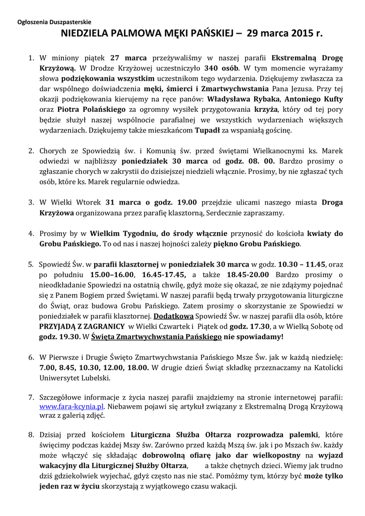 Ogłoszenia Duszpasterskie NIEDZIELA PALMOWA MĘKI PAŃSKIEJ – 29 marca 2015 r. 1. W miniony piątek 27 marca przeżywaliśmy w naszej parafii Ekstremalną Drogę Krzyżową. W Drodze Krzyżowej uczestniczyło 340 osób. W tym momencie wyrażamy słowa podziękowania wszystkim uczestnikom tego wydarzenia. Dziękujemy zwłaszcza za dar wspólnego doświadczenia męki, śmierci i Zmartwychwstania Pana Jezusa. Przy tej okazji podziękowania kierujemy na ręce panów: Władysława Rybaka, Antoniego Kufty oraz Piotra Polańskiego za ogromny wysiłek przygotowania krzyża, który od tej pory będzie służył naszej wspólnocie parafialnej we wszystkich wydarzeniach większych wydarzeniach. Dziękujemy także mieszkańcom Tupadł za wspaniałą gościnę. 2. Chorych ze Spowiedzią św. i Komunią św. przed świętami Wielkanocnymi ks. Marek odwiedzi w najbliższy poniedziałek 30 marca od godz. 08. 00. Bardzo prosimy o zgłaszanie chorych w zakrystii do dzisiejszej niedzieli włącznie. Prosimy, by nie zgłaszać tych osób, które ks. Marek regularnie odwiedza. 3. W Wielki Wtorek 31 marca o godz. 19.00 przejdzie ulicami naszego miasta Droga Krzyżowa organizowana przez parafię klasztorną, Serdecznie zapraszamy. 4. Prosimy by w Wielkim Tygodniu, do środy włącznie przynosić do kościoła kwiaty do Grobu Pańskiego. To od nas i naszej hojności zależy piękno Grobu Pańskiego. 5. Spowiedź Św. w parafii klasztornej w poniedziałek 30 marca w godz. 10.30 – 11.45, oraz po południu 15.00–16.00, 16.45-17.45, a także 18.45-20.00 Bardzo prosimy o nieodkładanie Spowiedzi na ostatnią chwilę, gdyż może się okazać, ze nie zdążymy pojednać się z Panem Bogiem przed Świętami. W naszej parafii będą trwały przygotowania liturgiczne do Świąt, oraz budowa Grobu Pańskiego. Zatem prosimy o skorzystanie ze Spowiedzi w poniedziałek w parafii klasztornej. Dodatkowa Spowiedź Św. w naszej parafii dla osób, które PRZYJADĄ Z ZAGRANICY w Wielki Czwartek i Piątek od godz. 17.30, a w Wielką Sobotę od godz. 19.30. W Święta Zmartwychwstania Pańskiego nie spowiadamy! 6. W Pierwsze i Drugie Święto Zmartwychwstania Pańskiego Msze Św. jak w każdą niedzielę: 7.00, 8.45, 10.30, 12.00, 18.00. W drugie dzień Świąt składkę przeznaczamy na Katolicki Uniwersytet Lubelski. 7. Szczegółowe informacje z życia naszej parafii znajdziemy na stronie internetowej parafii: www.fara-kcynia.pl. Niebawem pojawi się artykuł związany z Ekstremalną Drogą Krzyżową wraz z galerią zdjęć. 8. Dzisiaj przed kościołem Liturgiczna Służba Ołtarza rozprowadza palemki, które święcimy podczas każdej Mszy św. Zarówno przed każdą Mszą św. jak i po Mszach św. każdy może włączyć się składając dobrowolną ofiarę jako dar wielkopostny na wyjazd wakacyjny dla Liturgicznej Służby Ołtarza, a także chętnych dzieci. Wiemy jak trudno dziś gdziekolwiek wyjechać, gdyż często nas nie stać. Pomóżmy tym, którzy być może tylko jeden raz w życiu skorzystają z wyjątkowego czasu wakacji. 9. Dzisiaj możemy poinformować, że wyjazd odbędzie się Śladami Świętego Jana Pawła II tuż po zakończeniu roku szkolnego. Zwiedzimy i zatrzymamy się w takich miejscach jak: Kraków (Barbakan, Sukiennice, Kościół Mariacki oraz Wawel), Łagiewniki (Sanktuarium Miłosierdzia Bożego), Zakopane (kaplica w Jaszczurówce, Krzeptówki, Krupówki, Morskie Oko, Dolina Chochołowska, wieczór góralski), Ludźmierz (czczona Matka Boże Królowa Podhala), Kalwaria Zebrzydowska (zwana „polską Jerozolimą”, będziemy na ścieżkach kalwaryjskich), Wadowice (odwiedzimy Bazylikę w której ochrzczono Karola Wojtyłę, zwiedzimy dom rodzinny – muzeum poświęcone Ojcu Świętemu, oczywiście będzie czas na słynne „kremówki”), Częstochowa – Jasna Góra. Wszelkich informacji na temat wyjazdu udziela ksiądz Marek. Ilość miejsc jest ograniczona. Zapisy przyjmujemy w biurze parafialnym i u księdza Marka. 10. Zmarli: +Stanisław Molenda, +Alicja Babiarz – Wieczny odpoczynek TRIDUUM PASCHALNE Od uroczystego wjazdu Pana Jezusa do Jerozolimy rozpoczynamy czas Wielkiego Tygodnia. Przez ten tydzień chcemy jak najpiękniej przygotować się do Świąt Wielkiej Nocy. Święty czas Triduum Paschalnego: WIELKI CZARTEK – Msza Wieczerzy Pańskiej rozpocznie się o godz. 18.00. To dzień ustanowienia przez Pana Jezusa dwóch sakramentów: Kapłaństwa i Eucharystii. Po Mszy Św. Wieczerzy Pańskiej przeniesienie Najświętszego Sakramentu do kaplicy adoracji – „Ciemnicy”. Adoracja w tym dniu do godz. 21.00 WIELKI PIĄTEK – To dzień śmierci naszego Zbawiciela. W tym dniu jeden raz w roku nie sprawuje się Mszy Św. Liturgię na cześć męki Pańskiej rozpoczniemy o godz. 18.00. Liturgia składa się z czterech części: Liturgii Słowa, Adoracji Krzyża, Komunii Św. i procesji do Grobu Pańskiego. W tym dniu adoracja przy Grobie Pańskim do godz. 21.00 WIELKA SOBOTA – Celebrację Zmartwychwstania Pańskiego, najważniejszą Mszę Św. w ciągu roku rozpoczniemy o godz. 20.00 przepiękną Liturgią Światła, uroczystym zaintonowaniem Orędzia Wielkanocnego. Nastąpi Liturgia Słowa, Liturgia Chrzcielna wraz z odnowieniem przyrzeczeń Chrztu, oraz Liturgia Eucharystyczna, po której ostatnim wydarzeniem będzie PROCESJA REZUREKCYJNA ZMARTWYCHWSTANIA PANA JEZUSA. Adoracja w Wielką Sobotę od godz. 8.00 – 20.00. Strażaków prosimy o czuwanie przy Grobie Pańskim od godz. 17.00 – 20.00. Jednocześnie prosimy, by w czasie procesji rezurekcyjnej Strażacy ponieśli baldachim, a Bracia ze Stowarzyszenia Św. Wojciecha asystowali przy kapłanie w czasie procesji. W Wielką Sobotę przychodzimy do kościoła na wieczorną liturgię ze świecami. W tym dniu o godz. 8.00 poświecenie wody i możliwość zabrania do domów przez cały dzień. Święcenie POTRAW WIELKANOCNYCH w Wielką Sobotę: WIOSKI Ks. Proboszcz – g. 10.00 Zabłocie g. 10.30 Rozstrzębowo g. 11.00 Szczep