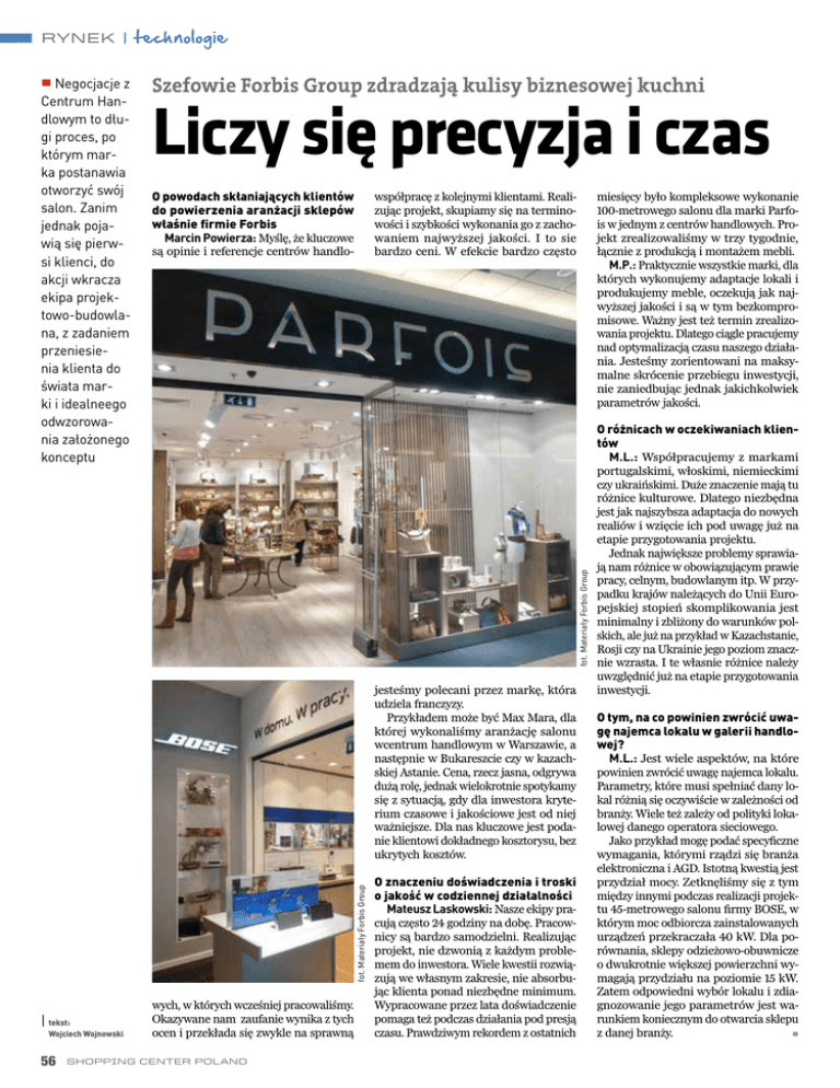 RYNEK | technologie n Negocjacje z Szefowie Forbis Group zdradzają kulisy biznesowej kuchni Liczy się precyzja i czas O powodach skłaniających klientów do powierzenia aranżacji sklepów właśnie firmie Forbis Marcin Powierza: Myślę, że kluczowe są opinie i referencje centrów handlo- współpracę z kolejnymi klientami. Realizując projekt, skupiamy się na terminowości i szybkości wykonania go z zachowaniem najwyższej jakości. I to sie bardzo ceni. W efekcie bardzo często miesięcy było kompleksowe wykonanie 100-metrowego salonu dla marki Parfois w jednym z centrów handlowych. Projekt zrealizowaliśmy w trzy tygodnie, łącznie z produkcją i montażem mebli. M.P.: Praktycznie wszystkie marki, dla których wykonujemy adaptacje lokali i produkujemy meble, oczekują jak najwyższej jakości i są w tym bezkompromisowe. Ważny jest też termin zrealizowania projektu. Dlatego ciągle pracujemy nad optymalizacją czasu naszego działania. Jesteśmy zorientowani na maksymalne skrócenie przebiegu inwestycji, nie zaniedbując jednak jakichkolwiek parametrów jakości. fot. Materiały Forbis Group Centrum Handlowym to długi proces, po którym marka postanawia otworzyć swój salon. Zanim jednak pojawią się pierwsi klienci, do akcji wkracza ekipa projektowo-budowlana, z zadaniem przeniesienia klienta do świata marki i idealneego odwzorowania założonego konceptu fot. Materiały Forbis Group jesteśmy polecani przez markę, która udziela franczyzy. Przykładem może być Max Mara, dla której wykonaliśmy aranżację salonu wcentrum handlowym w Warszawie, a następnie w Bukareszcie czy w kazachskiej Astanie. Cena, rzecz jasna, odgrywa dużą rolę, jednak wielokrotnie spotykamy się z sytuacją, gdy dla inwestora kryterium czasowe i jakościowe jest od niej ważniejsze. Dla nas kluczowe jest podanie klientowi dokładnego kosztorysu, bez ukrytych kosztów. | tekst: Wojciech Wojnowski 56 wych, w których wcześniej pracowaliśmy. Okazywane nam zaufanie wynika z tych ocen i przekłada się zwykle na sprawną Shopping Center Poland O znaczeniu doświadczenia i troski o jakość w codziennej działalności Mateusz Laskowski: Nasze ekipy pracują często 24 godziny na dobę. Pracownicy są bardzo samodzielni. Realizując projekt, nie dzwonią z każdym problemem do inwestora. Wiele kwestii rozwiązują we własnym zakresie, nie absorbując klienta ponad niezbędne minimum. Wypracowane przez lata doświadczenie pomaga też podczas działania pod presją czasu. Prawdziwym rekordem z ostatnich O różnicach w oczekiwaniach klientów M.L.: Współpracujemy z markami portugalskimi, włoskimi, niemieckimi czy ukraińskimi. Duże znaczenie mają tu różnice kulturowe. Dlatego niezbędna jest jak najszybsza adaptacja do nowych realiów i wzięcie ich pod uwagę już na etapie przygotowania projektu. Jednak największe problemy sprawiają nam różnice w obowiązującym prawie pracy, celnym, budowlanym itp. W przypadku krajów należących do Unii Europejskiej stopień skomplikowania jest minimalny i zbliżony do warunków polskich, ale już na przykład w Kazachstanie, Rosji czy na Ukrainie jego poziom znacznie wzrasta. I te własnie różnice należy uwzględnić już na etapie przygotowania inwestycji. O tym, na co powinien zwrócić uwagę najemca lokalu w galerii handlowej? M.L.: Jest wiele aspektów, na które powinien zwrócić uwagę najemca lokalu. Parametry, które musi spełniać dany lokal różnią się oczywiście w zależności od branży. Wiele też zależy od polityki lokalowej danego operatora sieciowego. Jako przykład mogę podać specyficzne wymagania, którymi rządzi się branża elektroniczna i AGD. Istotną kwestią jest przydział mocy. Zetknęliśmy się z tym między innymi podczas realizacji projektu 45-metrowego salonu firmy BOSE, w którym moc odbiorcza zainstalowanych urządzeń przekraczała 40 kW. Dla porównania, sklepy odzieżowo-obuwnicze o dwukrotnie większej powierzchni wymagają przydziału na poziomie 15 kW. Zatem odpowiedni wybór lokalu i zdiagnozowanie jego parametrów jest warunkiem koniecznym do otwarcia sklepu z danej branży. n