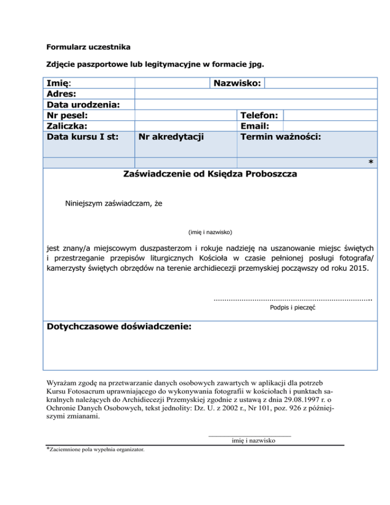 Formularz uczestnika Zdjęcie paszportowe lub legitymacyjne w formacie jpg. Imię: Adres: Data urodzenia: Nr pesel: Zaliczka: Data kursu I st: Nazwisko: Telefon: Email: Termin ważności: Nr akredytacji * Zaświadczenie od Księdza Proboszcza Niniejszym zaświadczam, że (imię i nazwisko) jest znany/a miejscowym duszpasterzom i rokuje nadzieję na uszanowanie miejsc świętych i przestrzeganie przepisów liturgicznych Kościoła w czasie pełnionej posługi fotografa/ kamerzysty świętych obrzędów na terenie archidiecezji przemyskiej począwszy od roku 2015. ……………………………………………………………….. Podpis i pieczęć Dotychczasowe doświadczenie: Wyrażam zgodę na przetwarzanie danych osobowych zawartych w aplikacji dla potrzeb Kursu Fotosacrum uprawniającego do wykonywania fotografii w kościołach i punktach sakralnych należących do Archidiecezji Przemyskiej zgodnie z ustawą z dnia 29.08.1997 r. o Ochronie Danych Osobowych, tekst jednolity: Dz. U. z 2002 r., Nr 101, poz. 926 z późniejszymi zmianami. _____________________ imię i nazwisko *Zaciemnione pola wypełnia organizator.
