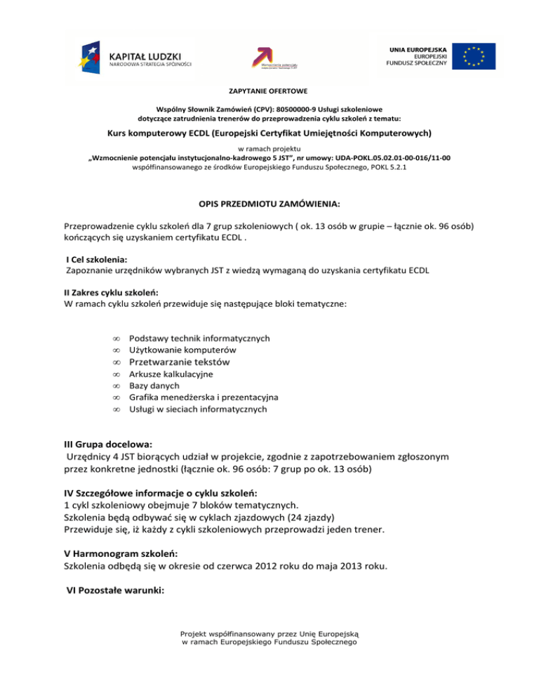 ZAPYTANIE OFERTOWE Wspólny Słownik Zamówień (CPV): 80500000-9 Usługi szkoleniowe dotyczące zatrudnienia trenerów do przeprowadzenia cyklu szkoleń z tematu: Kurs komputerowy ECDL (Europejski Certyfikat Umiejętności Komputerowych) w ramach projektu „Wzmocnienie potencjału instytucjonalno-kadrowego 5 JST”, nr umowy: UDA-POKL.05.02.01-00-016/11-00 współfinansowanego ze środków Europejskiego Funduszu Społecznego, POKL 5.2.1 OPIS PRZEDMIOTU ZAMÓWIENIA: Przeprowadzenie cyklu szkoleń dla 7 grup szkoleniowych ( ok. 13 osób w grupie – łącznie ok. 96 osób) kończących się uzyskaniem certyfikatu ECDL . I Cel szkolenia: Zapoznanie urzędników wybranych JST z wiedzą wymaganą do uzyskania certyfikatu ECDL II Zakres cyklu szkoleń: W ramach cyklu szkoleń przewiduje się następujące bloki tematyczne: • • • • • • • Podstawy technik informatycznych Użytkowanie komputerów Przetwarzanie tekstów Arkusze kalkulacyjne Bazy danych Grafika menedżerska i prezentacyjna Usługi w sieciach informatycznych III Grupa docelowa: Urzędnicy 4 JST biorących udział w projekcie, zgodnie z zapotrzebowaniem zgłoszonym przez konkretne jednostki (łącznie ok. 96 osób: 7 grup po ok. 13 osób) IV Szczegółowe informacje o cyklu szkoleń: 1 cykl szkoleniowy obejmuje 7 bloków tematycznych. Szkolenia będą odbywać się w cyklach zjazdowych (24 zjazdy) Przewiduje się, iż każdy z cykli szkoleniowych przeprowadzi jeden trener. V Harmonogram szkoleń: Szkolenia odbędą się w okresie od czerwca 2012 roku do maja 2013 roku. VI Pozostałe warunki: Projekt współfinansowany przez Unię Europejską w ramach Europejskiego Funduszu Społecznego 1) Z wyłonionymi trenerami zostaną podjęte osobne negocjacje na przygotowanie materiałów szkoleniowych, na podstawie których zostanie przeprowadzony cały cykl szkoleń „Europejski Certyfikat Umiejętności Komputerowych” 2) Na materiały szkoleniowe będą się składały: podręcznik scenariusz, program, prezentacja *ppt, komplet ćwiczeń, test • • I. trenerzy będą zobowiązani w umowie do przedkładania dokumentacji wymaganej przez MAiC, spisanej w zasadach finansowania i kwalifikowania kosztów w ramach POKL (karty pracy, oświadczenia i informacje na temat zaangażowania czasowego we wszystkich projektach finansowanych ze środków unijnych). Wzory ww. dokumentów dostarczy Zamawiający. jeżeli ofertę składa firma w imieniu swoich trenerów, wówczas każdy z trenerów powinien wypełnić oddzielny formularz. Każdy z trenerów będzie oceniany indywidualnie, bez względu na ilość trenerów zgłoszonych przez firmę. W przypadku wyboru trenera reprezentującego firmę, umowa może zostać podpisana z firmą, ale ze wskazaniem danego trenera do wykonania zlecenia; Kryterium wyboru ofert: Kryterium wyboru ofert będzie: 1) WIEDZA I DOŚWIADCZENIE (30% punktów) a) WIEDZA W przypadku zadeklarowania przeprowadzenia wszystkich bloków tematycznych wiedza z zakresu objętego Zapytaniem ofertowym, zgodnie z punktem II. Zakres cyklu szkoleń, (wykształcenie przedmiotowe (studia), studia podyplomowe, kursy o czasie trwania nie krótszym niż 30 godz. zajęć dydaktycznych; praca zawodowa – nie krócej niż 2 lata W przypadku zadeklarowania przeprowadzenia wybranych bloków tematycznych - wiedza z zakresu objętego Zapytaniem ofertowym, zgodnie z zadeklarowanym w Formularzu oferty blokiem tematycznym z punktu II. Zakres cyklu szkoleń (wykształcenie przedmiotowe (studia), studia podyplomowe, kursy o czasie trwania nie krótszym niż 30 godz. zajęć dydaktycznych; praca zawodowa – nie krócej niż 2 lata b) DOŚWIADCZENIE W przypadku zadeklarowania przeprowadzenia wszystkich bloków tematycznych doświadczenie z maksymalnie ostatnich 5 lat w prowadzeniu szkoleń z zakresu objętego Zapytaniem ofertowym, zgodnie z punktem II. Zakres cyklu szkoleń W przypadku zadeklarowania przeprowadzenia wybranych bloków tematycznych Projekt współfinansowany przez Unię Europejską w ramach Europejskiego Funduszu Społecznego doświadczenie z maksymalnie ostatnich 5 lat w prowadzeniu szkoleń z zakresu objętego Zapytaniem ofertowym, zgodnie z zadeklarowanym w Formularzu oferty blokiem tematycznym z punktu II. Zakres cyklu szkoleń. UWAGA! Jeżeli tytuł wykazanego szkolenia nie będzie jednoznacznie wskazywał na zakres tematyczny z zapytania ofertowego, proszę wpisać dodatkowo główne zagadnienia, których dotyczyło szkolenie. c) doświadczenie z maksymalnie ostatnich 5 lat w prowadzeniu szkoleń dla pracowników administracji publicznej szczebla centralnego lub regionalnego d) doświadczenie w prowadzeniu szkoleń w projektach współfinansowanych z Europejskiego Funduszu Społecznego (EFS) − punkty od b) do d) – za dołączenie rekomendacji przewidziane są dodatkowe punkty, przy czym punktowane będą wyłącznie rekomendacje imienne, z których jednoznacznie wynika liczba przeprowadzonych szkoleń wskazana w formularzu ofertowym (rekomendacje wystawione na firmę, bez wskazania trenera prowadzącego nie będą podlegały ocenie; dopuszczalne jest dołączenie oświadczenia firmy, w którym wskazuje się, którzy trenerzy prowadzili szkolenie objęte referencjami) 2) CENA (70% punktów) − kwota wynagrodzenia brutto za jeden dzień szkoleniowy (8 godzin lekcyjnych). Dojazd na miejsce szkolenia oraz zakwaterowanie – jeśli dotyczy – trener jest zobowiązany zorganizować i sfinansować we własnym zakresie. Zamawiający zapewnia lunch oraz przerwy kawowe podczas szkolenia. II. Sposób przyznawania punktacji za spełnienie danego kryterium stanowi załącznik nr 6 do niniejszego Zapytania ofertowego. III. Zamawiający dopuszcza składanie ofert wariantowych (na prowadzenie poszczególnych bloków tematycznych) IV. W przypadku rozszerzenia zapytania o nowe kryterium, wszyscy Oferenci zostaną poproszeni o uzupełnienie ofert. V. Jeżeli nadesłane Oferty przekroczą kwoty założone na wynagrodzenie dla treneró