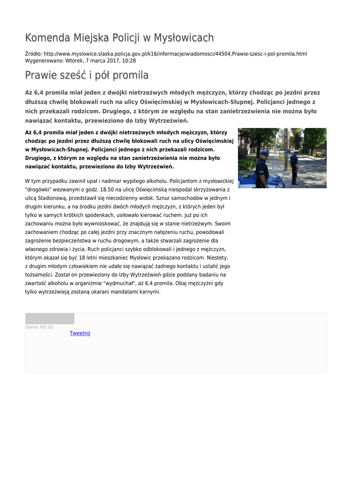 Komenda Miejska Policji w Mysłowicach Źródło: http://www.myslowice.slaska.policja.gov.pl/k16/informacje/wiadomosci/44504,Prawie-szesc-i-pol-promila.html Wygenerowano: Wtorek, 7 marca 2017, 10:28 Prawie sześć i pół promila Aż 6,4 promila miał jeden z dwójki nietrzeżwych młodych mężczyzn, którzy chodząc po jezdni przez dłuższą chwilę blokowali ruch na ulicy Oświęcimskiej w Mysłowicach-Słupnej. Policjanci jednego z nich przekazali rodzicom. Drugiego, z którym ze względu na stan zanietrzeżwienia nie można było nawiązać kontaktu, przewieziono do Izby Wytrzeżwień. Aż 6,4 promila miał jeden z dwójki nietrzeżwych młodych mężczyzn, którzy chodząc po jezdni przez dłuższą chwilę blokowali ruch na ulicy Oświęcimskiej w Mysłowicach-Słupnej. Policjanci jednego z nich przekazali rodzicom. Drugiego, z którym ze względu na stan zanietrzeżwienia nie można było nawiązać kontaktu, przewieziono do Izby Wytrzeżwień. W tym przypadku zawinił upał i nadmiar wypitego alkoholu. Policjantom z mysłowickiej "drogówki" wezwanym o godz. 18.50 na ulicę Oświęcimską nieopodal skrzyżowania z ulicą Stadionową, przedstawił się niecodzienny widok. Sznur samochodów w jednym i drugim kierunku, a na środku jezdni dwóch młodych mężczyzn, z których jeden był tylko w samych krótkich spodenkach, usiłowało kierować ruchem. Już po ich zachowaniu można było wywnioskować, że znajdują się w stanie nietrzeżwym. Swoim zachowaniem chodząc po całej jezdni przy znacznym natężeniu ruchu, powodowali zagrożenie bezpieczeństwa w ruchu drogowym, a także stwarzali zagrożenie dla własnego zdrowia i życia. Ruch policjanci szybko odblokowali i jednego z mężczyzn, którym okazał się być 18 letni mieszkaniec Mysłowic przekazano rodzicom. Niestety, z drugim młodym człowiekiem nie udało się nawiązać żadnego kontaktu i ustalić jego tożsamości. Został on przewieziony do Izby Wytrzeżwień gdzie poddany badaniu na zwartość alkoholu w organiżmie "wydmuchał", aż 6,4 promila. Obaj mężczyżni gdy tylko wytrzeżwieją zostaną ukarani mandatami karnymi. Ocena: 0/5 (0) Tweetnij