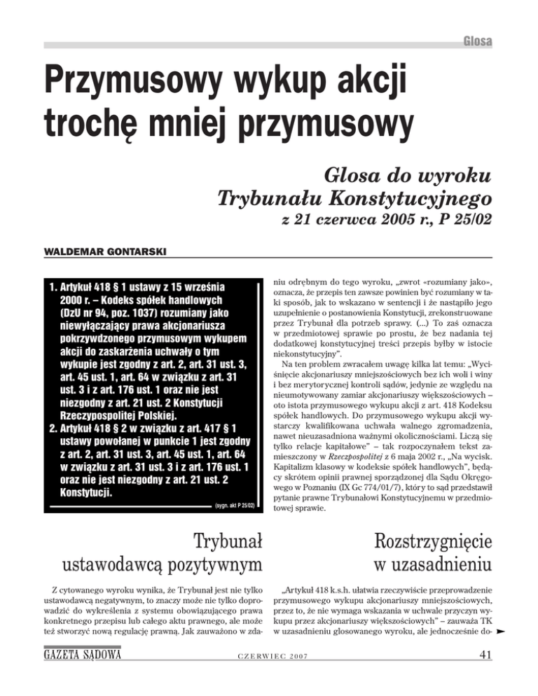 Glosa Przymusowy wykup akcji trochę mniej przymusowy Glosa do wyroku Trybunału Konstytucyjnego z 21 czerwca 2005 r., P 25/02 WALDEMAR GONTARSKI 1. Artykuł 418 § 1 ustawy z 15 września 2000 r. – Kodeks spółek handlowych (DzU nr 94, poz. 1037) rozumiany jako niewyłączający prawa akcjonariusza pokrzywdzonego przymusowym wykupem akcji do zaskarżenia uchwały o tym wykupie jest zgodny z art. 2, art. 31 ust. 3, art. 45 ust. 1, art. 64 w związku z art. 31 ust. 3 i z art. 176 ust. 1 oraz nie jest niezgodny z art. 21 ust. 2 Konstytucji Rzeczypospolitej Polskiej. 2. Artykuł 418 § 2 w związku z art. 417 § 1 ustawy powołanej w punkcie 1 jest zgodny z art. 2, art. 31 ust. 3, art. 45 ust. 1, art. 64 w związku z art. 31 ust. 3 i z art. 176 ust. 1 oraz nie jest niezgodny z art. 21 ust. 2 Konstytucji. (sygn. akt P 25/02) niu odrębnym do tego wyroku, „zwrot «rozumiany jako», oznacza, że przepis ten zawsze powinien być rozumiany w ta− ki sposób, jak to wskazano w sentencji i że nastąpiło jego uzupełnienie o postanowienia Konstytucji, zrekonstruowane przez Trybunał dla potrzeb sprawy. (...) To zaś oznacza w przedmiotowej sprawie po prostu, że bez nadania tej dodatkowej konstytucyjnej treści przepis byłby w istocie niekonstytucyjny”. Na ten problem zwracałem uwagę kilka lat temu: „Wyci− śnięcie akcjonariuszy mniejszościowych bez ich woli i winy i bez merytorycznej kontroli sądów, jedynie ze względu na nieumotywowany zamiar akcjonariuszy większościowych – oto istota przymusowego wykupu akcji z art. 418 Kodeksu spółek handlowych. Do przymusowego wykupu akcji wy− starczy kwalifikowana uchwała walnego zgromadzenia, nawet nieuzasadniona ważnymi okolicznościami. Liczą się tylko relacje kapitałowe” – tak rozpoczynałem tekst za− mieszczony w Rzeczpospolitej z 6 maja 2002 r., „Na wycisk. Kapitalizm klasowy w kodeksie spółek handlowych”, będą− cy skrótem opinii prawnej sporządzonej dla Sądu Okręgo− wego w Poznaniu (IX Gc 774/01/7), który to sąd przedstawił pytanie prawne Trybunałowi Konstytucyjnemu w przedmio− towej sprawie. Trybunał ustawodawcą pozytywnym Rozstrzygnięcie w uzasadnieniu Z cytowanego wyroku wynika, że Trybunał jest nie tylko ustawodawcą negatywnym, to znaczy może nie tylko dopro− wadzić do wykreślenia z systemu obowiązującego prawa konkretnego przepisu lub całego aktu prawnego, ale może też stworzyć nową regulację prawną. Jak zauważono w zda− „Artykuł 418 k.s.h. ułatwia rzeczywiście przeprowadzenie przymusowego wykupu akcjonariuszy mniejszościowych, przez to, że nie wymaga wskazania w uchwale przyczyn wy− kupu przez akcjonariuszy większościowych” – zauważa TK w uzasadnieniu glosowanego wyroku, ale jednocześnie do− C Z E RW I E C 2 0 0 7 41 Glosa daje: „Taka regulacja nie oznacza jednak pozbawienia akcjo− nariuszy mniejszościowych prawa do ochrony sądowej, a co najistotniejsze do podnoszenia zarzutów pokrzywdzenia akcjonariuszy mniejszościowych lub nadużycia prawa przez akcjonariuszy większościo− wych”. Następnie Trybunał Konstytucyjny wyjaśnia, że uchwała o przymusowym wykupie akcji musi wskazy− wać przesłanki usprawiedli− wiające jej powzięcie działa− niami akcjonariuszy mniej− szościowych stanowiącymi realne zagrożenie dla inte− resów spółki. Mało tego, w uzasadnie− niu wyroku TK formułuje owe przesłanki: „...nie dzia− łanie prewencyjne, nie sam zamiar, najczęściej – prze− widywany, akcjonariuszy mniejszościowych, ale fak− tyczne działania utrudnia− jące lub uniemożliwiające funkcjonowanie spółki lub zmierzające do znacznego obniżenia poziomu ochro− ny interesów spółki mogą być tym kryterium powzię− cia takiej uchwały”. Według Trybunału Kon− stytucyjnego „uchwała ma− jąca na celu pokrzywdzenie akcjonariusza oznacza za− równo sytuację, gdy cel pokrzywdzenia akcjonariusza istnie− je w trakcie podejmowania uchwały, jak również sytuację, w której pokrzywdzenie akcjonariusza nie jest zakładane w chwili podejmowania uchwały, jednak treść uchwały jest taka, że jej wykonanie doprowadziło do jego pokrzywdzenia”. Stąd biorą się istotne problemy ze stosowaniem tego wyro− ku w praktyce gospodarczej. Dotychczas Trybunał Konstytucyjny powściągliwie wy− powiadał się odnośnie zakresu przedmiotowego swojej wy− kładni prawotwórczej doko− nywanej w ramach tzw. wy− roków interpretacyjnych: „W sytuacji niejednoznacz− nego brzemienia przepisu, kiedy wykładnia języko− wa może prowadzić do roz− bieżnych wniosków, ko− nieczne jest poszukiwa− nie interpretacji, która po− zwoli na uzgodnienie tre− ści przepisu z konstytu− cją” – uzasadnienie wyro− ku TK z 5 sierpnia 2000 r., SK 22/99. W przypadku treści art. 418 k.s.h. jednoznacznie można stwierdzić, że w przepisach w nim zawar− tych nie sformułowano przesłanek materialno− −prawnych warunkujących podjęcie uchwały o przy− musowym wykupie akcji i przepisy te nie wymagają nawet uzasadnienia uchwa− ły. W razie powstania na tle art. 418 k.s.h. sporu sądo− wego, sąd nie ma więc cze− go kontrolować. Tymcza− sem istota prawa do sądu (art. 45 ust. 1 Konstytucji) polega nie tylko na formalnym potwierdzeniu w ustawie tego prawa, ale na takich materialnych gwarancjach ustawowych, aby ist− niała realna szansa uzyskania korzystnego rozstrzygnięcia są− dowego, na co zwracał uwagę TK we wcześniejszym orzecz− nictwie, np. w wyroku z 17 października 2000 r., SK 5/99. Zakres wykładni prawotwórczej Jak wynika z cytowanych powyżej fragmentów uzasadnie− nia wyroku, działalność prawotwórcza Trybunału Konstytu− cyjnego polega tutaj nie tylko na stworzeniu w samym wyro− ku (czyli w sentencji) nowej normy prawnej. Istotne elemen− ty tej normy, odnośnie przesłanek materialnoprawnych uchwały o przymusowym wykupie akcji, zawarte są też w u