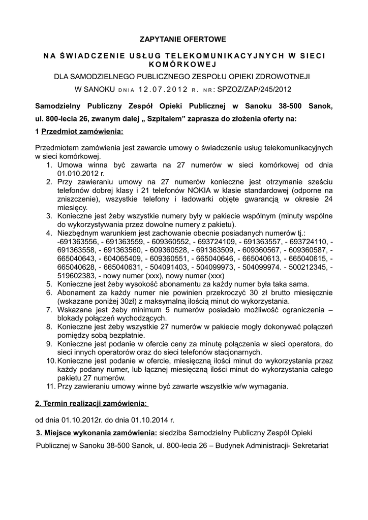 ZAPYTANIE OFERTOWE N A ŚWI AD C ZEN IE U SŁU G TE LEK OMU N IK AC YJ N YC H W SIEC I KOMÓRKOWEJ DLA SAMODZIELNEGO PUBLICZNEGO ZESPOŁU OPIEKI ZDROWOTNEJI W SANOKU DNIA 12.07.2012 R. NR: SPZOZ/ZAP/245/2012 Samodzielny Publiczny Zespół Opieki Publicznej w Sanoku 38-500 Sanok, ul. 800-lecia 26, zwanym dalej „ Szpitalem” zaprasza do złożenia oferty na: 1 Przedmiot zamówienia: Przedmiotem zamówienia jest zawarcie umowy o świadczenie usług telekomunikacyjnych w sieci komórkowej. 1. Umowa winna być zawarta na 27 numerów w sieci komórkowej od dnia 01.010.2012 r. 2. Przy zawieraniu umowy na 27 numerów konieczne jest otrzymanie sześciu telefonów dobrej klasy i 21 telefonów NOKIA w klasie standardowej (odporne na zniszczenie), wszystkie telefony i ładowarki objęte gwarancją w okresie 24 miesięcy. 3. Konieczne jest żeby wszystkie numery były w pakiecie wspólnym (minuty wspólne do wykorzystywania przez dowolne numery z pakietu). 4. Niezbędnym warunkiem jest zachowanie obecnie posiadanych numerów tj.: -691363556, - 691363559, - 609360552, - 693724109, - 691363557, - 693724110, 691363558, - 691363560, - 609360528, - 691363509, - 609360567, - 609360587, 665040643, - 604065409, - 609360551, - 665040646, - 665040613, - 665040615, 665040628, - 665040631, - 504091403, - 504099973, - 504099974. - 500212345, 519602383, - nowy numer (xxx), nowy numer (xxx) 5. Konieczne jest żeby wysokość abonamentu za każdy numer była taka sama. 6. Abonament za każdy numer nie powinien przekroczyć 30 zł brutto miesięcznie (wskazane poniżej 30zł) z maksymalną ilością minut do wykorzystania. 7. Wskazane jest żeby minimum 5 numerów posiadało możliwość ograniczenia – blokady połączeń wychodzących. 8. Konieczne jest żeby wszystkie 27 numerów w pakiecie mogły dokonywać połączeń pomiędzy sobą bezpłatnie. 9. Konieczne jest podanie w ofercie ceny za minutę połączenia w sieci operatora, do sieci innych operatorów oraz do sieci telefonów stacjonarnych. 10. Konieczne jest podanie w ofercie, miesięczną ilości minut do wykorzystania przez każdy podany numer, lub łącznej miesięczną ilości minut do wykorzystania całego pakietu 27 numerów. 11. Przy zawieraniu umowy winne być zawarte wszystkie w/w wymagania. 2. Termin realizacji zamówienia: od dnia 01.10.2012r. do dnia 01.10.2014 r. 3. Miejsce wykonania zamówienia: siedziba Samodzielny Publiczny Zespół Opieki Publicznej w Sanoku 38-500 Sanok, ul. 800-lecia 26 – Budynek Administracji- Sekretariat 4. Miejsce i termin złożenia oferty: Sekretariat Samodzielny Publiczny Zespół Opieki Publicznej w Sanoku 38-500 Sanok, ul. 800-lecia 26 Termin złożenia oferty: do dnia 19.07.2012 r. do godz. 14:00. Termin otwarcia ofert: 19.07.2012 r. o godz. 14:15 w Dziale Zamówień Publicznych Samodzielny Publiczny Zespół Opieki Publicznej w Sanoku 38-500 Sanok, ul. Konarskiego 8, pok. Nr 3. 5. Warunki płatności: 30 dni licząc od dnia otrzymania prawidłowej faktury VAT. 6. Kryterium wyboru najkorzystniejszej oferty: najniższa cena (waga kryterium – 100% cena) 7. Osoby upoważnione do kontaktu z wykonawcami: w sprawach merytorycznych – Józef Wojtowicz tel. 501 590 587 w sprawach formalnych(proceduralnych) – Krystian Skoczyński, Dział Zamówień Publicznych, tel. 013 46 56 290 8. Termin związania ofertą (ważność oferty) wynosi: 30 dni od dnia otwarcia ofert. 9. Sposób złożenia oferty: Ofertę należy sporządzić w języku polskim w formie pisemnej zwykłej i złożyć w Sekretariacie Samodzielny Publiczny Zespół Opieki Publicznej w Sanoku 38-500 Sanok, ul. 800-lecia 26, Minimalna treść oferty: Zalecany wzór oferty zawiera załącznik nr 1 do niniejszego zapytania ofertowego, przy czym w razie składania oferty na własnym wzorcu należy w niej uwzględnić, co najmniej: Identyfikacja: 1. nazwa wykonawcy ………...................................…………………….., 2. adres siedziby ………......................................................……………, 3.NIP …………..................................................................……………., 4. KRS/EDG ….........................................……………………….………, 5. nr r-ku bankowego ………..........................................................……, 6. tel./ fax............................................................................................., 7. osoba upoważniona do kontaktów...................................................., Cena: Oferuję wykonanie przedmiotu zamówienia za: Cenę netto..................... zł (słownie złotych …………………………………………) / jeśli przewidziano - Podatek VAT........................................................................ zł (słownie złotych ………………………………………..........................…………….) Cenę brutto..................... zł (słownie złotych………………………………………….) Oświadczenia dodatkowe: 1. Oświadczam, że zapoznałem się z opisem przedmiotu zamówienia i nie wnoszę do niego zastrzeżeń. 2. Potwierdzam termin realizacji zamówienia od dnia 01.10.2012r. do 01.10.2014 r. 3. Wyrażam zgodę na warunki płatności określone w zapytaniu ofertowym. 4. Oferuję gwarancję na okres obowiązywania umowy. 5.Okres związania ofertą do dnia………………… Niniejszym oświadczam, że oferta ta jest ważna Oferta winna być podpisana przez osobę/ osoby uprawnione do reprezentacji podmiotu (w załączeniu KRS/ EDG lub / oraz pełnomocnictwo) Załączniki: Załącznik nr 1 – Wzór oferty (formularz ofertowy) Załączniki nr 2 – Przedmiot zamówienia i opis warunków