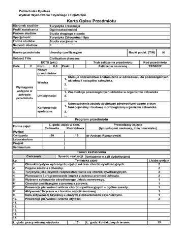 Politechnika Opolska Wydział Wychowania Fizycznego i Fizjoterapii Karta Opisu Przedmiotu Kierunek studiów Profil kształcenia Poziom studiów Specjalność Forma studiów Semestr studiów Turystyka i rekreacja Ogólnoakademicki Studia drugiego stopnia Turystyka Zdrowotna i Spa Studia stacjonarne II Nazwa przedmiotu choroby cywilizacyjne Subject Title Całk. 2 Wymagania wstępne w zakresie przedmiotu Nauki podst. (T/N) N Civilization diseases ECTS (pkt.) Tryb zaliczenia przedmiotu Kod przedmiotu Kont. 0,6 Prakt. Zaliczenie na ocenę TRS0022 Nazwy przedmiotów Stosuje nazewnictwo anatomiczne w odniesieniu do poszczególnych 1. układów i narządów człowieka. Wiedza 2. … 1. Zna funkcje poszczególnych układów w organizmie człowieka Umiejętności 2. … Upowszechnia zasady zachowań zdrowotnych oparte o stan 1. funkocjonalny i budowę morfologiczną organizmu człowieka. Kompetencje społeczne 2. … Program przedmiotu Forma zajęć Wykład Ćwiczenia Laboratorium Projekt Seminarium L. godz. zajęć w sem. Prowadzący zajęcia Całkowita Kontaktowa (tytuł/stopień naukowy, imię i nazwisko) | 30 15 dr Andrzej Romanowski | | | | Treści kształcenia Ćwiczenia Lp. 1. 2. 3. 4. 5. 6. 7. 8. 9. 10. 11. 12. 13. 14. 15. Sposób realizacji ćwiczenia w sali dydaktycznej Tematyka zajęć Charakterystyka wybranych pojęć z zakresu chorób cywilizacyjnych. Pojęcie zdrowia i choroby. Turystyka jako czynnik rozprzestrzeniania się chorób cywilizacyjnych. Planowanie i programowanie imprez z zakresu promocji zdrowia. Wybrane schorzenia ośrodkowego układu nerwowego. Choroby cywilizacyjne a promocja zdrowia. Prewencja pierwotna i wtórna chorób cywilizacyjnych – ogólne zasady. Aktywność fizyczna w chorobie nadciśnieniowej. Rola aktywności fizycznej u chorych z zaburzeniami psychicznymi. Prewencja pierwotna i wtórna otyłości. L. godz. pracy własnej studenta 15 L. godz. kontaktowych w sem. Liczba godzin 2 2 2 2 1 1 1 1 1 2 15 Sposoby sprawdzenia zamierzonych kolokwium pisemne efektów kształcenia Rozumie i diagnozuje styl życia oraz wybrane modele 1. zachowań prozdrowotnych - K_W01 Posiada wiedzę z zakresu klinicznych podstaw wybranych 2. chorób cywilizacyjnych - K_W03 Wiedza Stosuje zasady wykorzystania aktywności ruchowej jako 3. środka przeciwdziałającego chorobom cywilizacyjnym K_W06 Zna zasady organizacji aktywności fizycznej oparte na 4. dowodach naukowych - K_W07 Potrafi udzielić pierwszej pomocy i zachować się w sytuacji Efekty kształcenia dla 1. kontaktu z osobą chorą - K_U03 przedmiotu - po Posiada umiejętności aplikowania aktywności fizycznej zakończonym cyklu 2. osobom w różnym wieku i z różnymi możliwościami Umiejętności kształcenia ruchowymi - K_U04 3. … Rozpowszechnia wzorce integracji społecznej i walki z 1. różnego rodzaju barierami - K_K02 Upowszechnia turystykę jako środek terapeutycznoKompetencje 2. wychowawczy - K_K03 społeczne 3. … Metody dydaktyczne: prezentacja multimedialna, dyskusja, pogadanka, foldery, broszury, filmy. Forma i warunki zaliczenia przedmiotu: kolokwium pisemne Literatura podstawowa: Nowak Z., Nadciśnienie tętnicze : zarys patogenezy i metod. Akademia Wychowania Fizycznego w [1] Katowicach 2005. Sattar N., Lean M., ABC otyłości, tł. Danuta Pupek-Musialik. Wydawnictwo Lekarskie PZWL, Warszawa [2] 2009. [3] Siemiński M. Środowiskowe zagrożenia zdrowia. Warszawa : Wydawnictwo Naukowe PWN, 2007. [4] [5] [6] [7] [8] Literatura uzupełniająca: [1] Shahnazaryan K., Gaciong Z.: Wysiłek fizyczny i nadciśnienie tętnicze. Terapia 2010, 4: 26–29. Opara J., Nowoczesna rehabilitacja po udarze mózgu. Akademia Wychowania Fizycznego, Katowice [2] 2006. Gościeniecka B. Zwyciężyć chorobę! : poznanie siebie jako jeden z warunków powrotu do zdrowia. [3] Zamość : Wyższa Szkoła Zarządzania i Administracji, 2003. Czaplicki Z., Górska A., Podhajna E., Aktywność fizyczna a otyłość : profilaktyka, psychika, estetyka. Pracownia Edukacji. Instytut Studiów Edukacyjnych w Olsztynie, Polskie Towarzystwo Naukowe [4] Kultury Fizycznej w Warszawie. Wydawnictwo Enea Communication, Toruń 2008. Tykarski A., Posadzy-Małaczyńska A., Wyrzykowski B. i wsp.: Rozpowszechnienie nadciśnienia tętniczego oraz skuteczność jego leczenia u dorosłych mieszkańców naszego kraju. Wyniki programu [5] WOBASZ. Kardiol Pol 2005, 63 (supl. 4): 614–609. [6] [7] ______________ * niewłaściwe przekreślić ………………………………………………….. ………………………………………………………. (kierownik jednostki organizacyjnej/bezpośredni przełożony: pieczęć/podpis (Dziekan Wydziału pieczęć/podpis)