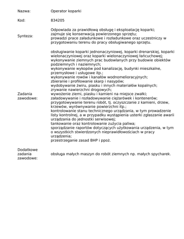 Nazwa: Operator koparki Kod: 834205 Synteza: Odpowiada za prawidłową obsługę i eksploatację koparki; zajmuje się konserwacją powierzonego sprzętu; prowadzi prace załadunkowe i rozładunkowe oraz uczestniczy w przygotowaniu terenu do pracy obsługiwanego sprzętu. Zadania zawodowe: obsługiwanie koparki jednonaczyniowej, koparki drenarskiej, koparki wielonaczyniowej oraz koparki wielonaczyniowej łańcuchowej; wykonywanie ziemnych prac budowlanych przy budowie obiektów podziemnych i naziemnych; wykonywanie wykopów pod kanalizację, budynki mieszkalne, przemysłowe i usługowe itp.; wykonywanie rowów i kanałów wodnomelioracyjnych; zbieranie i profilowanie skarp i nasypów; wydobywanie żwiru, piasku i innych materiałów kopalnych; zrywanie nawierzchni drogowych; wywożenie ziemi, piasku i kamieni na miejsce zwałki; załadowywanie i rozładowywanie ciężarówek i kontenerów; przygotowywanie terenu robót, tj. oczyszczanie z kamieni, drzew, krzewów, wyrównywanie powierzchni itp.; kontrolowanie stanu technicznego urządzania, w tym prowadzenie listy kontrolnej, a w przypadku wystąpienia usterki zgłaszanie awarii urządzania do jednostki serwisowej; tankowanie oraz kontrolowanie zużycia paliwa; sporządzanie raportów dotyczących użytkowania urządzenia, w tym o wszystkich stwierdzonych nieprawidłowościach w pracy urządzenia; przestrzeganie zasad BHP i ppoż. Dodatkowe zadania zawodowe: obsługa małych maszyn do robót ziemnych np. małych spycharek.