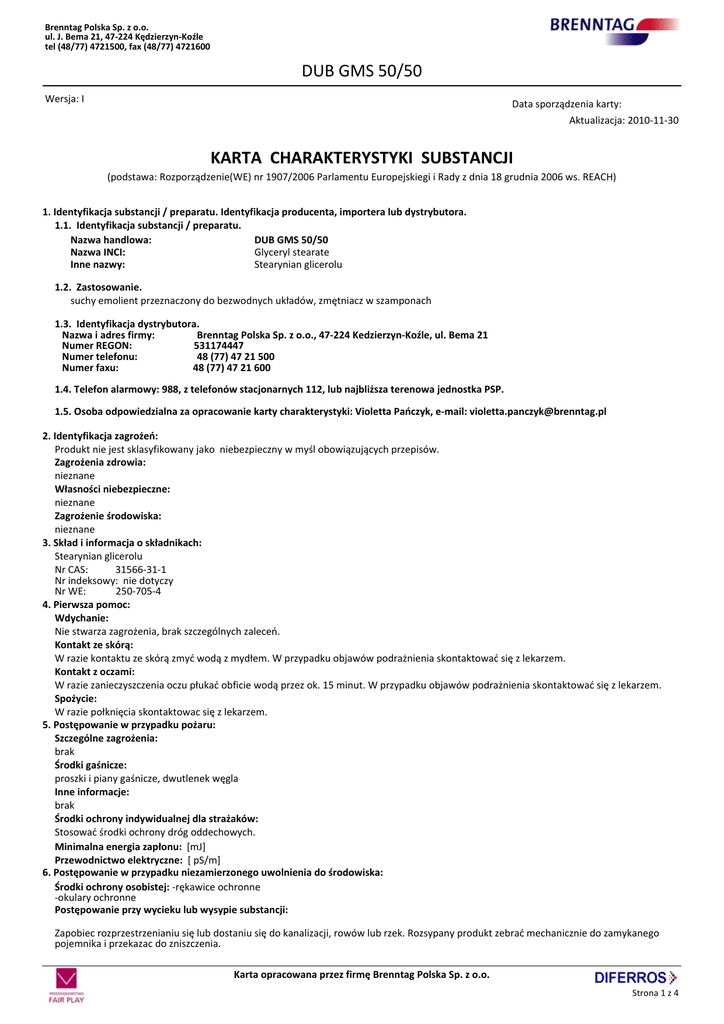 Brenntag Polska Sp. z o.o. ul. J. Bema 21, 47-224 Kędzierzyn-Koźle tel (48/77) 4721500, fax (48/77) 4721600 DUB GMS 50/50 Wersja: I Data sporządzenia karty: __________ Aktualizacja: 2010-11-30 KARTA CHARAKTERYSTYKI SUBSTANCJI (podstawa: Rozporządzenie(WE) nr 1907/2006 Parlamentu Europejskiegi i Rady z dnia 18 grudnia 2006 ws. REACH) 1. Identyfikacja substancji / preparatu. Identyfikacja producenta, importera lub dystrybutora. 1.1. Identyfikacja substancji / preparatu. Nazwa handlowa: DUB GMS 50/50 Nazwa INCI: Glyceryl stearate Inne nazwy: Stearynian glicerolu 1.2. Zastosowanie. suchy emolient przeznaczony do bezwodnych układów, zmętniacz w szamponach 1.3. Identyfikacja dystrybutora. Nazwa i adres firmy: Brenntag Polska Sp. z o.o., 47-224 Kedzierzyn-Koźle, ul. Bema 21 Numer REGON: 531174447 Numer telefonu: 48 (77) 47 21 500 Numer faxu: 48 (77) 47 21 600 1.4. Telefon alarmowy: 988, z telefonów stacjonarnych 112, lub najbliższa terenowa jednostka PSP. 1.5. Osoba odpowiedzialna za opracowanie karty charakterystyki: Violetta Pańczyk, e-mail: [email protected] 2. Identyfikacja zagrożeń: Produkt nie jest sklasyfikowany jako niebezpieczny w myśl obowiązujących przepisów. Zagrożenia zdrowia: nieznane Własności niebezpieczne: nieznane Zagrożenie środowiska: nieznane 3. Skład i informacja o składnikach: Stearynian glicerolu Nr CAS: 31566-31-1 Nr indeksowy: nie dotyczy Nr WE: 250-705-4 4. Pierwsza pomoc: Wdychanie: Nie stwarza zagrożenia, brak szczególnych zaleceń. Kontakt ze skórą: W razie kontaktu ze skórą zmyć wodą z mydłem. W przypadku objawów podrażnienia skontaktować się z lekarzem. Kontakt z oczami: W razie zanieczyszczenia oczu płukać obficie wodą przez ok. 15 minut. W przypadku objawów podrażnienia skontaktować się z lekarzem. Spożycie: W razie połknięcia skontaktowac się z lekarzem. 5. Postępowanie w przypadku pożaru: Szczególne zagrożenia: brak Środki gaśnicze: proszki i piany gaśnicze, dwutlenek węgla Inne informacje: brak Środki ochrony indywidualnej dla strażaków: Stosować środki ochrony dróg oddechowych. Minimalna energia zapłonu: [mJ] Przewodnictwo elektryczne: [ pS/m] 6. Postępowanie w przypadku niezamierzonego uwolnienia do środowiska: Środki ochrony osobistej: -rękawice ochronne -okulary ochronne Postępowanie przy wycieku lub wysypie substancji: Zapobiec rozprzestrzenianiu się lub dostaniu się do kanalizacji, rowów lub rzek. Rozsypany produkt zebrać mechanicznie do zamykanego pojemnika i przekazac do zniszczenia. Karta opracowana przez firmę Brenntag Polska Sp. z o.o. Strona 1 z 4 Brenntag Polska Sp. z o.o. ul. J. Bema 21, 47-224 Kędzierzyn-Koźle tel (48/77) 4721500, fax (48/77) 4721600 DUB GMS 50/50 7. Postępowanie z substancją / preparatem i magazynowanie: Magazynowanie: Przechowywać w szczelnie zamkniętych oryginalnych opakowaniach. Postępowanie z substancją lub preparatem: Brak szczególnych zaleceń 8. Kontrola narażenia i środki ochrony indywidualnej: Stosowane środki ochrony osobistej powinny spełniać wymogi Rozporządzenia Ministra Gospodarki z dnia 21 grudnia 2005 r. w sprawie zasadniczych wymagań dla środków ochrony indywidualnej (Dz.U. Nr 259, poz. 2173). Ochrona dróg oddechowych: nie wymagana Ochrona oczu: okulary ochronne Ochrona rąk: rękawice ochronne Techniczne środki ochronne: nie wymagane Inne wyposażenie ochronne: nie wymagane Kontrola zagrożenia: NDS, NDSCh - nie oznaczono (wg Rozporządzenia MPiPS z dn. 29 listopada 2002 ; Dz.U. Nr 217, poz. 1833 z późniejszymi zmianami) Zalecenia dotyczące procedury monitoringu zawartości składników niebezpiecznych w powietrzu – metodyka pomiarów: -Rozporządzenie Ministra Zdrowia z dnia 20 kwietnia 2005 r. w sprawie badań i pomiarów czynników szkodliwych dla zdrowia w środowisku pracy (Dz.U. Nr 73, poz.645) -PN-89/Z-01001/06. Ochrona czystości powietrza. Nazwy, określenia i jednostki. Terminologia dotycząca badań jakości powietrza na stanowiskach pracy. -PN Z-04008-7:2002. Ochrona czystości powietrza. Pobieranie próbek. Zasady pobierania próbek powietrza w środowisku pracy i interpretacja wyników. -PN-EN-689: 2002. Powietrze na stanowiskach pracy – wytyczne oceny narażenia inhalacyjnego na czynniki chemiczne przez porównanie z wartościami dopuszczalnymi i strategia pomiarowa. Uwaga: Gdy stężenie substancji jest ustalone i znane, doboru środków ochrony indywidualnej należy dokonywać z uwzględnieniem stężenia substancji występującego na danym stanowisku pracy, czasu ekspozycji oraz czynności wykonywanych przez pracownika. W sytuacji awaryjnej, jeżeli stężenie substancji na stanowisku pracy nie jest znane, stosować środki ochrony indywidualnej o najwyższej zalecanej klasie ochrony. Pracodawca jest obowiązany zapewnić, aby stosowane środki ochrony indywidualnej oraz odzież i obuwie robocze posiadały właściwości ochronne i użytkowe oraz zapewnić odpowiednie ich pranie, konserwacje, naprawę i odkażanie. Zalecane badania wstępne i okresowe pracowników należy przeprowadzać zgodnie z Rozporządzeniem Ministra Zdrowia i Opieki Społecznej z dnia 30 maja 1996 r. w sprawie przeprowadzania badań lekarskich pracowników, zakresu profilaktycznej opieki zdrowotnej nad pracownikami oraz orzeczeń lekarskich wydanych do celów przewidzianych w Kodeksie Pracy (Dz.U. Nr 69/1996r. poz. 332, ze zmianami Dz.U. Nr 37/2001r. poz. 451) 9. Właściwości fizyczne i chemiczne: Ogólne właściwości: Białe do kremowych granulki bez zapachu Temperatura zapłonu, [°C] >180 Temperatura samozapłonu, [°C] brak danych Górna granica wybuchowości, [% V/V] Dolna granica wybuchowości, [% V/V] brak danych Masa cząsteczkowa nie dotyczy Temperatura topnienia, [°C] ok. 60 Rozpuszczalność w wodzie nierozpuszczalny Współczynnik załamania światła brak danych brak danych Stan skupienia w temp. 20 °C ciało stałe Temperatura wrzenia, [°C] nie dotyczy Rozpuszczalność w innych rozpuszczalnikach br