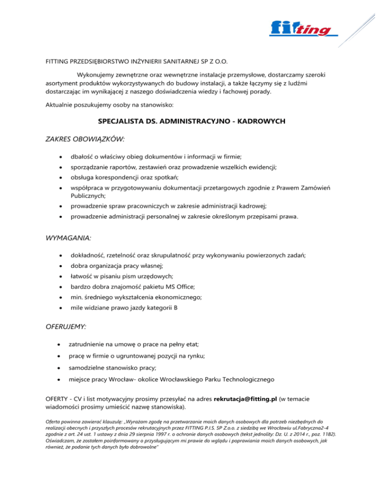 FITTING PRZEDSIĘBIORSTWO INŻYNIERII SANITARNEJ SP Z O.O. Wykonujemy zewnętrzne oraz wewnętrzne instalacje przemysłowe, dostarczamy szeroki asortyment produktów wykorzystywanych do budowy instalacji, a także łączymy się z ludźmi dostarczając im wynikającej z naszego doświadczenia wiedzy i fachowej porady. Aktualnie poszukujemy osoby na stanowisko: SPECJALISTA DS. ADMINISTRACYJNO - KADROWYCH ZAKRES OBOWIĄZKÓW: dbałość o właściwy obieg dokumentów i informacji w firmie; sporządzanie raportów, zestawień oraz prowadzenie wszelkich ewidencji; obsługa korespondencji oraz spotkań; współpraca w przygotowywaniu dokumentacji przetargowych zgodnie z Prawem Zamówień Publicznych; prowadzenie spraw pracowniczych w zakresie administracji kadrowej; prowadzenie administracji personalnej w zakresie określonym przepisami prawa. WYMAGANIA: dokładność, rzetelność oraz skrupulatność przy wykonywaniu powierzonych zadań; dobra organizacja pracy własnej; łatwość w pisaniu pism urzędowych; bardzo dobra znajomość pakietu MS Office; min. średniego wykształcenia ekonomicznego; mile widziane prawo jazdy kategorii B OFERUJEMY: zatrudnienie na umowę o prace na pełny etat; pracę w firmie o ugruntowanej pozycji na rynku; samodzielne stanowisko pracy; miejsce pracy Wrocław- okolice Wrocławskiego Parku Technologicznego OFERTY - CV i list motywacyjny prosimy przesyłać na adres [email protected] (w temacie wiadomości prosimy umieścić nazwę stanowiska). Oferta powinna zawierać klauzulę: „Wyrażam zgodę na przetwarzanie moich danych osobowych dla potrzeb niezbędnych do realizacji obecnych i przyszłych procesów rekrutacyjnych przez FITTING P.I.S. SP Z.o.o. z siedzibą we Wrocławiu ul.Fabryczna2-4 zgodnie z art. 24 ust. 1 ustawy z dnia 29 sierpnia 1997 r. o ochronie danych osobowych (tekst jednolity: Dz. U. z 2014 r., poz. 1182). Oświadczam, że zostałem poinformowany o przysługującym mi prawie do wglądu i poprawiania moich danych osobowych, jak również, że podanie tych danych było dobrowolne”