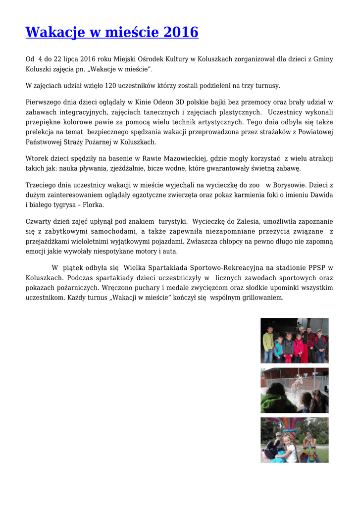 Wakacje w mieście 2016 Od 4 do 22 lipca 2016 roku Miejski Ośrodek Kultury w Koluszkach zorganizował dla dzieci z Gminy Koluszki zajęcia pn. „Wakacje w mieście”. W zajęciach udział wzięło 120 uczestników którzy zostali podzieleni na trzy turnusy. Pierwszego dnia dzieci oglądały w Kinie Odeon 3D polskie bajki bez przemocy oraz brały udział w zabawach integracyjnych, zajęciach tanecznych i zajęciach plastycznych. Uczestnicy wykonali przepiękne kolorowe pawie za pomocą wielu technik artystycznych. Tego dnia odbyła się także prelekcja na temat bezpiecznego spędzania wakacji przeprowadzona przez strażaków z Powiatowej Państwowej Straży Pożarnej w Koluszkach. Wtorek dzieci spędziły na basenie w Rawie Mazowieckiej, gdzie mogły korzystać z wielu atrakcji takich jak: nauka pływania, zjeżdżalnie, bicze wodne, które gwarantowały świetną zabawę. Trzeciego dnia uczestnicy wakacji w mieście wyjechali na wycieczkę do zoo w Borysowie. Dzieci z dużym zainteresowaniem oglądały egzotyczne zwierzęta oraz pokaz karmienia foki o imieniu Dawida i białego tygrysa – Florka. Czwarty dzień zajęć upłynął pod znakiem turystyki. Wycieczkę do Zalesia, umożliwiła zapoznanie się z zabytkowymi samochodami, a także zapewniła niezapomniane przeżycia związane z przejażdżkami wieloletnimi wyjątkowymi pojazdami. Zwłaszcza chłopcy na pewno długo nie zapomną emocji jakie wywołały niespotykane motory i auta. W piątek odbyła się Wielka Spartakiada Sportowo-Rekreacyjna na stadionie PPSP w Koluszkach. Podczas spartakiady dzieci uczestniczyły w licznych zawodach sportowych oraz pokazach pożarniczych. Wręczono puchary i medale zwycięzcom oraz słodkie upominki wszystkim uczestnikom. Każdy turnus „Wakacji w mieście” kończył się wspólnym grillowaniem.