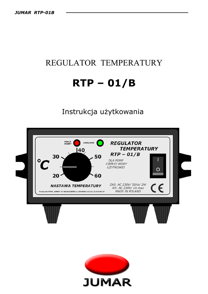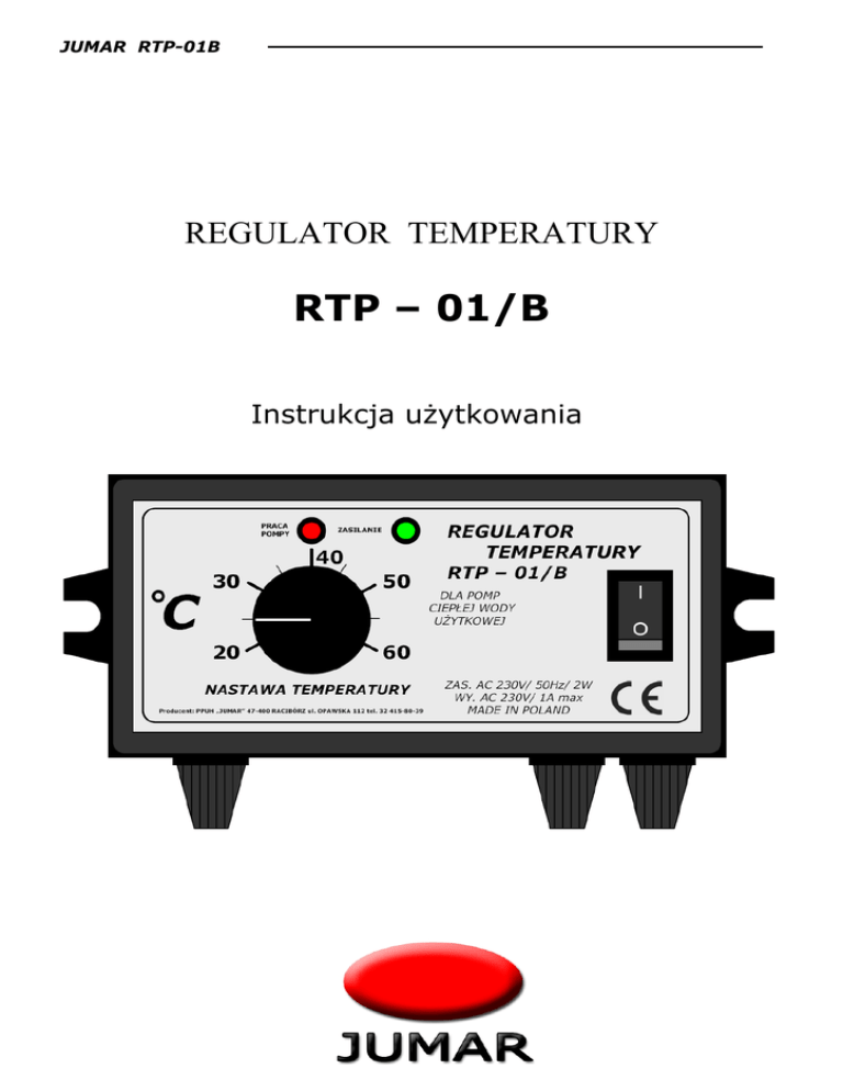JUMAR RTP-01B REGULATOR TEMPERATURY RTP – 01/B Instrukcja użytkowania 1 JUMAR RTP-01B Dziękujemy za wybór naszego produktu. Niniejsza instrukcja ma na celu ułatwić Państwu instalację sterownika oraz zapoznać się z obsługą i bezpiecznym użytkowaniem urządzenia. Przed instalacją urządzenia prosimy o dokładne przeczytanie instrukcji i zapoznanie się z działaniem sterownika. W przypadku pytań prosimy o kontakt z firmą JUMAR. P.P.U.H JUMAR Jerzy Podhajski ul. Opawska 112 47-400 Racibórz tel./fax 32-415-80-39 tel. 32-415-54-24 Biuro e-mail: [email protected] Serwis e-mail: [email protected] www.ju-mar.eu 2 JUMAR RTP-01B ZASTOSOWANIE Regulator temperatury przeznaczony jest do wyłączania pompy w instalacji CWU po osiągnięciu zadanej temperatury. Temperatura załączenia regulowana jest w zakresie od 20 do 80 ºC. Histereza jest ustalona na stałe i wynosi 1,5 ºC, a opóźnienie ponownego załączenia pompy wynosi 30 sekund. Opóźnienie jest celowo ustawione w takim przedziale czasowym ,aby ochronić silnik pompy przed zbyt częstym załączaniem i wyłączaniem podczas rozruchu instalacji centralnego ogrzewania. MONTAŻ Ponieważ w urządzeniu występuje napięcie niebezpieczne, montażu powinna dokonać osoba posiadająca odpowiednie uprawnienia. 1. Mocowanie regulatora: - regulator montujemy na ścianie za pomocą dwóch wkrętów (kołki rozporowe z wkrętami dołączone są do aparatu) - przewody wyprowadzone z regulatora przymocować do ściany uchwytami. 2. Podłączenie przewodu zasilającego pompę CWU: - z puszki zaciskowej silnika pompy demontujemy pokrywę osłaniającą zaciski - do zacisku ( i ) montujemy przewód koloru żółto-zielonego - do zacisku ( N ) montujemy przewód w kolorze niebieskim - do zacisku ( L ) montujemy przewód w kolorze brązowym Sprawdzamy poprawność podłączenia przewodów i mocujemy pokrywę puszki zaciskowej pompy. 3. Mocowanie czujnika temperatury: - czujnik umieszczamy na nieosłoniętej rurze możliwie jak najbliżej kotła dociskając go opaską zaciskową (jest w opakowaniu). - owinąć materiałem izolacyjnym miejsca mocowania czujnika z rurą 3 JUMAR RTP-01B 4. Podłączenie regulatora do zasilania: – po zabezpieczeniu przewodów przed zerwaniem przewód zasilający z wtyczką należy podłączyć do gniazda sieciowego 230V/ 50 Hz koniecznie z bolcem uziemiającym. SYGNALIZACJA PRACY POMPY SYGNALIZACJA ZASILANIA 158 PRACA POMPY C o ZASILANIE 40 60 gniazdo bezpiecznika REGULATOR TEMPERATURY RTP - 01/B DLA POMP C.W.U. 20 0 80 NASTAWA TEMPERATURY ZAS. AC 230V/ 50Hz/ 2 W WY. AC 230V/ 1A max 0 WYŁĄCZNIK ZASILANIA Producent: PPUH "JUMAR" 47-400 RACIBÓRZ ul. OPAWSKA 112 tel. 0-32 415-80-39 MADE IN POLAND PRZEWÓD CZUJNIKA TEMPERATURY PRZEWÓD POMPY C.O. PRZEWÓD ZASILAJĄCY 5. Obsługa regulatora: - Wyłącznikiem regulatora włączamy regulator (dioda zielona świeci się). - Gałką potencjometru ustawiamy temperaturę wyłączenia pompy CWU. - Pompa załączana jest gdy temperatura w miejscu mocowania czujnika jest niższa od nastawionej, co jest sygnalizowane świeceniem diody czerwonej. DANE TECHNICZNE Nastawa temperatury 20 - 80 ºC Histereza (różnica załącz-wyłącz) 1,5 ºC Opóźnienie 30 sek Napięcie zasilania 230 V 50 Hz Pobór mocy <2W Wyjście 230 V / 3(1) A Klasa ochrony II / IP 40 Masa 0,6 kg Wymiary 168 x 100 x 50 Nr PKWiU 33.20.70–15.00 Temperatura pracy otoczenia 0 – 40 ºC 4 JUMAR RTP-01B BEZPIECZEŃSTWO Regulator jest zaprojektowany, wyprodukowany i przetestowany zgodnie z wymogami Europejskich Standardów Bezpieczeństwa (PN–EN 60730-1/12-2002). q Regulator należy podłączyć do instalacji elektrycznej poprzez gniazdko wyposażone w styk ochronny PE. Nie wolno stosować rozgałęźników lub listwy przyłączeniowej. q Należy uważać, żeby przewód przyłączeniowy nie dotykał gorących części kotła CO. q Nie uderzać w regulator ciężkimi przedmiotami. q Nie używać regulatora do innych celów niż sterowanie pompą CWU q Nie wkładać wtyczki przewodu przyłączeniowego do wody lub innych płynów. q Nie nadwyrężać przewodów regulatora. Nie przenosić urządzenia trzymając za przewód oraz nie ciągnąć przewodu podczas rozłączania z gniazdka. q Jeżeli przewód zasilający ulegnie uszkodzeniu, to powinien być wymieniony przez producenta lub wskazany przez niego specjalistyczny zakład naprawczy w celu uniknięcia zagrożenia. q Osoby nieupoważnione nie mogą dokonywać jakichkolwiek napraw regulatora. q Demontowanie (rozkręcanie) regulatora jest niedopuszczalne. q Wszelkie naprawy powinny być wykonywane tylko przez producenta lub wskazany przez niego specjalistyczny zakład naprawczy. q Dopuszcza się wymianę bezpiecznika, który znajduje się w specjalnie oznaczonym gnieździe z boku urządzenia. Należy pamiętać o wcześniejszym odłączeniu wtyczki przewodu przyłączeniowego z gniazdka zasilającego. q Regulatora nie mogą obsługiwać dzieci. 5 JUMAR RTP-01B KONSERWACJA URZĄDZENIA 1. Przed czyszczeniem urządzenia należy wyjąć wtyczkę przewodu przyłączeniowego z gniazdka zasilającego. 2. Regulator nie jest przewidziany do częściowego lub całkowitego zanurzenia w wodzie podczas czyszczenia. 3. Do czyszczenia regulatora nie używać agresywnych detergentów w postaci emulsji, mleczka, past itp. Mogą one między innymi usunąć naniesione informacyjne symbole graficzne takie jak podziałki, oznaczenia, znaki ostrzegawcze itp. 4. Czyścić urządzenie przy pomocy miękkiej ściereczki zwilżonej płynem myjącym. 5. Nie czyścić wnętrza regulatora. PROBLEMY I ICH ROZWIĄZYWANIE Objaw uszkodzenia Należy sprawdzić q Należy sprawdzić czy kabel zasilający jest prawidłowo podłączony do gniazdka elektrycznego. 1. Regulator nie działa. q Należy upewnić się czy w instalacji elektrycznej jest napięcie q Należy sprawdzić czy nie przepalił się bezpiecznik. Jest to bezpiecznik 1,6 A. Opóźnienie jest celowo ustawione na 30 2. Regulator n