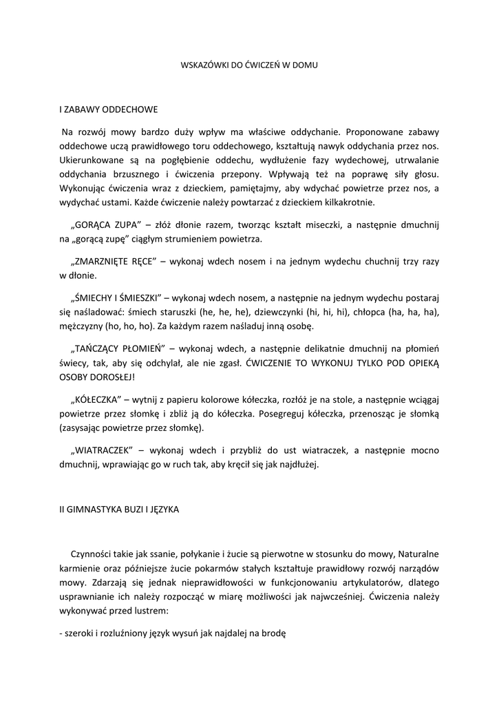 WSKAZÓWKI DO ĆWICZEŃ W DOMU I ZABAWY ODDECHOWE Na rozwój mowy bardzo duży wpływ ma właściwe oddychanie. Proponowane zabawy oddechowe uczą prawidłowego toru oddechowego, kształtują nawyk oddychania przez nos. Ukierunkowane są na pogłębienie oddechu, wydłużenie fazy wydechowej, utrwalanie oddychania brzusznego i ćwiczenia przepony. Wpływają też na poprawę siły głosu. Wykonując ćwiczenia wraz z dzieckiem, pamiętajmy, aby wdychać powietrze przez nos, a wydychać ustami. Każde ćwiczenie należy powtarzać z dzieckiem kilkakrotnie. „GORĄCA ZUPA” – złóż dłonie razem, tworząc kształt miseczki, a następnie dmuchnij na „gorącą zupę” ciągłym strumieniem powietrza. „ZMARZNIĘTE RĘCE” – wykonaj wdech nosem i na jednym wydechu chuchnij trzy razy w dłonie. „ŚMIECHY I ŚMIESZKI” – wykonaj wdech nosem, a następnie na jednym wydechu postaraj się naśladować: śmiech staruszki (he, he, he), dziewczynki (hi, hi, hi), chłopca (ha, ha, ha), mężczyzny (ho, ho, ho). Za każdym razem naśladuj inną osobę. „TAŃCZĄCY PŁOMIEŃ” – wykonaj wdech, a następnie delikatnie dmuchnij na płomień świecy, tak, aby się odchylał, ale nie zgasł. ĆWICZENIE TO WYKONUJ TYLKO POD OPIEKĄ OSOBY DOROSŁEJ! „KÓŁECZKA” – wytnij z papieru kolorowe kółeczka, rozłóż je na stole, a następnie wciągaj powietrze przez słomkę i zbliż ją do kółeczka. Posegreguj kółeczka, przenosząc je słomką (zasysając powietrze przez słomkę). „WIATRACZEK” – wykonaj wdech i przybliż do ust wiatraczek, a następnie mocno dmuchnij, wprawiając go w ruch tak, aby kręcił się jak najdłużej. II GIMNASTYKA BUZI I JĘZYKA Czynności takie jak ssanie, połykanie i żucie są pierwotne w stosunku do mowy, Naturalne karmienie oraz późniejsze żucie pokarmów stałych kształtuje prawidłowy rozwój narządów mowy. Zdarzają się jednak nieprawidłowości w funkcjonowaniu artykulatorów, dlatego usprawnianie ich należy rozpocząć w miarę możliwości jak najwcześniej. Ćwiczenia należy wykonywać przed lustrem: - szeroki i rozluźniony język wysuń jak najdalej na brodę - unieś czubek języka jak najwyżej w kierunku nosa, a następnie skieruj go w kierunku brody - wypchnij językiem policzek – na przemian prawy i lewy, - wysuń do przodu usta ściągnięte w dzióbek, jak przy wymawianiu głoski „u”, - wypełnij powietrzem policzki i przemieszczaj je z jednego policzka do drugiego, - rozciągnij usta w uśmiechu nie pokazując zębów, - przy szeroko otwartych ustach oblizuj je dookoła, - zakryj dolnymi zębami wargę górną, a następnie górnymi zębami wargę dolną. III ZABAWY SŁUCHOWE Jednym z warunków rozwoju mowy jest prawidłowo wykształcony słuch fizjologiczny oraz fonemowy. Proponowane zabawy rozwijają pamięć słuchową, koordynację słuchowowzrokową. Usprawniają zdolności precyzyjnego słyszenia dźwięków zarówno w otoczeniu jak i we własnych wypowiedziach. Zabawa „Co słyszysz?” – dziecko siedzi z zamkniętymi oczami i słucha dźwięków dochodzących z otoczenia (z podwórka, sąsiedniego pokoju, ulicy). Jest to tzw. wsłuchiwanie się w ciszę, gdyż celowo nie wytwarza się żadnych dźwięków. Rozpoznawanie wytwarzanych dźwięków, najpierw przy pomocy wzroku, a następnie tylko słuchowo (dziecko zamyka oczy lub odwraca się). Można uderzać łyżeczką w szkło, drewno, metal, lać wodę odbijać piłkę, wysuwać szuflady, otwierać i zamykać drzwi. Wskazywanie źródła dźwięku – dziecko wyszukuje ukryty wcześniej dzwoniący budzik, tykający zegarek, rozpoznaje do których drzwi słyszy pukanie. Chodzenie za głosem – dziecko ma zasłonięte oczy i idzie za usłyszanym głosem. Układanie wyrazów na daną głoskę.