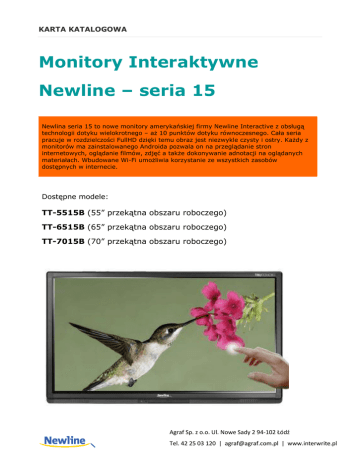 KARTA KATALOGOWA Monitory Interaktywne Newline – seria 15 Newlina seria 15 to nowe monitory amerykańskiej firmy Newline Interactive z obsługą technologii dotyku wielokrotnego – aż 10 punktów dotyku równoczesnego. Cała seria pracuje w rozdzielczości FullHD dzięki temu obraz jest niezwykle czysty i ostry. Każdy z monitorów ma zainstalowanego Androida pozwala on na przeglądanie stron internetowych, oglądanie filmów, zdjęć a także dokonywanie adnotacji na oglądanych materiałach. Wbudowane Wi-Fi umożliwia korzystanie ze wszystkich zasobów dostępnych w internecie. Dostępne modele: TT-5515B (55” przekątna obszaru roboczego) TT-6515B (65” przekątna obszaru roboczego) TT-7015B (70” przekątna obszaru roboczego) Agraf Sp. z o.o. Ul. Nowe Sady 2 94-102 Łódź Tel. 42 25 03 120 | [email protected] | www.interwrite.pl KARTA KATALOGOWA Cechy rozwiązania technologia: pozycjonowanie w podczerwieni wbudowane Wi-Fi zainstalowany system Android – umożliwiający pracę bez podłączenia komputera – dokonywanie adnotacji na przeglądanych materiałach oraz serfowanie po internecie wbudowany odtwarzacz multimediów - przeglądanie zdjęć, filmów zapisanych na pamięci USB rozwiązanie all-in-one – możliwość zakupu wersji z wbudowanym komputerem (opjca) – każdy z monitorów wyposażony jest w port OPS Interaktywne oprogramowanie Tech Infinity Pro (dla systemu Windows) - pozwala przygotować lekcję lub prezentacje biznesową długa żywotność (matryca o żywotności 30.000 godz.) wysoka jakość obrazu (rozdzielczość min. Full HD) doskonała widoczność nawet w jasnych pomieszczeniach prosta instalacja - wystarczy zawiesić monitor na ścianie lub statywie i podłączyć do zasilania wyjątkowo cienki 99mm Powłoka non-glare - matową antyrefleksyjną powłokę wyświetlacza. Powłoka non-glare zapewnia ochronę przed odbijaniem się światła od powierzchni wyświetlacza Hartowana szyba MirrorOP bezprzewodowa transmisja obrazu z telefonu lub tabletu 2 porty HDMI 2 letnia gwarancja Agraf Sp. z o.o. Ul. Nowe Sady 2 94-102 Łódź Tel. 42 25 03 120 | [email protected] | www.interwrite.pl