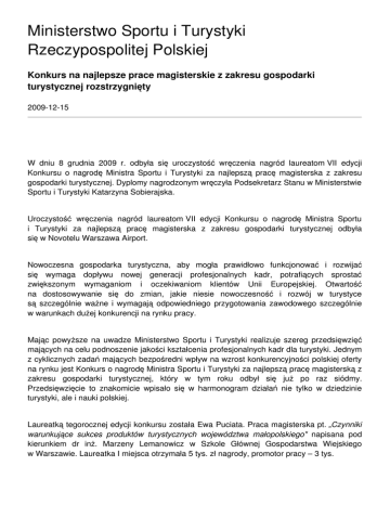 Ministerstwo Sportu i Turystyki Rzeczypospolitej Polskiej Konkurs na najlepsze prace magisterskie z zakresu gospodarki turystycznej rozstrzygnięty 2009-12-15 W dniu 8 grudnia 2009 r. odbyła się uroczystość wręczenia nagród laureatom VII edycji Konkursu o nagrodę Ministra Sportu i Turystyki za najlepszą pracę magisterska z zakresu gospodarki turystycznej. Dyplomy nagrodzonym wręczyła Podsekretarz Stanu w Ministerstwie Sportu i Turystyki Katarzyna Sobierajska. Uroczystość wręczenia nagród laureatom VII edycji Konkursu o nagrodę Ministra Sportu i Turystyki za najlepszą pracę magisterska z zakresu gospodarki turystycznej odbyła się w Novotelu Warszawa Airport. Nowoczesna gospodarka turystyczna, aby mogła prawidłowo funkcjonować i rozwijać się wymaga dopływu nowej generacji profesjonalnych kadr, potrafiących sprostać zwiększonym wymaganiom i oczekiwaniom klientów Unii Europejskiej. Otwartość na dostosowywanie się do zmian, jakie niesie nowoczesność i rozwój w turystyce są szczególnie ważne i wymagają odpowiedniego przygotowania zawodowego szczególnie w warunkach dużej konkurencji na rynku pracy. Mając powyższe na uwadze Ministerstwo Sportu i Turystyki realizuje szereg przedsięwzięć mających na celu podnoszenie jakości kształcenia profesjonalnych kadr dla turystyki. Jednym z cyklicznych zadań mających bezpośredni wpływ na wzrost konkurencyjności polskiej oferty na rynku jest Konkurs o nagrodę Ministra Sportu i Turystyki za najlepszą pracę magisterską z zakresu gospodarki turystycznej, który w tym roku odbył się już po raz siódmy. Przedsięwzięcie to znakomicie wpisało się w harmonogram działań nie tylko w dziedzinie turystyki, ale i nauki polskiej. Laureatką tegorocznej edycji konkursu została Ewa Puciata. Praca magisterska pt. „Czynniki warunkujące sukces produktów turystycznych województwa małopolskiego" napisana pod kierunkiem dr inż. Marzeny Lemanowicz w Szkole Głównej Gospodarstwa Wiejskiego w Warszawie. Laureatka I miejsca otrzymała 5 tys. zł nagrody, promotor pracy – 3 tys. Drugie miejsce w VII edycji konkursu zajęła Magdalena Czichon za pracę magisterską pt. „System informacji turystycznej w Polsce na tle wybranych krajów europejskich" napisaną pod kierunkiem dr inż. Katarzyny Karbowiak w Szkole Głównej Gospodarstwa Wiejskiego w Warszawie. Autorka pracy otrzymała 3 tys. zł, promotor pracy zaś 2 tys. zł. Trzecie miejsce przyznano Mateuszowi Rakowi za pracę magisterską pt. „Kierunki wykorzystania technologii informatycznych w procesie świadczenia usług turystycznych (na przykładzie Biura Turystycznego „bis-pol")". Praca została napisana pod kierunkiem Prof. UEK dr hab. Józefa Sali na Uniwersytecie Ekonomicznym w Krakowie. Za III miejsce autorowi pracy przyznano nagrodę w wysokości 2 tys. zł, promotorowi zaś 1 tys. zł. Załączniki do pobrania Magdalena Czichon "Charakterystyka systemu informacji turystycznej w Polsce na tle wybranych krajów europejskich" [17 B] Ewa Puciata "Czynniki warunkujące sukces produktów turystycznych województwa małopolskiego" [17 B] Mateusz Rak "Kierunki wykorzystania technologii informatycznych w procesie świadczenia usług turystycznych - na przykładzie Biura Turystycznego „bis-pol”" [254,5 KB]