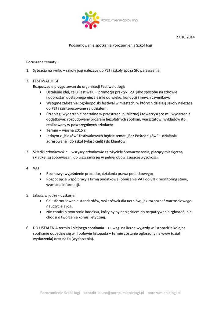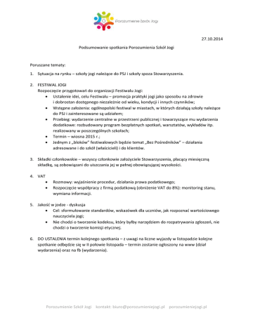 27.10.2014 Podsumowanie spotkania Porozumienia Szkół Jogi Poruszane tematy: 1. Sytuacja na rynku – szkoły jogi należące do PSJ i szkoły spoza Stowarzyszenia. 2. FESTIWAL JOGI Rozpoczęcie przygotowań do organizacji Festiwalu Jogi: • Ustalenie idei, celu Festiwalu – promocja praktyki jogi jako sposobu na zdrowie i dobrostan dostępnego niezależnie od wieku, kondycji i innych czynników; • Wstępne założenia: ogólnopolski festiwal w miastach, w których działają szkoły należące do PSJ i zainteresowane są udziałem; • Przebieg: wydarzenie centralne w przestrzeni publicznej i towarzyszące mu wydarzenia dodatkowe: rozbudowany program bezpłatnych spotkań, warsztatów, wykładów itp. realizowany w poszczególnych szkołach; • Termin – wiosna 2015 r.; • Jednym z „bloków” festiwalowych będzie temat „Bez Pośredników” – działania adresowane i do szkół (właścicieli) i do klientów. 3. Składki członkowskie – wszyscy członkowie założyciele Stowarzyszenia, płacący miesięczną składkę, są zobowiązani do uiszczania jej w pełnej obowiązującej wysokości. 4. VAT • • Rozmowy: wyjaśnienie procedur, działania prawa podatkowego; Rozpoczęcie współpracy z firmą podatkową (obniżenie VAT do 8%): monitoring stanu, wymiana informacji. 5. Jakość w jodze - dyskusja • Cel: sformułowanie standardów, wskazówek dla uczniów, jak rozpoznać wartościowego nauczyciela jogi; • Nie chodzi o tworzenie kodeksu, który byłby narzędziem do rozpatrywania zgłoszeń, nie chodzi o tworzenie komisji etycznej. 6. DO USTALENIA termin kolejnego spotkania – z uwagi na liczne wyjazdy w listopadzie kolejne spotkanie odbędzie się w II połowie listopada – termin zostanie ogłoszony na www (dział wydarzenia) oraz na fb (wydarzenia). Porozumienie Szkół Jogi kontakt: [email protected] porozumieniejogi.pl