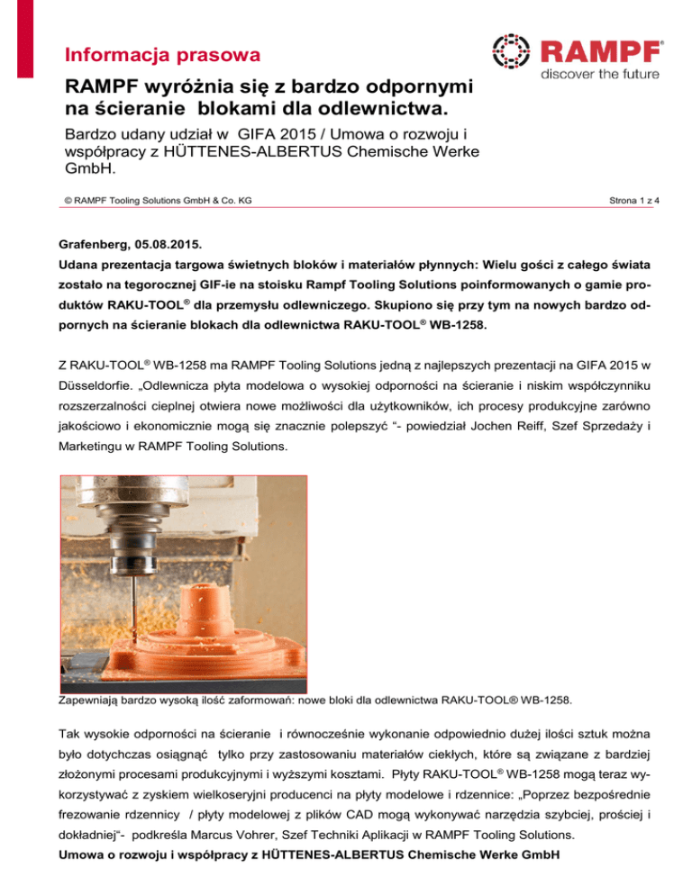 Informacja prasowa RAMPF wyróżnia się z bardzo odpornymi na ścieranie blokami dla odlewnictwa. Bardzo udany udział w GIFA 2015 / Umowa o rozwoju i współpracy z HÜTTENES-ALBERTUS Chemische Werke GmbH. © RAMPF Tooling Solutions GmbH & Co. KG Strona 1 z 4 Grafenberg, 05.08.2015. Udana prezentacja targowa świetnych bloków i materiałów płynnych: Wielu gości z całego świata zostało na tegorocznej GIF-ie na stoisku Rampf Tooling Solutions poinformowanych o gamie produktów RAKU-TOOL® dla przemysłu odlewniczego. Skupiono się przy tym na nowych bardzo odpornych na ścieranie blokach dla odlewnictwa RAKU-TOOL® WB-1258. Z RAKU-TOOL® WB-1258 ma RAMPF Tooling Solutions jedną z najlepszych prezentacji na GIFA 2015 w Düsseldorfie. „Odlewnicza płyta modelowa o wysokiej odporności na ścieranie i niskim współczynniku rozszerzalności cieplnej otwiera nowe możliwości dla użytkowników, ich procesy produkcyjne zarówno jakościowo i ekonomicznie mogą się znacznie polepszyć “- powiedział Jochen Reiff, Szef Sprzedaży i Marketingu w RAMPF Tooling Solutions. Zapewniają bardzo wysoką ilość zaformowań: nowe bloki dla odlewnictwa RAKU-TOOL® WB-1258. Tak wysokie odporności na ścieranie i równocześnie wykonanie odpowiednio dużej ilości sztuk można było dotychczas osiągnąć tylko przy zastosowaniu materiałów ciekłych, które są związane z bardziej złożonymi procesami produkcyjnymi i wyższymi kosztami. Płyty RAKU-TOOL® WB-1258 mogą teraz wykorzystywać z zyskiem wielkoseryjni producenci na płyty modelowe i rdzennice: „Poprzez bezpośrednie frezowanie rdzennicy / płyty modelowej z plików CAD mogą wykonywać narzędzia szybciej, prościej i dokładniej“- podkreśla Marcus Vohrer, Szef Techniki Aplikacji w RAMPF Tooling Solutions. Umowa o rozwoju i współpracy z HÜTTENES-ALBERTUS Chemische Werke GmbH Informacja prasowa RAMPF wyróżnia się bardzo odpornymi na ścieranie blokami dla odlewnictwa Bardzo udany udział w GIFA 2015 / Umowa o rozwoju i współpracy z HÜTTENES-ALBERTUS Chemische Werke GmbH. © RAMPF Tooling Solutions GmbH & Co. KG Strona 2 z 4 Udana współpraca w dziedzinie tworzyw sztucznych dla przemysłu odlewniczego zostanie zintensyfikowana : Amine Serghini, Członek Zarządu odpowiedzialny za sprzedaż i marketing w HÜTTENES-ALBERTUS Chemische Werke (z lewej), i Heinz Horbanski, Dyrektor Zarządzający RAMPF Tooling Solutions, przy podpisaniu Umowy o współpracy i rozwoju dwóch liderów rynku. Wraz z podpisaniem umowy o współpracy i rozwoju RAMPF Tooling Solutions i HÜTTENES-ALBERTUS Chemische Werke, wiodącym międzynarodowym dostawcą produktów chemicznych dla przemysłu odlewniczego, tworzone są podwaliny dla dalszej intensyfikacji współpracy w dziedzinie rozwoju tworzyw sztucznych . „Cieszymy się z kontynuacji udanej i pełnej zaufania współpracy. W oparciu o nowe produkty i procesy chcemy stawiać mocne akcenty zarówno w technologii żywic odlewanych powierzchniowo jak i w obszarze bloków narzędziowych “- mówi Heinz Horbanski, Dyrektor Zarządzający RAMPF Tooling Solutions. Imponujące wyniki współpracy RAMPF Tooling Solutions z HÜTTENES-ALBERTUS Chemische Werke pokazano na GIFA 2015: opracowana przez HÜTTENES-ALBERTUS rdzennica do produkcji rdzeni piaskowych ze spoiwem nieorganicznym, wykonana z zastosowaniem systemu odlewania powierzchniowego RAKU-TOOL® PC-3458 / PH-3958. Z bardzo odpornym na ścieranie materiałem od RAMPF Tooling Solutions osiągnięto w praktyce więcej niż 180.000 zaformowań. Narzędzie wykonane z RAKU-TOOL® PC-3458 / PH-3958, które może być wykorzystane na następny dzień można odlać zarówno ręcznie jak i maszynowo, i jest to jedyny system o temperaturze ugięcia (HDT-B) 95 °C. Informacja prasowa RAMPF wyróżnia się bardzo odpornymi na ścieranie blokami dla odlewnictwa Bardzo udany udział w GIFA 2015 / Umowa o rozwoju i współpracy z HÜTTENES-ALBERTUS Chemische Werke GmbH. © RAMPF Tooling Solutions GmbH & Co. KG Strona 3 z 4 Rdzennica firmy HÜTTENES-ALBERTUS, wykonana przy pomocy systemu odlewania powierzchniowego RAKU-TOOL® PC-3458 / PH-3958 RAMPF Tooling Solutions, została wykorzystana do produkcji rdzeni piaskowych z nieorganicznym spoiwem – figur szachowych – atrakcyjny i obrazowy dar na GIFA. Informacja prasowa RAMPF wyróżnia się bardzo odpornymi na ścieranie blokami dla odlewnictwa Bardzo udany udział w GIFA 2015 / Umowa o rozwoju i współpracy z HÜTTENES-ALBERTUS Chemische Werke GmbH. © RAMPF Tooling Solutions GmbH & Co. KG Strona 4 z 4 www.rampf-gruppe.de RAMPF Tooling Solutions GmbH & Co. KG projektuje, rozwija i produkuje bloki, płynne materiały i półprodukty na modele, i formy. Do oferty należą również produkty i usługi dostosowane do produkowanych materiałów, takie jak pasty, odlewy o dużej objętości, systemy prototypowe. RAMPF Tooling Solutions z siedzibą w Grafenberg (k. Stuttgartu) jest światowym producentem bardzo wydajnych materiałów płytowych do stylizacji, modelarstwa i narzędziowych. Reprezentują one najwyższą jakość i najlepsze właściwości mechaniczne. Wysoką jakość i ekonomiczność wykonania modeli i form gwarantują wydajne Close Contour Pasten, Close Contour Blocks i Close Contour Castings. Firma produkuje i rozwija różne systemy dla przemysłu kompozytowego zapewniając różnorodność procesów produkcyjnych jak również szeroki zakres temperatur. Fachowe doradztwo, zindywidualizowane usługi i szybkie wsparcie techniczne są nieodłącznym elementem spektrum mocy RAMPF Tooling Solutions. RAMPF Tooling Solutions jest częścią międzynarodowej Grupy RAMPF-Gruppe z siedzibą w Grafenberg. Herausgeber: RAMPF Tooling Solutions GmbH & Co. KG Robert-Bosch Str. 8-10 D-72661 Grafenberg T + 49 (0) 7123 9342-1600 F + 49 (0) 7123 9342-1666 E [email protected] www.rampf-gruppe.de HÜTTENES-ALBERTUS Chemische Werke GmbH Wiesenstraße 23/64 D-40549 Düsseldorf T + 49 (0) 0211 5087-0 F + 4