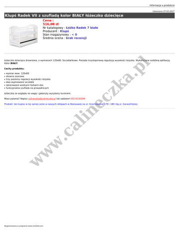Informacje o produkcie Utworzono 07-03-2017 Klupś Radek VII z szufladą kolor BIAŁY łóżeczko dziecięce Cena : 516,00 zł Nr katalogowy : Łóżko Radek 7 białe Producent : Klupś Stan magazynowy : < 0 Średnia ocena : brak recenzji pl Łóżeczko dziecięce drewniane, o wymiarach 120x60. Szczebelkowe. Posiada trzystopniową regulację wysokości leżyska. Wykończone ozdobną aplikacją. Kolor BIAŁY. Cechy produktu: ● ● ● ● ● wymiar wew. 120x60 drewno sosnowe trzy poziomy regulacji wysokości leżyska dwa wyjmowane szczeble lakierowane wodnymi farbami eko funkcjonalna szuflada na prowadnicach zk a. ● ec Łóżeczka ze względu na wagę i gabaryty wysyłamy kurierem. Masz pytania? Napisz [email protected] lub zadzwoń 022-6100399 w w w .c al in Produkt ten kupisz w tej samej cenie w naszych sklepach w Warszawie na ul. Grochowskiej 178 i 180 róg ul. Garwolińskiej. Wygenerowano w programie www.oscGold.com
