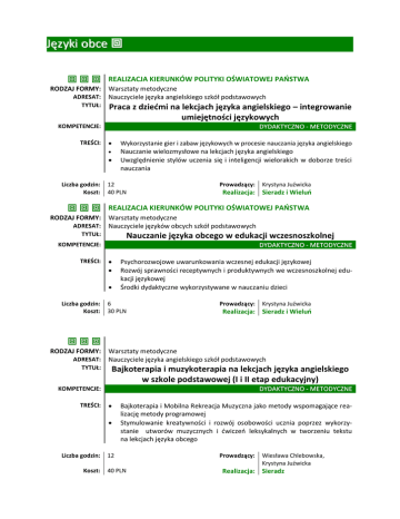 JJęęzzyykkii oobbccee RODZAJ FORMY: ADRESAT: TYTUŁ: REALIZACJA KIERUNKÓW POLITYKI OŚWIATOWEJ PAŃSTWA Warsztaty metodyczne Nauczyciele języka angielskiego szkół podstawowych Praca z dziećmi na lekcjach języka angielskiego – integrowanie umiejętności językowych KOMPETENCJE: TREŚCI: DYDAKTYCZNO - METODYCZNE Liczba godzin: Koszt: RODZAJ FORMY: ADRESAT: TYTUŁ: Wykorzystanie gier i zabaw językowych w procesie nauczania języka angielskiego Nauczanie wielozmysłowe na lekcjach języka angielskiego Uwzględnienie stylów uczenia się i inteligencji wielorakich w doborze treści nauczania 12 40 PLN Prowadzący: REALIZACJA KIERUNKÓW POLITYKI OŚWIATOWEJ PAŃSTWA Warsztaty metodyczne Nauczyciele języków obcych szkół podstawowych Nauczanie języka obcego w edukacji wczesnoszkolnej KOMPETENCJE: TREŚCI: DYDAKTYCZNO - METODYCZNE Liczba godzin: Koszt: Krystyna Juźwicka Realizacja: Sieradz i Wieluń Psychorozwojowe uwarunkowania wczesnej edukacji językowej Rozwój sprawności receptywnych i produktywnych we wczesnoszkolnej edukacji językowej Środki dydaktyczne wykorzystywane w nauczaniu dzieci 6 30 PLN Prowadzący: Krystyna Juźwicka Realizacja: Sieradz i Wieluń RODZAJ FORMY: ADRESAT: TYTUŁ: Warsztaty metodyczne Nauczyciele języka angielskiego szkół podstawowych Bajkoterapia i muzykoterapia na lekcjach języka angielskiego w szkole podstawowej (I i II etap edukacyjny) KOMPETENCJE: TREŚCI: Liczba godzin: Koszt: DYDAKTYCZNO - METODYCZNE Bajkoterapia i Mobilna Rekreacja Muzyczna jako metody wspomagające realizację metody programowej Stymulowanie kreatywności i rozwój osobowości ucznia poprzez wykorzystanie utworów muzycznych i ćwiczeń leksykalnych w tworzeniu tekstu na lekcjach języka obcego 12 Prowadzący: 40 PLN Wiesława Chlebowska, Krystyna Juźwicka Realizacja: Sieradz RODZAJ FORMY: ADRESAT: TYTUŁ: Warsztaty metodyczne Nauczyciele języka angielskiego szkół podstawowych Przygotowanie ucznia szkoły podstawowej do części językowej sprawdzianu po VI klasie KOMPETENCJE: TREŚCI: DYDAKTYCZNO - METODYCZNE Liczba godzin: Koszt: Doskonalenie umiejętności projektowania zadań językowych ułatwiających uczniowi „oswojenie się” z sytuacją egzaminacyjną Wybór metod i zadań językowych pozwalających na efektywne przygotowanie uczniów do sprawdzianu 12 40 PLN Prowadzący: Krystyna Juźwicka Realizacja: Sieradz i Wieluń RODZAJ FORMY: ADRESAT: TYTUŁ: Warsztaty metodyczne Nauczyciele języka angielskiego szkół podstawowych Praca z uczniem ze specjalnymi potrzebami edukacyjnymi na lekcjach języka angielskiego w szkole podstawowej KOMPETENCJE: TREŚCI: DYDAKTYCZNO - METODYCZNE Liczba godzin: Koszt: Przedstawienie sposobów i możliwości pracy z uczniem ze specjalnymi potrzebami edukacyjnymi Modyfikowanie treści nauczania i zadań językowych pod kątem potrzeb i możliwości uczniów ze specjalnymi potrzebami edukacyjnymi 12 Prowadzący: 40 PLN Violetta Florkiewicz, Krystyna Juźwicka Realizacja: Sieradz RODZAJ FORMY: ADRESAT: TYTUŁ: Warsztaty metodyczne Nauczyciele języka angielskiego szkół gimnazjalnych Doskonalenie kompetencji językowych ucznia gimnazjum pod kątem przygotowania do egzaminu gimnazjalnego z języka angielskiego KOMPETENCJE: TREŚCI: DYDAKTYCZNO - METODYCZNE Liczba godzin: Koszt: Wymagania ogólne i szczegółowe w zakresie nauczania języka obcego w gimnazjum Prezentacja i analiza przykładowych zadań językowych, doskonalących umiejętności uczniów w zakresie pisania, rozumienia tekstu i reagowania językowego 12 40 PLN Prowadzący: Krystyna Juźwicka Realizacja: Sieradz RODZAJ FORMY: ADRESAT: TYTUŁ: REALIZACJA KIERUNKÓW POLITYKI OŚWIATOWEJ PAŃSTWA Warsztaty metodyczne Nauczyciele języków obcych szkół gimnazjalnych i ponadgimnazjalnych Motywowanie ucznia gimnazjum i szkoły ponadgimnazjalnej do nauki języka obcego KOMPETENCJE: TREŚCI: Liczba godzin: Koszt: DYDAKTYCZNO - METODYCZNE Teoria społeczno – poznawcza w motywacji Udzielanie motywującej informacji zwrotnej uczniowi Rola motywacji w procesie uczenia się języka obcego 12 Prowadzący: 40 PLN Dorota Wiśniewska, Krystyna Juźwicka Realizacja: Sieradz RODZAJ FORMY: ADRESAT: TYTUŁ: Warsztaty metodyczne Nauczyciele języka angielskiego szkół gimnazjalnych Projekt w gimnazjum jako element kształcenia zintegrowanego KOMPETENCJE: TREŚCI: DYDAKTYCZNO - METODYCZNE Liczba godzin: Koszt: Rodzaje projektów Koncepcja zintegrowanego kształcenia przedmiotowo – językowego 6 30 PLN Prowadzący: Krystyna Juźwicka Realizacja: Sieradz RODZAJ FORMY: ADRESAT: TYTUŁ: Warsztaty metodyczne Nauczyciele języków obcych wszystkich typów szkół Ocenianie kształtujące na lekcjach języka obcego KOMPETENCJE: TREŚCI: DYDAKTYCZNO - METODYCZNE Liczba godzin: Koszt: RODZAJ FORMY: ADRESAT: TYTUŁ: Formułowanie celów lekcji Kryteria oceniania – ocenianie kształtujące a ocenianie sumujące Pytania kluczowe, formułowanie i wykorzystywanie informacji zwrotnej 6 30 PLN Prowadzący: REALIZACJA KIERUNKÓW POLITYKI OŚWIATOWEJ PAŃSTWA Warsztaty metodyczne Nauczyciele języków obcych szkół ponadgimnazjalnych o profilu zawodowym Język obcy ukierunkowany zawodowo KOMPETENCJE: TREŚCI: Liczba godzin: Koszt: Krystyna Juźwicka Realizacja: Sieradz DYDAKTYCZNO - METODYCZNE Doskonalenie kompetencji językowych niezbędnych do funkcjonowania w przyszłości na rynku pracy Projektowanie zadań egzaminacyjnych wymagających wykorzystania języka obcego 6 30 PLN Prowadzący: Krystyna Juźwicka Realizacja: Sieradz i Wieluń RODZAJ FORMY: ADRESAT: TYTUŁ: Warsztaty metodyczne Nauczyciele języka angielskiego szkół gimnazjalnych i ponadgimnazjalnych Indywidualizacja procesu nauczania – programowanie neurolingwistyczne (NLP) w nauczaniu języka angielskiego KOMPETENCJE: TREŚCI: Liczba godzin: Koszt: RODZAJ FORMY: ADRESAT: TYTUŁ: DYDAKTYCZNO - METODYCZNE Przedstawienie koncepcji NLP, geneza pojęcia Indywidualne systemy postrzegania zmysłowego Język metafory w ekspresji ję