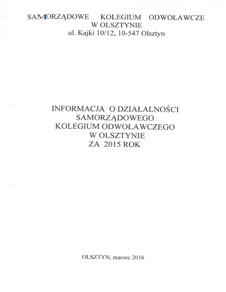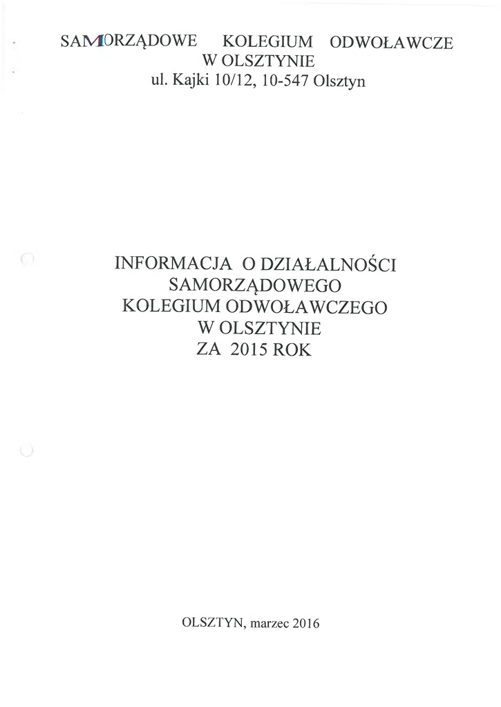 SAMORZĄDOWE KOLEGIUM ODWOŁAWCZE W OLSZTYNIE ul. Kajki 10/12, 10-547 Olsztyn INFORMACJA O DZIAŁALNOŚCI SAMORZĄDOWEGO KOLEGIUM ODWOŁAWCZEGO W OLSZTYNIE ZA 2015 ROK OLSZTYN, marzec 2016 INFORMACJA O DZIAŁALNOŚCI SAMORZĄDOWEGO KOLEGIUM ODWOŁAWCZEGO W OLSZTYNIE za okres od 1 stycznia do 31 grudnia 2015 roku CZĘŚCI OGÓLNA INFORMACJA O DZIAŁALNOŚCI KOLEGIUM 1. Podstawa i zakres działania Kolegium Podstawę prawną działania Samorządowego Kolegium Odwoławczego w Olsztynie (dalej jako SKO) stanowi ustawa z dnia 12 października 1994 r. o samorządowych kolegiach odwoławczych (Dz. U. z 2015r. poz. 1659 ze zm.) oraz rozporządzenia wydane w oparciu o delegację ustawową. Zgodnie z wyżej wymienioną ustawą samorządowe kolegia odwoławcze są organami wyższego stopnia w indywidualnych sprawach z zakresu administracji publicznej należących do właściwości samorządu terytorialnego, właściwymi do rozpatrywania odwołań od decyzji, zażaleń na postanowienia, żądań wznowienia postępowania lub stwierdzania nieważności decyzji w trybie uregulowanym przez przepisy ustawy z dnia 14 czerwca 1960 roku - Kodeks postępowania administracyjnego (Dz. U. z 2016r. poz. 23; dalej jako Kpa) oraz ustawy z dnia 29 sierpnia 1997 roku - Ordynacja podatkowa (Dz. U. z 2015r. poz. 613 ze. zm.; dalej jako Op). Kolegium orzeka również w innych sprawach na zasadach określonych w odrębnych ustawach. Obszar właściwości miejscowej Kolegium obejmuje, zgodnie z rozporządzeniem Prezesa Rady Ministrów z dnia 17 listopada 2003 r. w sprawie obszarów właściwości samorządowych kolegiów odwoławczych (Dz. U. Nr 198, poz. 1925), 15 powiatów, tj. bartoszycki, działdowski, ełcki, giżycki, gołdapski, kętrzyński, lidzbarski, mrągowski, nidzicki, olecki, olsztyński, piski, szczycieński, węgorzewski oraz miasto na prawach powiatu - Olsztyn wraz z gminami objętymi tym obszarem. Rozstrzygając sprawy indywidualne w składach trzyosobowych, Kolegium związane jest wyłącznie przepisami obowiązującego prawa. Samorządowe Kolegium Odwoławcze jest państwową jednostką budżetową. 2. Obsada kadrowa Kolegium 2.1 Kolegium składa się z 43 członków: 20 etatowych i 23 pozaetatowych. Liczba członków etatowych posiadających wykształcenie : wyższe prawnicze : wyższe administracyjne : 19 1 Liczba członków pozaetatowych posiadających wykształcenie : wyższe prawnicze : wyższe administracyjne : wyższe inne: 19 4 0 Wśród członków etatowych Samorządowego Kolegium Odwoławczego w Olsztynie: jest 13 radców prawnych, 1 ma stopień naukowy doktora i 1 ma stopień doktora habilitowanego. Wśród członków pozaetatowych jest 7 radców prawnych, 1 ma stopień naukowy doktora. Biuro Kolegium składa się z 13 pracowników: (skład biura na 31 grudnia 2015 r.) kierownik biura - 1, wykształcenie wyższe, główny księgowy -1, wykształcenie wyższe, księgowy -1, wykształcenie średnie, pracownicy biura - 8 (w tym: 6 starszych inspektorów - wykształcenie wyższe, 1 inspektor - wykształcenie średnie i 1 wykształcenie wyższe), informatyk - 1, wykształcenie wyższe, sprzątaczka - 1, wykształcenie podstawowe. 3. Lokal i wyposażenie Kolegium Siedziba Samorządowego Kolegium Odwoławczego w Olsztynie mieści się w lokalu o • 2 powierzchni 414,7 m przy ul. Kajki 10/12, w budynku biurowym. Kolegium posiada także lokal biurowy przy ul. Kajki 7 o powierzchni 45,1 m2, który stanowi miejsce pracy dla trzech członków etatowych. Powierzchnia lokalowa nie jest wystarczająca na potrzeby instytucji, zarówno w zakresie pomieszczeń biurowych, jak i pomieszczeń z przeznaczeniem na archiwum zakładowe. Samorządowe Kolegium Odwoławcze w Olsztynie dysponuje samochodem służbowym Honda Accord rocznik 2009. Stan wyposażenia Kolegium w sprzęt biurowy i elektroniczny: Kolegium dysponuje nowym serwerem zakupionym w 2015 roku oraz ewidencyjnym programem komputerowym zakupionym w 2006 r. Stanowiska pracy są wyposażone w sprzęt komputerowy zakupiony w latach 2009 -2015. Kolegium w roku sprawozdawczym zakupiło w ramach przygotowania do projektu informatycznego „Rozwój infrastruktury ICT oraz elektronicznych usług w samorządowych kolegiach odwoławczych” sprzęt informatyczny, w którego skład wchodzi: firewall, serwer bazodanowy, stacja robocza - komputerowe stanowisko obsługi petenta wraz z monitorem, skanerem i drukarką monochromatyczną, moduł rozbudowy komunikacji ePUAP2 z istniejącym w Kolegium systemem RESAK i moduł statystyki systemu RESAK. W posiadaniu Kolegium znajduje się 5 kserokopiarek tj.: 1 zakupiona w 2003 r., stanowiąca wyposażenie lokalu biurowego przy ul Kajki 7, oraz 4 kserokopiarki stanowiące wyposażenie siedziby Kolegium: 1 zakupiona w roku 2012, 1 zakupiona w 2011 roku oraz 2 zamortyzowane. CZĘŚĆ II WPŁYW SPRAW 1. Liczba spraw ujętych w ewidencji ogółem w roku objętym informacją: - w tym spraw: 1. 1 pozostałych w ewidencji z roku poprzedzającego okres objęty informacją 1.2 wpływ spraw w roku objętym informacją 7445 1429 6016 2. Rodzaje spraw, które wpłynęły w roku objętym informacją: 2.1. Liczba spraw administracyjnych ogółem 5390 lp. 1 2. 3. 4. . 5. 6. 7. 8. 9. 10. 11. 12. 13. rodzaj sprawy objętych proceduralnie przepisami Ordynacji podatkowej działalność gospodarcza planowanie i zagospodarowanie przestrzenne pomoc społeczna, świadczenia rodzinne i zaliczka alimentacyjna, oświata (stypendia, pomoc materialna itp.), dodatki mieszkaniowe, sprawy socjalne gospodarka nieruchomościami (bez opłat za użytkowanie wieczyste), przekształcenie prawa użytkowania wieczystego w prawo własności, prawo geodezyjne i kartograficzne ochrona środowiska, ochrona przyrody i ochrona zwierząt, odpady i utrzymanie porządku i czystości w gminach prawo wodne rolnictwo, leśnictwo, rybactwo śródlądowe, łowiectwo handel, sprzedaż i podawanie napojów alkoholowych prawo o ruchu drogowym, drogi publiczne, transport drogowy 