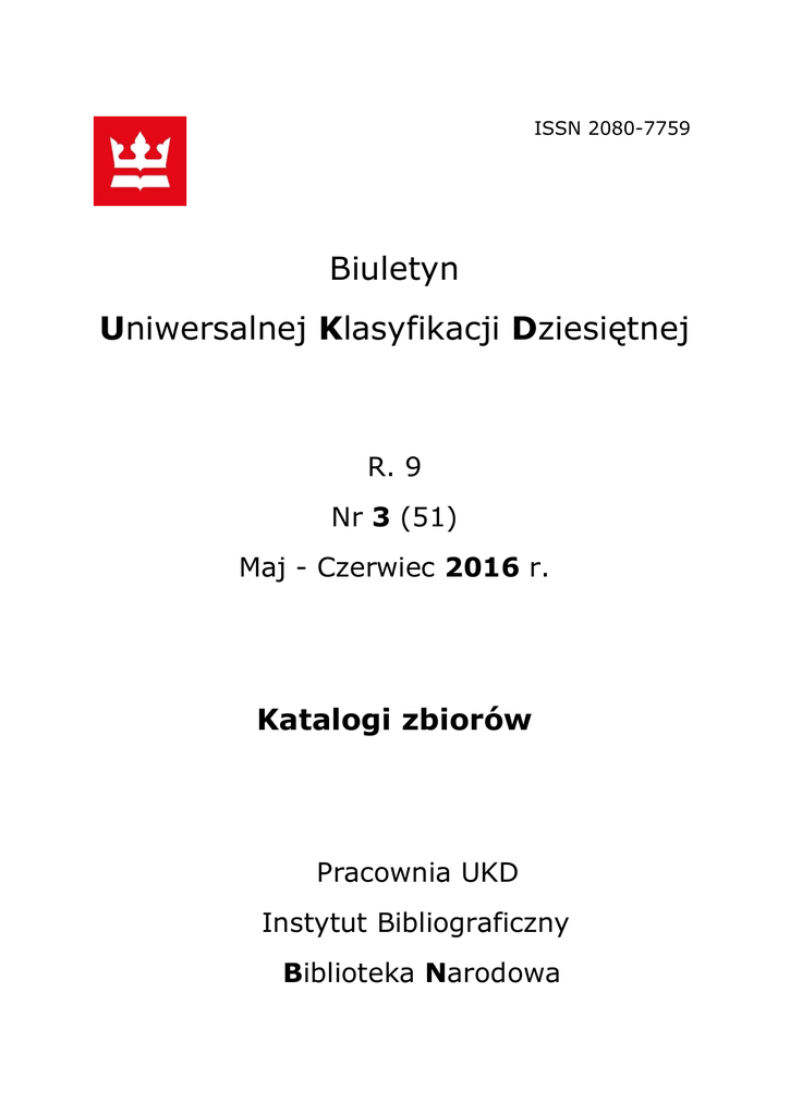 ISSN 2080-7759 Biuletyn Uniwersalnej Klasyfikacji Dziesiętnej R. 9 Nr 3 (51) Maj - Czerwiec 2016 r. Katalogi zbiorów Pracownia UKD Instytut Bibliograficzny Biblioteka Narodowa Aktualności 1. Ukazał się artykuł autorstwa Jolanty Hys Aktywność Biblioteki Narodowej w zakresie zarządzania marką Uniwersalnej Klasyfikacji Dziesiętnej w pracy zbiorowej Zarządzanie zasobami niematerialnymi bibliotek w społeczeństwie wiedzy (Warszawa, 2016 r.) 2. W “Zagadnieniach Informacji Naukowej” nr 2/2015 ukazał się artykuł autorstwa Jolanty Hys Międzynarodowe Seminarium „Classification and Authority Control: Expanding Resource Discovery” (Lizbona, Portugalia, 29–30 października 2015) 3. UDC Summary – liczba języków zwiększyła się do 56 http://www.udcsummary.info/php/index.php?lang=pl&pr=Y 4. UDC Online – liczba języków zwiększyła się do 6 (angielski, holenderski, czeski, chorwacki, hiszpański, słoweński), w przygotowaniu tłumaczenia na język francuski i niemiecki. http://www.udc-hub.com/ 2 3 BIULETYN UKD 3 (51) KATALOGI ZBIORÓW 017.1/.2 Katalogi bibliotek. Katalogi drukowane, inwentarze biblioteczne, np.: Inwentarz inkunabułów Biblioteki Jagiellońskiej 093 017.1/.2 "Pióro żadne nie jest w stanie wyrazić jej zalet" : listy informujące o śmierci mniszek adresowane do opactwa benedyktynek w Sandomierzu w zbiorach Biblioteki Diecezjalnej w Sandomierzu (1781-1897) / Anna Szylar 272-788/-789 017.1/.2 Katalog rycin włoskich w zbiorach Biblioteki Kórnickiej 76(450) 017.1/.2 069.538 Katalogi zbiorów muzealnych, np.: Katalog biżuterii z Ostrowa Lednickiego w Muzeum Pierwszych Piastów 903.2(438) 069.538 Katalog porcelany ćmielowskiej w zbiorach muzealnych 738(438) 069.538 Katalog strojów ludowych w zbiorach Muzeum Wsi Mazowieckiej 391 069.538 4 930.255 Repertoria i spisy dokumentów archiwalnych, np.: Archiwum Ringelbluma 94(438).082 94(=411.16)"19" 930.255(438) Katalog polskich rękopisów w Narodowym Archiwum w Pradze 091 930.255(437.3) Katalog pieczęci pruskich w zasobie Archiwum Państwowego 736.3(430) 930.255(438) (083.824) Katalogi wystaw czasowych, np.: Katalog wystawy czasowej o Titanicu 656.61.08 (083.824) Katalog wystawy czasowej polskich tkanin artystycznych 745.52(438) (083.824) Katalog wystawy czasowej muszkietów i pistoletów 623.442 623.443 (083.824) 5