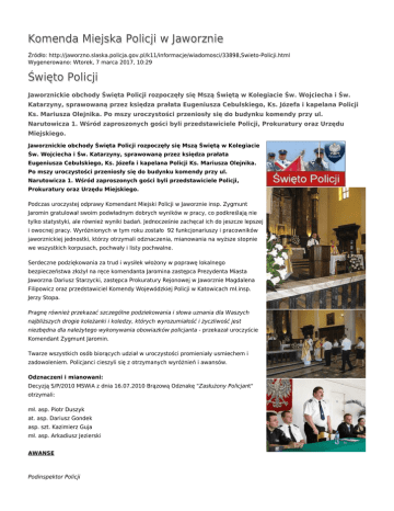 Komenda Miejska Policji w Jaworznie Źródło: http://jaworzno.slaska.policja.gov.pl/k11/informacje/wiadomosci/33898,Swieto-Policji.html Wygenerowano: Wtorek, 7 marca 2017, 10:29 Święto Policji Jaworznickie obchody Święta Policji rozpoczęły się Mszą Świętą w Kolegiacie Św. Wojciecha i Św. Katarzyny, sprawowaną przez księdza prałata Eugeniusza Cebulskiego, Ks. Józefa i kapelana Policji Ks. Mariusza Olejnika. Po mszy uroczystości przeniosły się do budynku komendy przy ul. Narutowicza 1. Wśród zaproszonych gości byli przedstawiciele Policji, Prokuratury oraz Urzędu Miejskiego. Jaworznickie obchody Święta Policji rozpoczęły się Mszą Świętą w Kolegiacie Św. Wojciecha i Św. Katarzyny, sprawowaną przez księdza prałata Eugeniusza Cebulskiego, Ks. Józefa i kapelana Policji Ks. Mariusza Olejnika. Po mszy uroczystości przeniosły się do budynku komendy przy ul. Narutowicza 1. Wśród zaproszonych gości byli przedstawiciele Policji, Prokuratury oraz Urzędu Miejskiego. Podczas uroczystej odprawy Komendant Miejski Policji w Jaworznie insp. Zygmunt Jaromin gratulował swoim podwładnym dobrych wyników w pracy, co podkreślają nie tylko statystyki, ale również wyniki badań. Jednocześnie zachęcał ich do jeszcze lepszej i owocnej pracy. Wyróżnionych w tym roku zostało 92 funkcjonariuszy i pracowników jaworznickiej jednostki, którzy otrzymali odznaczenia, mianowania na wyższe stopnie we wszystkich korpusach, pochwały i listy pochwalne. Serdeczne podziękowania za trud i wysiłek włożony w poprawę lokalnego bezpieczeństwa złożył na ręce komendanta Jaromina zastępca Prezydenta Miasta Jaworzna Dariusz Starzycki, zastępca Prokuratury Rejonowej w Jaworznie Magdalena Filipowicz oraz przedstawiciel Komendy Wojewódzkiej Policji w Katowicach mł.insp. Jerzy Stopa. Pragnę również przekazać szczególne podziekowania i słowa uznania dla Waszych najbliższych drogie koleżanki i koledzy, których wyrozumiałość i życzliwość jest niezbędna dla należytego wykonywania obowiazków policjanta - przekazał uroczyście Komendant Zygmunt Jaromin. Twarze wszystkich osób biorących udział w uroczystości promieniały usmiechem i zadowoleniem. Policjanci cieszyli się z otrzymanych wyróżnień i awansów. Odznaczeni i mianowani: Decyzją S/P/2010 MSWiA z dnia 16.07.2010 Brązową Odznakę "Zasłużony Policjant" otrzymali: mł. asp. Piotr Duszyk at. asp. Dariusz Gondek asp. szt. Kazimierz Guja mł. asp. Arkadiusz Jezierski AWANSE Podinspektor Policji nadkomisarz Piotr Pacyniak nadkomisarz Jacek Sowa Nadkomisarz Policji: kom. Artur Stachańczyk Aspirant sztabowy Policji: st. asp. Remigiusz JÓŹWIK st. asp. Tomasz MESZYŃSKI Starszy aspirant Policji: asp. Mirosław Radzyniak asp. Marian Stolarzewicz asp. Marcin Cieplich asp. Dawid Klimek Aspirant Policji : mł. asp. Piotr mł. asp. Michał Dziura mł. asp. Mariusz Frączkiewicz mł. asp. Sebastian Jakóbik mł. asp. Sławomir Kaczmarczyk mł. asp. Mariusz Kolat mł. asp. Zbigniew Kruk mł. asp. Rafał Kucharski mł. asp. Michał Piecka mł. asp. Piotr Sobczyk mł. asp. Robert Śmigielski Młodszy aspirant Policji: sierż. Piotr Baran st. sierż Sławomir Bednarz sierż. Łukasz Cichoń st. sierż. Dawid Ciołczyk st. sierż. Mariusz Dybich st. sierż. Mateusz Iwaniec sierż. szt. Paweł Klejdysz sierż. szt. Dariusz Kordos st. sierż. Piotr Łach st. sierż. Michał Nowak sierż. szt. Andrzej Pakuła sierż. szt. Jarosław Pieczonka sierż. Bartłomiej Szymkowiak sierż. szt. Kazimierz Wątroba sierż. szt. Seweryn Zięba Sierżant sztabowy Policji : st. sierż Magdalena Firlej Starszy sierżant Policji : sierż. Monika Dubiel sierż. Piotr Figiel sierż. Daniel Kamiński sierż. Katarzyna Klimczak sierż. Piotr Kotulski sierż. Marta sierż. Robert sierż. Marta Sobczyk sierż. Paweł Tabor sierż. Rafał Wisniewski Sierżant Policji st. post. Anna Bochenek st. post. Marcin Budak st. post. Szymon Czogiel st. post. Marek Dziuban st. post. Katarzyna Kępka st. post. Arkadiusz Lisiecki st. post. Andrzej Olesik st. post. Agnieszka Więcek Starszy posterunkowy Policji : post. Michał Świerkosz post. Przemysław Filipek Ocena: 0/5 (0) Tweetnij