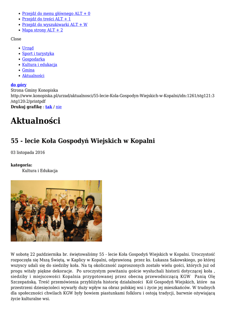 Przejdź do menu głównego ALT + 0 Przejdź do treści ALT + 1 Przejdź do wyszukiwarki ALT + W Mapa strony ALT + 2 Close Urząd Sport i turystyka Gospodarka Kultura i edukacja Gmina Aktualności do góry Strona Gminy Konopiska http://www.konopiska.pl/urzad/aktualnosci/55-lecie-Kola-Gospodyn-Wiejskich-w-Kopalni/idn:1261/stg121:3 /stg120:2/printpdf Drukuj grafikę : tak / nie Aktualności 55 - lecie Koła Gospodyń Wiejskich w Kopalni 03 listopada 2016 kategoria: Kultura i Edukacja W sobotę 22 października br. świętowaliśmy 55 - lecie Koła Gospodyń Wiejskich w Kopalni. Uroczystość rozpoczęła się Mszą Świętą, w Kaplicy w Kopalni, odprawioną przez ks. Łukasza Sakowskiego, po której wszyscy udali się do siedziby koła. Na tą okoliczność zaproszonych zostało wielu gości, których już od progu witały piękne dekoracje. Po uroczystym powitaniu goście wysłuchali historii dotyczącej koła , siedziby i miejscowości Kopalnia przygotowanej przez obecną przewodniczącą KGW Panią Olę Szczepańską. Treść przemówienia przybliżyła historię działalności Kół Gospodyń Wiejskich, które na przestrzeni dziesięcioleci wywarły duży wpływ na obraz polskiej wsi i życie jej mieszkańców. W trudnych dla społeczności chwilach KGW były bowiem piastunkami folkloru i ostoją tradycji, barwnie ożywiającą życie kulturalne wsi. Gratulacje z okazji 55-lecia Członkiniom koła złożyli w imieniu Wójta Gminy Konopiska Jerzego Żurka wicewójt Pani Zofia Kuśmierska razem z przewodniczącym Rady Gminy Panem Edwardem Bałdygą, Pani Bernadetta Niemczyk, Przewodnicząca Krajowej Rady Kół Gospodyń Wiejskich razem z Panią Agnieszką Piotrowską Księgową RZRKiOR, Wiceprzewodniczący Sejmiku Województwa Śląskiego Pan Stanisław Gmitruk, Dyrektor Biura RZRKiOR Pan Ireneusz Blukacz, Radni Gminy Konopiska Pani Anna Świtek i Pan Robert Kołodziejczyk, Dyrektor GCKiR w Konopiskach Pani Iwona Lisek, Dyrektor Zespołu Szkolno Przedszkolnego w Kopalni Pani Lucyna Napieralska, Sołtys sołectwa Kopalnia Pan Zbigniew Wołczyk, Pan Jerzy Socha, członkinie zaprzyjaźnionych kół z Kochcic i Blachowni, Członkinie Kół Gospodyń Wiejskich z terenu Gminy Konopiska i inni. Tego dnia swoją obecnością zaszczycili również jubilatki : ksiądz Łukasz Sakowski, Pani Magdalena Jarosz - Wawrzyńczak, Pani Anna Misiak, Pan Adrian Staroniek, Pani Danuta Budzik, Pan Antoni Frania, Pan Henryk Żydek, Pan Stanisław Michalczyk, który akompaniował paniom podczas prezentacji artystycznej, Pani Karolina Słowik, była choreograf KGW, Pani Bogusława Jończyk, Honorowe członkinie KGW w Kopalni i osoby zaprzyjaźnione. Na tą okoliczność zaproszona została również pierwsza przewodnicząca KGW w Kopalni Pani Katarzyna Jagusiak, która niestety ze względów zdrowotnych nie mogła przybyć osobiście, ale w jej imieniu, przygotowany przez nią list przeczytała jej wnuczka Pani Ilona Dudek. W trakcie spotkania goście mieli okazję obejrzeć przygotowaną prezentację multimedialną, która zawierała m.in. pamiątkowe zdjęcia. Członkinie KGW Kopalnia jako gospodynie włożyły wiele pracy i serca w przygotowanie tego jubileuszu, ale były chwile, które odrywały je od obowiązków. To moment wręczania kwiatów, upominków, przekazywania gratulacji, słów uznania i podziękowań. Wiele radości można było dostrzec m.in. kiedy otrzymywały z rąk Wicewójt Gminy Konopiska Pani Zofii Kuśmierskiej i Przewodniczącego Rady Gminy Pana Edwarda Bałdygi piękne filiżanki i warnik, które posłużą do podejmowania kolejnych gości czy list gratulacyjny z piękną, ręcznie wykonaną przez dzieci z Zespołu Szkolno-Przedszkolnego ramką w kolorowe kwiaty. W każdym Jubileuszu zawarta jest historia. Sam Jubileusz jest okazją, aby powrócić do jej kart, ale przede wszystkim cieszyć się wspólnym świętowaniem. IL/GCKiR Historia Koła Gospodyń Wiejskich w Kopalni Historię okolicy Kopalnia znamy z zapisów z około 1883 roku – były to władze carskie i pierwsza nazwa to „Kolonia Włościańska” licząca 25 domów i 170 mieszkańców. Po odzyskaniu niepodległości przez Polskę w 1919 roku nastąpiły duże zmiany w każdej dziedzinie a w szczególności w szkolnictwie. Analfabetyzm wynosił wtedy bowiem 33%. Szkoły mieściły się w wynajętych domach, były też szkoły górnicze. Na początku w Konopiskach funkcjonowały szkoły 4 klasowe, później 5 i 6 klasowe. Z Kopalni do Konopisk było dosyć daleko, dlatego w 1922 roku powołano Komitet Budowy Szkoły i w ciągu dwóch lat wybudowano szkołę w miejscu, gdzie obecnie znajduje się siedziba KGW Kopalnia. Plac pod budowę pozyskano od Józefa Gzika. Koło Gospodyń Wiejskich w Kopalni założyła p. Katarzyna Jagusiak w 1959 roku. W dawnych latach działalność KGW opierała się na bieżących potrzebach kobiet. W 1969 roku centralny związek KiO.R. wydał regulamin KGW. W oparciu o te wytyczne z 35 członkiń powołano Zarząd i Komisję Rewizyjną. W skład pierwszego Zarządu weszły: p. Jagusiak Katarzyna – przewodnicząca, p. Tanerska Halina – sekretarz, p. Żydek Maria – skarbnik. Uchwalono plan pracy, w którym uwzględniono hodowlę drobiu, prowadzenie (uprawianie) ogródków, organizowanie kursów gotowania, pieczenia, szycia, udział w uroczystościach państwowych ze szczególnym uwzględnieniem Święta Kobiet oraz organizację wycieczek. Udział w walnych zebraniach KR i Banku G.S. miało na celu pozyskiwanie dotacji dla Koła Gospodyń z nadwyżek budżetowych. Były to trudne czasy. Pani Katarzyna Jagusiak była przewodniczącą do 1976 roku. Od 1976r.do 1986r. przewodniczącą była p. Stanisława Smyła. W tych latach prowadzony był odchów drobiu i sprzedaż nawozów. Od 1986 roku funkcję przewodniczącej pełni p. Ola Szczepańska. Na początku swej działalności członkinie KGW spotykały się w domach prywatnych. W 1968 roku rozpoczęto budowę nowej szkoły. W 1980 roku budyn