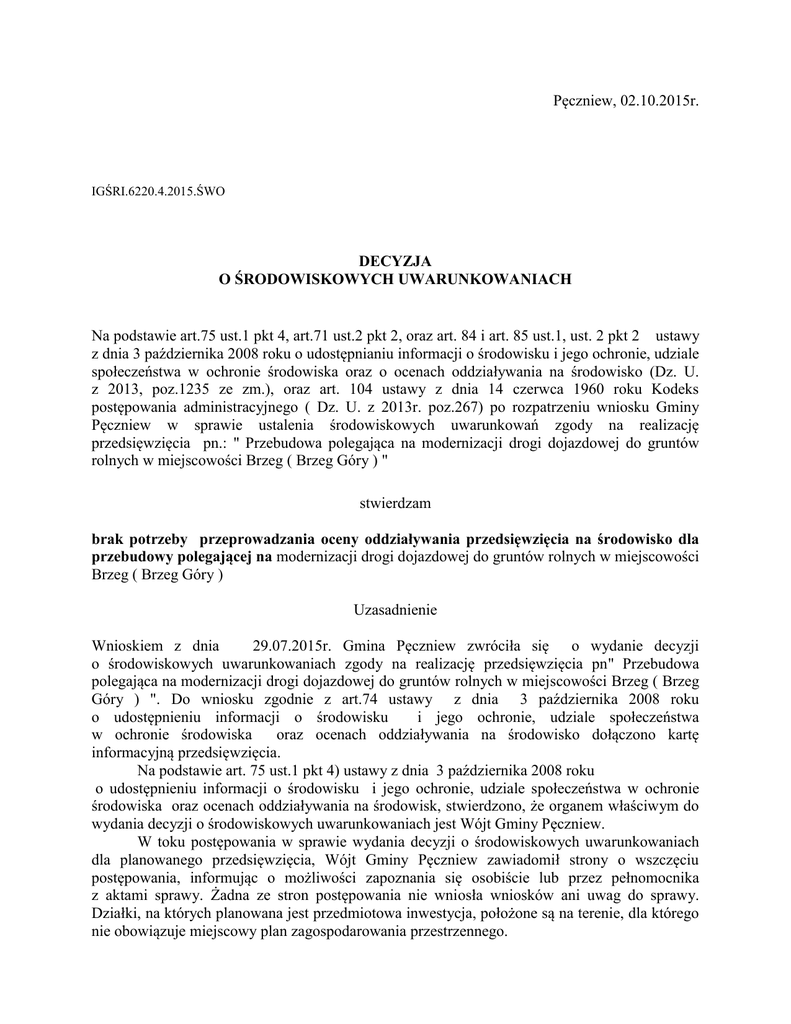 Pęczniew, 02.10.2015r. IGŚRI.6220.4.2015.ŚWO DECYZJA O ŚRODOWISKOWYCH UWARUNKOWANIACH Na podstawie art.75 ust.1 pkt 4, art.71 ust.2 pkt 2, oraz art. 84 i art. 85 ust.1, ust. 2 pkt 2 ustawy z dnia 3 października 2008 roku o udostępnianiu informacji o środowisku i jego ochronie, udziale społeczeństwa w ochronie środowiska oraz o ocenach oddziaływania na środowisko (Dz. U. z 2013, poz.1235 ze zm.), oraz art. 104 ustawy z dnia 14 czerwca 1960 roku Kodeks postępowania administracyjnego ( Dz. U. z 2013r. poz.267) po rozpatrzeniu wniosku Gminy Pęczniew w sprawie ustalenia środowiskowych uwarunkowań zgody na realizację przedsięwzięcia pn.: " Przebudowa polegająca na modernizacji drogi dojazdowej do gruntów rolnych w miejscowości Brzeg ( Brzeg Góry ) " stwierdzam brak potrzeby przeprowadzania oceny oddziaływania przedsięwzięcia na środowisko dla przebudowy polegającej na modernizacji drogi dojazdowej do gruntów rolnych w miejscowości Brzeg ( Brzeg Góry ) Uzasadnienie Wnioskiem z dnia 29.07.2015r. Gmina Pęczniew zwróciła się o wydanie decyzji o środowiskowych uwarunkowaniach zgody na realizację przedsięwzięcia pn" Przebudowa polegająca na modernizacji drogi dojazdowej do gruntów rolnych w miejscowości Brzeg ( Brzeg Góry ) ". Do wniosku zgodnie z art.74 ustawy z dnia 3 października 2008 roku o udostępnieniu informacji o środowisku i jego ochronie, udziale społeczeństwa w ochronie środowiska oraz ocenach oddziaływania na środowisko dołączono kartę informacyjną przedsięwzięcia. Na podstawie art. 75 ust.1 pkt 4) ustawy z dnia 3 października 2008 roku o udostępnieniu informacji o środowisku i jego ochronie, udziale społeczeństwa w ochronie środowiska oraz ocenach oddziaływania na środowisk, stwierdzono, że organem właściwym do wydania decyzji o środowiskowych uwarunkowaniach jest Wójt Gminy Pęczniew. W toku postępowania w sprawie wydania decyzji o środowiskowych uwarunkowaniach dla planowanego przedsięwzięcia, Wójt Gminy Pęczniew zawiadomił strony o wszczęciu postępowania, informując o możliwości zapoznania się osobiście lub przez pełnomocnika z aktami sprawy. Żadna ze stron postępowania nie wniosła wniosków ani uwag do sprawy. Działki, na których planowana jest przedmiotowa inwestycja, położone są na terenie, dla którego nie obowiązuje miejscowy plan zagospodarowania przestrzennego. Po zapoznaniu się ze złożonym wnioskiem wraz z kartą informacyjną przedsięwzięcia ustalono, że planowane przedsięwzięcie polegać będzie na modernizacji nawierzchni drogi dojazdowej w miejscowości Brzeg (Brzeg Góry) o długości całkowitej 1,200km i szerokości 4m. Planowana inwestycja będzie realizowana ze środków krajowych tj. z budżetu gminy i ze środków unijnych. Zakres prac przewidzianych dla przedmiotowej inwestycji obejmuje: - roboty pomiarowe - regulację studzienek urządzeń podziemnych - oczyszczenie istniejących poboczy z traw i chwastów - roboty ziemne przy układaniu ścieków i poboczy - rozebranie i przebudowa istniejących przepustów - wykonanie przebudowy- pogrubienie nawierzchni tłuczniowej - ułożenie ścieków betonowych na ławie betonowej - wykonanie oznakowania pionowego i poziomego - ustawienie barierek ochronnych stalowych. Powierzchnia zajmowana przez planowaną inwestycje wynosić będzie około 9600 m², w tym jezdni 4800 m², pobocza 4800 m². Istniejąca droga gminna w miejscowości Brzeg Górny jest o podbudowie kamienno-żwirowej, gdzie jej szerokość wynosi od 3 do 4 m . Stan techniczny nawierzchni wymaga remontu cząstkowego. Istniejące pobocza są gruntowe o szerokości 2x2,0 m. Stan techniczny poboczy wymaga również naprawy. Spadki poprzeczne jezdni i poboczy są różne w zależności od stopnia zniszczenia na danym odcinku przedmiotowej drogi i wynoszą od 3 do 7 %. Szerokość pasa drogowego na całej długości wynosi do 8 m. Przebudowywana droga znajduje się na gruntach przepuszczalnych kl. V i VI (grunty piaszczyste). W ciągu całego odcinka drogi nie występują w pasie przebudowywanej drogi drzewa i krzaki podlegające wycince. Ze względu na występowanie na terenie przedmiotowej drogi gruntów przepuszczalnych jak również miejscami ograniczonego pasa drogowego nie występują wzdłuż drogi rowy przydrożne. W ciągu drogi występuje 4 przepusty drogowe. Wszystkie przepusty wymagają przebudowy z rury betonowej na rurę PVC. Na wlotach i wylotach przepustów z rur PVC należy wykonać ścianki czołowe. Zgodnie z ustawą o drogach publicznych przebudowywana droga zakwalifikowana jest ze względu na swoje parametry jako droga dojazdowa D. Uziarnienie podbudowy z kruszywa łamanego twardego przewidziano o frakcji 0-63 mm i 0-31,5 mm, a następnie ułożenie warstwy ścieralnej z masy mineralno-asfaltowej dla ruchu KR1-KR2 o grubości 4 cm. po uwałowaniu i szerokości 4 m na długości 1200 m . Przyjęto spadek poprzeczny jezdni drogowy daszkowy o pochyleniu 2 %. Przebudowane zostaną istniejące pobocza gruntowe o szerokości 2x2 m. Uziarnienie podbudowy z kruszywa łamanego przewidziano o frakcji 0-63 mm i 0-31,5 mm. Warstwę nawierzchni jezdni będzie stanowić masa mineralno-asfaltowa dla ruchu KR1-KR2 o grubości 4 cm i szerokości 4 cm o przekroju daszkowym i spadkach wartości 2%. Na całym odcinku drogi przewiduje się wykonanie poboczy gruntowych o szerokości 2 m z gruntu dowiezionego. Pobocza należy wykonać ze spadkami poprzecznymi o wartości 7%. Odwodnienie drogi planuje się poprzez wykonanie spadków poprzecznych i podłużnych nawierzchni jezdni i poboczy na tereny zielone oraz poprzez ścieki z elementów betonowych na ławie betonowej . Nie przewiduje się wykonania rowów przydrożnych jak również nie zmienia się szerokości pasa drogowego na całej długości przebudowy . Wszelkie prace związane z planowanym przedsięwzięciem zostaną wykonane z zastosowaniem technologii jak najmniej uciążliwej dla okolicznych mieszkańcó