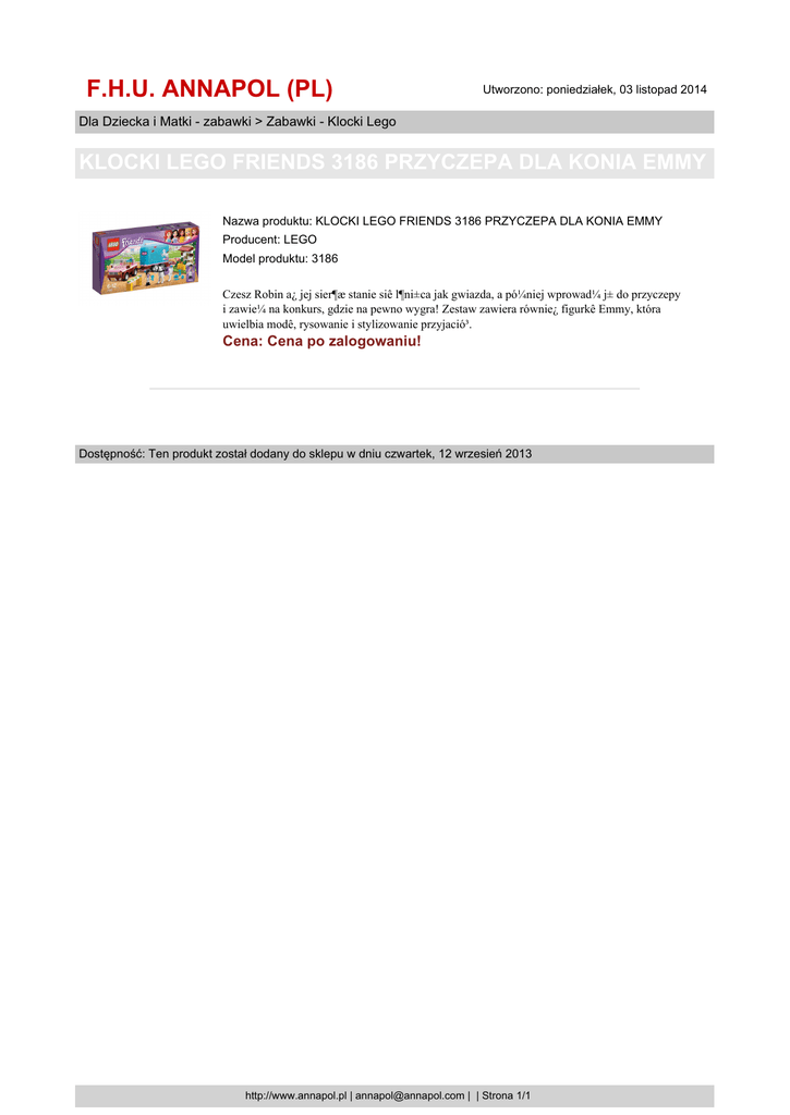 F.H.U. ANNAPOL (PL) Utworzono: poniedziałek, 03 listopad 2014 Dla Dziecka i Matki - zabawki > Zabawki - Klocki Lego KLOCKI LEGO FRIENDS 3186 PRZYCZEPA DLA KONIA EMMY Nazwa produktu: KLOCKI LEGO FRIENDS 3186 PRZYCZEPA DLA KONIA EMMY Producent: LEGO Model produktu: 3186 Czesz Robin a¿ jej sier¶æ stanie siê l¶ni±ca jak gwiazda, a pó¼niej wprowad¼ j± do przyczepy i zawie¼ na konkurs, gdzie na pewno wygra! Zestaw zawiera równie¿ figurkê Emmy, która uwielbia modê, rysowanie i stylizowanie przyjació³. Cena: Cena po zalogowaniu! Dostępność: Ten produkt został dodany do sklepu w dniu czwartek, 12 wrzesień 2013 http://www.annapol.pl | [email protected] | | Strona 1/1