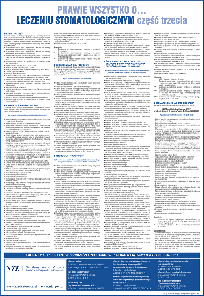 PRAWIE WSZYSTKO O… LECZENIU STOMATOLOGICZNYM część trzecia n KOBIETY W CIĄŻY Kobietom w ciąży i w okresie połogu przysługuje prawo do gwarantowanych świadczeń lekarza dentysty i materiałów stomatologicznych oraz dodatkowych świadczeń zgodnie z Rozporządzeniem Ministra Zdrowia z dnia 30 sierpnia 2009 roku w sprawie świadczeń gwarantowanych z zakresu leczenia stomatologicznego, a także leczenie endodontyczne (kanałowe) wszystkich zębów: v leczenie endodontyczne zęba z wypełnieniem 2 kanałów (nie obejmuje opracowania i wypełnienia ubytku korony zęba) v leczenie endodontyczne zęba z wypełnieniem 3 kanałów (nie obejmuje opracowania i wypełnienia ubytku korony zęba) v leczenie endodontyczne zęba z zakażonymi kanałami z wypełnieniem 2 kanałów zęba (nie obejmuje opracowania i wypełnienia ubytku korony zęba) v usunięcie złogów nazębnych nie częściej niż 1 raz na 6 miesięcy w obrębie całego uzębienia v badanie kontrolne nie częściej niż 1 raz na kwartał v ekstyrpacja przyżyciowa miazgi zęba 1 kanału v ekstyrpacja zdewitalizowanej (usunięcie martwej) miazgi zęba 1 kanału v czasowe wypełnienie 1 kanału v ostateczne wypełnienie 1 kanału v leczenie endodontyczne zęba z zakażonym kanałem z wypełnieniem 1 kanału (nie obejmuje opracowania i odbudowy ubytku korony zęba) v kiretaż otwarty (czyszczenie patologicznej kieszonki zęba) – w obrębie 1/4 uzębienia (nie obejmuje znieczulenia oraz zaopatrzenia rany) v gingiwoosteoplastyka (plastyka zmienionych chorobowo tkanek dziąsła i okolic dziąsła) v plastyka przedsionka jamy ustnej v założenie opatrunku paradontologicznego – każde 3 kolejne przestrzenie międzyzębowe v ope ra cyj ne od sło nię cie za trzy ma ne go zę ba z za ło że niem ele men tu umożliwiającego sprowadzenie zęba do łuku v operacyjne usunięcie zawiązków zębów ze wskazań ortodontycznych v usunięcie złogów nazębnych nie częściej niż 1 raz na 6 miesięcy w obrębie całego uzębienia n CHIRURGIA STOMATOLOGICZNA Leczenie z zakresu chirurgii stomatologicznej i periodontologii (leczenie chorób przyzębia i błony śluzowej jamy ustnej) obejmuje podstawowe procedury, w tym usunięcie zęba. Wykaz świadczeń chirurgii stomatologicznej i periodontologii v Badanie lekarskie stomatologiczne z instruktażem higieny jamy ustnej 1 raz w okresie 12 miesięcy v Badanie lekarskie kontrolne 3 razy w okresie 12 miesięcy v Badanie lekarza specjalisty z krótką pisemną oceną i wskazaniami diagnostyczno-terapeutycznymi dla lekarza prowadzącego, bez powiązania z innymi świadczeniami gwarantowanymi v Badanie żywotności zębów z objęciem badaniem 3 zębów sąsiednich lub przeciwstawnych v Zdję cie zę bo we we wną trzust ne do dwóch zdjęć we wną trzust nych w okresie 12 miesięcy z wpisaniem opisu do dokumentacji przysługuje wyłącznie w połączeniu ze świadczeniami stomatologicznymi finansowanymi ze środków publicznych v Znieczulenie miejscowe powierzchniowe jako samodzielne znieczulenie przysługujące w powiązaniu ze świadczeniami stomatologicznymi finansowanymi ze środków publicznych v Znieczulenie miejscowe nasiękowe przysługujące w powiązaniu ze świadczeniami stomatologicznymi finansowanymi ze środków publicznych v Znieczulenie przewodowe wewnątrzustne przysługujące w powiązaniu ze świadczeniami stomatologicznymi finansowanymi ze środków publicznych v Usunięcie złogów nazębnych za każdą 1/2 łuku zębowego 1 raz w okresie 12 miesięcy w obrębie całego uzębienia v Płukanie kieszonki dziąsłowej i aplikacja leku (obejmuje każdą wizytę) v Leczenie zmian na błonie śluzowej jamy ustnej (obejmuje każdą wizytę) v Ki re taż zwy kły w ob rę bie 1/4 uzę bie nia (nie obej mu je znie czu le nia i opatrunku) v Plastyka wędzidełka wargi i fałdów śluzówkowych przedsionka jamy ustnej i policzka (nie obejmuje znieczulenia i opatrunku) v Unieruchomienie zębów ligaturą drucianą v Usunięcie zęba jednokorzeniowego v Usunięcie zęba wielokorzeniowego v Usunięcie zęba przez dłutowanie wewnątrzzębodołowe przy zastosowaniu wierteł, dźwigni v Usunięcie zęba przez dłutowanie zewnątrzzębodołowe z wytworzeniem płata śluzówkowo-okostnowego v Operacyjne usunięcie zęba zatrzymanego v Chirurgiczne zaopatrzenie małej rany obejmujące do 3 zębodołów łącznie ze szwem v Chirurgiczne zaopatrzenie dużej albo znacznie zanieczyszczonej rany v Zatamowanie masywnego krwawienia w obrębie jamy ustnej przez podwiązanie, podkłucie naczyń – jako zabieg odrębny v Założenie opatrunku chirurgicznego v Wycięcie małego guzka, zmiany guzopodobnej, włókniaka lub pobranie wycinka/biopsja kości wraz z uzyskaniem wyników badania histopatologicznego v Wyłuszczenie torbieli zębopochodnej v Wyłuszczenie kamienia z przewodu ślinianki v Plastyka połączenia ustno-zatokowego jako samodzielne postępowanie v Plastyka połączenia ustno-zatokowego jako następstwo ekstrakcji zęba wykonywanej w ramach świadczeń gwarantowanych v Nacięcie powierzchniowo, podśluzówkowo lub podskórnie leżącego ropnia, łącznie z drenażem i opatrunkiem v Repozycja i unieruchomienie zwichniętego zęba lub grupy zębów v Repozycja i unieruchomienie złamanego fragmentu wyrostka zębodołowego z zębem lub zębami v Tymczasowe zaopatrzenie złamanej szczęki lub żuchwy v Założenie drucianej szyny nazębnej v Zdjęcie szyny nazębnej przy wymianie lub zakończeniu leczenia v Repozycja i unieruchomienie zwichniętej żuchwy v Kiretaż otwarty – w obrębie 1/4 uzębienia (nie obejmuje znieczulenia oraz zaopatrzenia rany) ** v Gingiwoosteoplastyka* v Plastyka przedsionka jamy ustnej* v Założenie opatrunku paradontologicznego – każde 3 kolejne przestrzenie międzyzębowe** v Ope ra cyj ne od sło nię cie za trzy ma ne go zę ba z za ło że niem ele men tu umożliwiającego sprowadzenie zęba do łuku* v Operacyjne usunięcie zawiązków zębów ze 