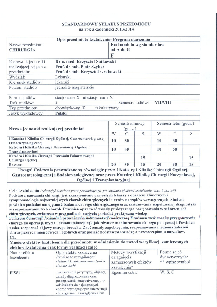 Wykłady - Semestr zimowy Tematyka wykładów (20 godzin) Imię i nazwisko osoby prowadzącej zajęcia Chirurgia przewodu pokarmowego schorzenia żołądka i dwunastnicy. Dr Piotr Czopnik Ostre schorzenia jamy brzusznej cz. I Dr Krzysztof Sutkowski Chirurgia bariatryczna Dr Krzysztof Sutkowski Wykład 4. Chirurgia przewodu pokarmowego – schorzenia trzustki. Dr Piotr Czopnik Wykład 5. Chirurgia endokrynologiczna- schorzenia tarczycy, przytarczyc i nadnerczy Dr Beata Wojtczak Wykład 1. Wykład 2. Wykład 3. Wykład 6. Wykład 7. Wykład 8. Wykład 9. Wykład 10. Współczesne osiągnięcia chirurgii Prof. dr hab. Piotr Szyber Rola chirurga w praktyce lekarza rodzinnego. Chirurgia wątroby. Chirurgia ambulatoryjna. Chirurgia małoinwazyjna, wideochirurgia, chirurgia kosmetyczna. Dawstwo narządów. Organizacja przeszczepów nerek i wątroby. Prof. dr hab. Piotr Szyber Prof. dr hab. Piotr Szyber Prof. dr hab. Andrzej Dorobisz Dr Paweł Chudoba Wykłady - Semestr letni Tematyka wykładów(20 godzin) Wykład 1. Wykład 2. Wykład 3. Wykład 4. Imię i nazwisko osoby prowadzącej zajęcia Guzy neuroendokrynne. Dr n. med. Krzysztof Kaliszewski Chirurgia przewodu pokarmowego – schorzenia pęcherzyka i dróg żółciowych. Dr Krzysztof Sutkowski Schorzenia odbytnicy i odbytu Dr Piotr Czopnik Chirurgia przewodu pokarmowego – schorzenia jelita grubego. Dr Piotr Czopnik Wykład 5. Wykład 6. Wykład 7. Wykład 8. Wykład 9. Wykład 10. Przepukliny brzuszne. Dr n. med. Paweł Domosławski Obrzęki limfatyczne kończyn dolnych. Prof. dr hab. Piotr Szyber Przewlekłe i ostre niedokrwienia narządów, tętniaki aorty brzusznej, chirurgia tętnic dogłowowych. Prof. dr hab. Andrzej Dorobisz Transplantacje i dawstwo narządów. Dr Paweł Chudoba Zakażenia w chirurgii naczyniowej. Dr hab. Jan Skóra, prof. nadzw. Choroba żylakowa kończyn dolnych. Dr hab. Jan Skóra, prof. nadzw. Ćwiczenia - Semestr zimowy Tematyka ćwiczeń (50 godzin) Ćwiczenie 1. Organizacja oddziału chirurgicznego. Zakażenia w chirurgii. Zasady antybiotykoterapii. Aseptyka. Antyseptyka. Przygotowanie chirurga do zabiegu operacyjnego /chirurgiczne mycie rąk, mycie pola operacyjnego, ubieranie chirurga w odzież ochroną/ Omówienie niektórych praw Imię i nazwisko osoby prowadzącej zajęcia Wszyscy pracownicy I Katedry i Kliniki Chirurgii Ogólnej, Gastroenterologicznej i Endokrynologicznej oraz Katedry i Kliniki Chirurgii Naczyniowej, Ogólnej i obowiązków pacjenta w klinice chirurgicznej /zgoda na zabieg operacyjny i badania diagnostyczne, udzielanie informacji o stanie zdrowia/. Badanie podmiotowe i i Transplantacyjnej. przedmiotowe chorego. Historia choroby. Ćwiczenie 2. Narzędzia chirurgiczne. Technika wiązania nici chirurgicznych. Rodzaje szwów chirurgicznych. Szew mechaniczny tkanek. Protezy naczyniowe i inne biomateriały. Mianownictwo chirurgiczne. Dostępy operacyjne w Chirurgii naczyniowej, ogólnej i transplantacyjnej. Badanie podmiotowe i przedmiotowe chorego. Historia choroby. Wszyscy pracownicy I Katedry i Kliniki Chirurgii Ogólnej, Gastroenterologicznej i Endokrynologicznej oraz Katedry i Kliniki Chirurgii Naczyniowej, Ogólnej i Transplantacyjnej. Technika zakładania opasek chirurgicznych /desmurgia/. Złamania, zwichnięcia, skręcenia. Postępowanie w urazach wielonarządowych z uwzględnieniem uszkodzeń naczyń. Powikłania naczyniowe Ćwiczenie 3. w urazach układu kostnego. Pierwsza pomoc Wszyscy pracownicy I Katedry i Kliniki Chirurgii Ogólnej, Gastroenterologicznej do szpitala. Badanie podmiotowe i Endokrynologicznej oraz Katedry i Kliniki Chirurgii Naczyniowej, Ogólnej i przedmiotowe chorego. Historia choroby. i Transplantacyjnej. na miejscu wypadku. Transport chorego Wszyscy pracownicy I Katedry i Kliniki Chirurgii Ogólnej, Gastroenterologicznej Ćwiczenie 4. Wstrząs w chirurgii. Ocena przytomności chorego /skala Glasgow/ Krwotoki, oparzenia, odmrożenia. Badanie podmiotowe i Endokrynologicznej oraz Katedry i Kliniki i przedmiotowe chorego. Historia choroby. Chirurgii Naczyniowej, Ogólnej i Transplantacyjnej. Wszyscy pracownicy Ćwiczenie 5. Rany. Rodzaje ran. Sposoby gojenia ran. Chirurgiczne opracowanie rany. Zakażenia ogólne i miejscowe chorych chirurgicznych /sepsa, zastrzał, zanokcica, ropień, ropowica, ropniak/. Badanie podmiotowe i przedmiotowe chorego. Historia choroby. I Katedry i Kliniki Chirurgii Ogólnej, Gastroenterologicznej i Endokrynologicznej oraz Katedry i Kliniki Chirurgii Naczyniowej, Ogólnej i Transplantacyjnej. Wszyscy pracownicy Ćwiczenie 6. Zakażenia przyranne /tężec, zgorzel gazowa, róża/ badanie podmiotowe i przedmiotowe chorego. Historia choroby. I Katedry i Kliniki Chirurgii Ogólnej, Gastroenterologicznej i Endokrynologicznej oraz Katedry i Kliniki Chirurgii Naczyniowej, Ogólnej i Transplantacyjnej. Wszyscy pracownicy Podstawy zaburzeń patofizjologicznych Ćwiczenie 7. w leczeniu chirurgicznym. Gospodarka wodno – elektrolitowa. Bilans wodny. Zaburzenia gospodarki kwasowo – zasadowej. Badanie podmiotowe i przedmiotowe chorego. Historia choroby. I Katedry i Kliniki Chirurgii Ogólnej, Gastroenterologicznej i Endokrynologicznej oraz Katedry i Kliniki Chirurgii Naczyniowej, Ogólnej i Transplantacyjnej. Wszyscy pracownicy Ćwiczenie 8. Zasady przetaczania krwi, preparatów krwiopochodnych i krwiozastępczych. Zaburzenia krzepnięcia u chorych chirurgicznych. Pobranie i transplantacja narządów. Organizacja Poltransplant. Badanie podmiotowe i przedmiotowe chorego. Historia choroby. I Katedry i Kliniki Chirurgii Ogólnej, Gastroenterologicznej i Endokrynologicznej oraz Katedry i Kliniki Chirurgii Naczyniowej, Ogólnej i Transplantacyjnej. Wszyscy pracownicy Zasady i sposoby odżywiania chorych chirurgicznych – pozajelitowe Ćwiczenie 9. i dojelitowe, hyperalimentacja /pokaz dostępnych preparatów/. Badanie podmiotowe i przedmiotowe chorego. Historia choroby. I Katedry i Kliniki Chirurgii Ogólnej, Gastroenterologicznej i Endokrynologiczn