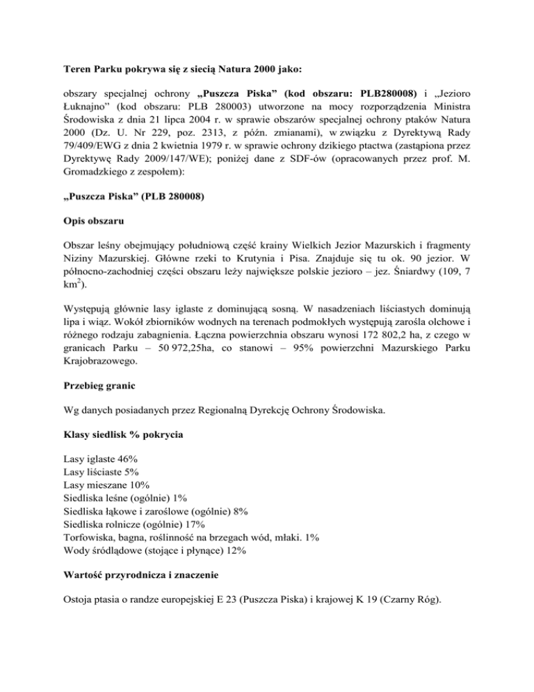 Teren Parku pokrywa się z siecią Natura 2000 jako: obszary specjalnej ochrony „Puszcza Piska” (kod obszaru: PLB280008) i „Jezioro Łuknajno” (kod obszaru: PLB 280003) utworzone na mocy rozporządzenia Ministra Środowiska z dnia 21 lipca 2004 r. w sprawie obszarów specjalnej ochrony ptaków Natura 2000 (Dz. U. Nr 229, poz. 2313, z późn. zmianami), w związku z Dyrektywą Rady 79/409/EWG z dnia 2 kwietnia 1979 r. w sprawie ochrony dzikiego ptactwa (zastąpiona przez Dyrektywę Rady 2009/147/WE); poniŜej dane z SDF-ów (opracowanych przez prof. M. Gromadzkiego z zespołem): „Puszcza Piska” (PLB 280008) Opis obszaru Obszar leśny obejmujący południową część krainy Wielkich Jezior Mazurskich i fragmenty Niziny Mazurskiej. Główne rzeki to Krutynia i Pisa. Znajduje się tu ok. 90 jezior. W północno-zachodniej części obszaru leŜy największe polskie jezioro – jez. Śniardwy (109, 7 km2). Występują głównie lasy iglaste z dominującą sosną. W nasadzeniach liściastych dominują lipa i wiąz. Wokół zbiorników wodnych na terenach podmokłych występują zarośla olchowe i róŜnego rodzaju zabagnienia. Łączna powierzchnia obszaru wynosi 172 802,2 ha, z czego w granicach Parku – 50 972,25ha, co stanowi – 95% powierzchni Mazurskiego Parku Krajobrazowego. Przebieg granic Wg danych posiadanych przez Regionalną Dyrekcję Ochrony Środowiska. Klasy siedlisk % pokrycia Lasy iglaste 46% Lasy liściaste 5% Lasy mieszane 10% Siedliska leśne (ogólnie) 1% Siedliska łąkowe i zaroślowe (ogólnie) 8% Siedliska rolnicze (ogólnie) 17% Torfowiska, bagna, roślinność na brzegach wód, młaki. 1% Wody śródlądowe (stojące i płynące) 12% Wartość przyrodnicza i znaczenie Ostoja ptasia o randze europejskiej E 23 (Puszcza Piska) i krajowej K 19 (Czarny Róg). Występuje co najmniej 37 gatunków ptaków z Załącznika I Dyrektywy Ptasiej, 12 gatunków z Polskiej Czerwonej Księgi (PCK). Bardzo waŜna ostoja cietrzewia. W okresie lęgowym obszar zasiedla powyŜej 2% populacji krajowej (C6) bielika (PCK) i cietrzewia (PCK); ponadto obszar zasiedla, co najmniej 1% populacji krajowej (C6) następujących gatunków ptaków: bocian czarny, orlik krzykliwy (PCK), puchacz (PCK), rybitwa rzeczna, włochatka (PCK); w stosunkowo wysokiej liczebności (C7) występuje derkacz. Zarządzanie Obszar posiada opracowane w ramach programu pilotaŜowego: Program zarządzania ochroną oraz Plan ochrony obszaru Natura 2000 PLB 280008 (PL/IB/2001/EN/02).