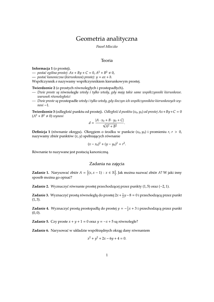 Geometria analityczna Paweł Mleczko Teoria Informacja 1 (o prostej). — postać ogólna prostej: Ax + By + C = 0, A2 + B2 , 0, — postać kanoniczna (kierunkowa) prostej: y = ax + b. Współczynnik a nazywamy współczynnikiem kierunkowym prostej. Twierdzenie 2 (o prostych równoległych i prostopadłych). — Dwie proste są równoległe wtedy i tylko wtedy, gdy mają takie same współczynniki kierunkowe. warunek równoległości — Dwie proste są prostopadłe wtedy i tylko wtedy, gdy iloczyn ich współczynników kierunkowych wynosi −1. Twierdzenie 3 (odległość punktu od prostej). Odległość d punktu (x0 , y0 ) od prostej Ax + By + C = 0 (A2 + B2 , 0) wynosi |A · x0 + B · y0 + C| . d= √ A2 + B2 Definicja 1 (równanie okręgu). Okręgiem o środku w punkcie (x0 , y0 ) i promieniu r, r > 0, nazywamy zbiór punktów (x, y) spełniających równanie (x − x0 )2 + (y − y0 )2 = r2 . Równanie to nazywane jest postacią kanoniczną. Zadania na zajęcia n o Zadanie 1. Narysować zbiór A = (x, x − 1) : x ∈ R . Jak można nazwać zbiór A? W jaki inny sposób można go opisać? Zadanie 2. Wyznaczyć równanie prostej przechodzącej przez punkty (1, 5) oraz (−2, 1). Zadanie 3. Wyznaczyć prostą równoległą do prostej 2x + 21 y − 8 = 0 i przechodzącą przez punkt (1, 3). Zadanie 4. Wyznaczyć prostą prostopadłą do prostej y = − 21 x + 3 i przechodzącą przez punkt (0, 0). Zadanie 5. Czy proste x + y + 1 = 0 oraz y = −x + 5 są równoległe? Zadanie 6. Narysować w układzie współrzędnych okrąg dany równaniem x2 + y2 + 2x − 6y + 4 = 0. 1 Zadanie 7. Znaleźć styczne do okręgu x2 + y2 = 9 przechodzące przez punkt (4, 0). Zadanie 8. Znaleźć styczne do okręgu x2 +y2 +4x−8y+12 = 0 i równoległe do prostej x+y+1 = 0. Zadanie 9. Ile punktów wspólnych z okręgiem x2 + y2 − 2x + 2y = 0 ma prosta y = x + 3? Zadanie 10. Wyznaczyć liczbę punktów wspólnych okręgu o równaniu x2 + y2 + 2x − 6y + 4 = 0 z prostą o równaniu y − x − m = 0 w zależności od parametru m. Zadanie 11. Czy okręgi x2 + y2 + 2x + 8y + 16 = 0 oraz x2 + y2 − 4x − 6y + 8 = 0 mają punkty wspólne? Zadanie 12. Wyznaczyć równanie okręgu stycznego do dwóch prostych o równaniach x+ y−2 = 0 oraz x + y + 3 = 0 i przechodzącego przez punkt (1, 0). Zadanie 13. Punkty A = (−1, −2), B = (2, 1) oraz C = (−4, −3) są wierzchołkami trójkąta ABC. Obliczyć pole tego trójkąta. Zadanie 14. Wierzchołki rombu ABCD znajdują się w punktach A = (−1, 0), B = (3, −1) oraz D = (−2, 4). Znajdź współrzędne wierzchołka C oraz oblicz pole rombu P. Zadanie 15. Na prostej o równaniu y = 5 w taki sposób wyznaczyć punkt B, aby łamana ABC, gdzie A = (2, 3), C = (5, 4), miała jak najmniejszą długość? Zadanie 16. Wyznaczyć pole trójkąta o wierzchołkach (0, x), (x, 3) oraz (1, 3) jako funkcję f zmiennej x, x ∈ R i naszkicować jej wykres. Wyznaczyć liczbę rozwiązań równania f (|x|) = m w zależności od wartości parametru m, m ∈ R. Zadania domowe Zadanie 17. Wyprowadzić wzór na prostą przechodzącą przez punkty (x1 , y1 ) oraz (x2 , y2 ). Zadanie 18. Znaleźć równanie okręgu o środku w punkcie S = (1, 3), jeśli dodatkowo wiadomo, że punkt (2, −1) należy do tego okręgu. Zadanie 19. Okrąg, do którego środek należy do osi OY a promień ma długość r = styczny do prostej o równaniu x + 2y − 1 = 0 Napisz równanie tego okręgu. √ 5 jest Zadanie 20. Czy prosta y = 2x + 3 ma punkt wspólny z okręgiem x2 + y2 + 4x + 4y + 4 = 0? Zadanie 21. Wyznacz równanie okręgu opisanego na trójkącie ABC, gdzie A = (−2, 1), B = (0, −3) i C = (4, 3). Zadanie 22. Okrąg o równaniu (x − 2)2 + (y + 3)2 = 4 jest opisany na pewnym trójkącie równobocznym. Znajdź równanie okręgu wpisanego w ten trójkąt. Odpowiedzi 2 y (−1, 3) 2. y = 43 x + 3 32 √ √ 12 7 7 √ 3. y = −4x + 7 4. y = 2x 5. Tak. 6. x 7. y = √ √ 3 7 x − 127 7 7 lub y = − 3 7 7 x + 8. y = −x − 2 lub y = −x + 6 9. Prosta nie ma punktów wspólnych z okręgiem. √ √ √ 10. Dla m ∈ (4 − 2 3, 4 + 2 3) są dwa wspólne√punkty, dla√m = 4 + 2 3 lub m = 4 − 3 jest jeden punkt wspólny (prosta jest styczną), dla m ∈ (−∞, 4−2 3)∪((4+2 3, ∞) nie ma punktów wspólnych. 11. Brak 2 2 2 2 punktów wspólnych. 12. x + 34 + y − 41 = 25 lub x − 45 + y + 74 = 25 13. P = 3 14. C = (2, 3), 4 4 P = 15 15. B = (4, 5) 16. Ilość rozwiązań w zależności od m: 0 – m ∈ (−∞, 0), 4 – 12 , 23 , 8 – m ∈ 0, 12 , 6 – y −y m = 21 , 3 – m = 32 2 – m ∈ 23 , ∞ . 17. y = x22 −x 1 (x−x1 )+ y1 18. (x−1)2 +(y−3)2 = 17. 19. (x−6)2 + y2 = 5 1 3 2 52 8 2 2 2 . 22. (x − 2)2 + (y + 3)2 = 1. lub (x + 4) + y = 5. 20. Tak. 21. (x + 7 ) + (y − 7 ) = 49 3