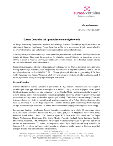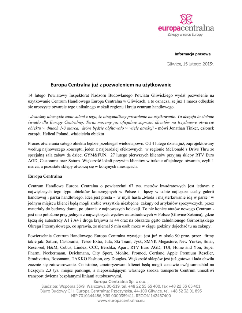 Informacja prasowa Europa Centralna już z pozwoleniem na użytkowanie 14 lutego Powiatowy Inspektorat Nadzoru Budowlanego Powiatu Gliwickiego wydał pozwolenie na użytkowanie Centrum Handlowego Europa Centralna w Gliwicach, a to oznacza, że już 1 marca odbędzie się uroczyste otwarcie tego unikalnego w skali regionu i kraju centrum handlowego. - Jesteśmy niezwykle zadowoleni z tego, że otrzymaliśmy pozwolenie na użytkowanie. Ta decyzja to zielone światło dla Europy Centralnej. Teraz możemy już oficjalnie zaprosić klientów na trzydniowe otwarcie obiektu w dniach 1-3 marca, które będzie obfitowało w wiele atrakcji - mówi Jonathan Tinker, członek zarządu Helical Poland, właściciela obiektu Proces otwierania całego obiektu będzie przebiegał wieloetapowo. Od 4 lutego działa już, zaprojektowany według najnowszego konceptu, jeden z najbardziej efektownych w regionie McDonald’s Drive Thru ze specjalną salą zabaw da dzieci GYM&FUN. 27 lutego pierwszych klientów przyjmą sklepy RTV Euro AGD, Castorama oraz Saturn. Większość lokali przywita klientów w trakcie oficjalnego otwarcia, czyli 1 marca, a pozostałe sklepy otworzą się w kolejnych miesiącach. Europa Centralna Centrum Handlowe Europa Centralna o powierzchni 67 tys. metrów kwadratowych jest jednym z największych tego typu obiektów komercyjnych w Polsce i łączy w sobie najlepsze cechy galerii handlowej i parku handlowego. Idea jest prosta - w myśl hasła „Moda i majsterkowanie idą w parze” w jednym miejscu klienci będą mogli zrobić wszystkie niezbędne zakupy od artykułów spożywczych, przez materiały do budowy domu, po ubrania z najnowszych kolekcji. To nie koniec atutów nowego Centrum jest ono położone przy jednym z największych węzłów autostradowych w Polsce (Gliwice-Sośnica), gdzie łączą się autostrady A1 i A4 i droga krajowa nr 44 oraz na obszarze gęsto zaludnionego Górnośląskiego Okręgu Przemysłowego, co sprawia, że niemal 5 mln osób może w ciągu godziny dojechać tu na zakupy. Powierzchnia Centrum Handlowego Europa Centralna wynajęta jest już w około 90 proc. przez firmy takie jak: Saturn, Castorama, Tesco Extra, Jula, Ski Team, Jysk, SMYK Megastore, New Yorker, Solar, Reserved, H&M, Cubus, Lindex, CCC, Bershka, Apart, RTV Euro AGD, TUI, Home and You, Super Pharm, Neckermann, Deichmann, City Sport, Mohito, Promod, Cortland Apple Premium Reseller, Stradivarius, Rossmann, TAKKO Fashion, czy Douglas. Większość sklepów jest już gotowa i lada chwila zacznie się zatowarowanie. Co istotne, zmotoryzowani klienci będą mogli zostawić swój samochód na liczącym 2,3 tys. miejsc parkingu, a nieposiadającym własnego środka transportu Centrum umożliwi transport dwiema bezpłatnymi liniami autobusowymi. Jedną z atrakcji, jakie Centrum szykuje dla klientów jest konkurs, w którym można wygrać voucher na wycieczkę o wartości sześciu tysięcy złotych. Centrum przygotowuje też oznaczenia z kierunkami, dzięki którym będzie można łatwiej trafić do budynku. Szczegółowe informacje na temat otwarcia i jego atrakcji już w przyszłym tygodniu. www.europacentralna.eu Helical Poland Sp. z o.o. ul. Wspólna 35/9 00-519 Warszawa Więcej informacji: Marta Chodkowska Tel. 601 244 127 [email protected] Marketing Director C. H .Europa Centralna Katarzyna Skalska Tel. 501 699 261 [email protected] Leasing: Dorota Beltrani Tel. 601 241 388 [email protected] Robert Gietko Tel.605 451 060 [email protected] Kontakt dla dziennikarzy: Cook Communications Annie Krasinska Tel. 602 748 558 [email protected] Tomasz Rozek Tel. 663 171 033 [email protected]