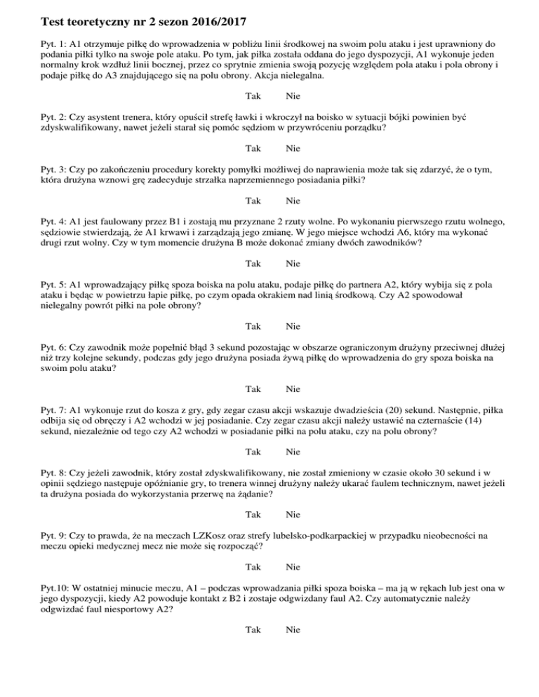 Test teoretyczny nr 2 sezon 2016/2017 Pyt. 1: A1 otrzymuje piłkę do wprowadzenia w pobliżu linii środkowej na swoim polu ataku i jest uprawniony do podania piłki tylko na swoje pole ataku. Po tym, jak piłka została oddana do jego dyspozycji, A1 wykonuje jeden normalny krok wzdłuż linii bocznej, przez co sprytnie zmienia swoją pozycję względem pola ataku i pola obrony i podaje piłkę do A3 znajdującego się na polu obrony. Akcja nielegalna. Tak Nie Pyt. 2: Czy asystent trenera, który opuścił strefę ławki i wkroczył na boisko w sytuacji bójki powinien być zdyskwalifikowany, nawet jeżeli starał się pomóc sędziom w przywróceniu porządku? Tak Nie Pyt. 3: Czy po zakończeniu procedury korekty pomyłki możliwej do naprawienia może tak się zdarzyć, że o tym, która drużyna wznowi grę zadecyduje strzałka naprzemiennego posiadania piłki? Tak Nie Pyt. 4: A1 jest faulowany przez B1 i zostają mu przyznane 2 rzuty wolne. Po wykonaniu pierwszego rzutu wolnego, sędziowie stwierdzają, że A1 krwawi i zarządzają jego zmianę. W jego miejsce wchodzi A6, który ma wykonać drugi rzut wolny. Czy w tym momencie drużyna B może dokonać zmiany dwóch zawodników? Tak Nie Pyt. 5: A1 wprowadzający piłkę spoza boiska na polu ataku, podaje piłkę do partnera A2, który wybija się z pola ataku i będąc w powietrzu łapie piłkę, po czym opada okrakiem nad linią środkową. Czy A2 spowodował nielegalny powrót piłki na pole obrony? Tak Nie Pyt. 6: Czy zawodnik może popełnić błąd 3 sekund pozostając w obszarze ograniczonym drużyny przeciwnej dłużej niż trzy kolejne sekundy, podczas gdy jego drużyna posiada żywą piłkę do wprowadzenia do gry spoza boiska na swoim polu ataku? Tak Nie Pyt. 7: A1 wykonuje rzut do kosza z gry, gdy zegar czasu akcji wskazuje dwadzieścia (20) sekund. Następnie, piłka odbija się od obręczy i A2 wchodzi w jej posiadanie. Czy zegar czasu akcji należy ustawić na czternaście (14) sekund, niezależnie od tego czy A2 wchodzi w posiadanie piłki na polu ataku, czy na polu obrony? Tak Nie Pyt. 8: Czy jeżeli zawodnik, który został zdyskwalifikowany, nie został zmieniony w czasie około 30 sekund i w opinii sędziego następuje opóźnianie gry, to trenera winnej drużyny należy ukarać faulem technicznym, nawet jeżeli ta drużyna posiada do wykorzystania przerwę na żądanie? Tak Nie Pyt. 9: Czy to prawda, że na meczach LZKosz oraz strefy lubelsko-podkarpackiej w przypadku nieobecności na meczu opieki medycznej mecz nie może się rozpocząć? Tak Nie Pyt.10: W ostatniej minucie meczu, A1 – podczas wprowadzania piłki spoza boiska – ma ją w rękach lub jest ona w jego dyspozycji, kiedy A2 powoduje kontakt z B2 i zostaje odgwizdany faul A2. Czy automatycznie należy odgwizdać faul niesportowy A2? Tak Nie