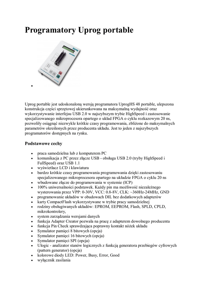 Programatory Uprog portable Uprog portable jest udoskonalon wersj programatora UprogHS 48 portable, ulepszona konstrukcja cz ci sprz towej ukierunkowana na maksymaln wydajno oraz wykorzystywanie interfejsu USB 2.0 w najszybszym trybie HighSpeed i zastosowanie specjalizowanego mikroprocesora opartego o uk ad FPGA o cyklu rozkazowym 20 ns, pozwoli y osi gn niezwykle krótkie czasy programowania, zbli one do maksymalnych parametrów okre lonych przez producenta uk adu. Jest to jeden z najszybszych programatorów dost pnych na rynku. Podstawowe cechy praca samodzielna lub z komputerem PC komunikacja z PC przez z cze USB - obs uga USB 2.0 (tryby HighSpeed i FullSpeed) oraz USB 1.1 wy wietlacz LCD i klawiatura bardzo krótkie czasy programowania programowania dzi ki zastosowaniu specjalizowanego mikroprocesora opartego na uk adzie FPGA o cyklu 20 ns wbudowane z cze do programowania w systemie (ICP) 100% uniwersalno ci podstawek. Ka dy pin ma mo liwo niezale nego wysterowania przez VPP: 0-30V, VCC: 0.8-8V, CLK: ~360Hz-24MHz, GND programowanie uk adów w obudowach DIL bez dodatkowych adapterów karty CompactFlash wykorzystywane w trybie pracy samodzielnej rodziny obs ugiwanych uk adów: EPROM, EEPROM, Flash, SPLD, CPLD, mikrokontrolery, system zarz dzania wersjami danych funkcja Adapter Creator pozwala na prac z adapterem dowolnego producenta funkcja Pin Check sprawdzaj ca poprawny kontakt nó ek uk adu Symulator pami ci 8 bitowych (opcja) Symulator pami ci 16 bitowych (opcja) Symulator pami ci SPI (opcja) Ulogic - analizator stanów logicznych z funkcj generatora przebiegów cyfrowych (pattern generator) (opcja) kolorowe diody LED: Power, Busy, Error, Good wy cznik zasilania oprogramowanie dla systemów Windows 2000/XP/Vista/Win7/Win8 (systemy 32 i 64 bitowe) obs uguj ce wiele programatorów jednocze nie Czasy programowania wybranych uk adów Uk ad Rozmiar Programowanie Odczyt, Weryfikacja K9F1G08U0A 1Gbit 95s 85s M29W800DB 8Mbit 11s (P+V)* 2s AM29F040B 4Mbit 12s (P+V)* 2s AT25F4096 4Mbit 16s 2s 29DL64DF 64Mbit 58s (P+V)* 8,5s * - Algorytm programowania zawiera weryfikacj Przy pracy w trybie stand-alone czasy programowania mog by d sze. System zarz dzania wersjami danych Oprogramowanie Uprog2 umo liwia stworzenie projektu zawieraj cego kilka ró nych zestawów danych dla ka dego z uk adów, pozwala to w sposób swobodny zarz dza wersj programowanego hardware'u. Do zestawu danych mo na do czy opis tekstowy który mo e by opisem poszczególnych wersji lub dowoln notatk , na przyk ad instrukcj monta u. Po utworzeniu zestawu danych ca y projekt mo na zapisa na kart CompactFlash i przy pomocy klawiatury wybra konkretny bufor danych. Opcja ta jest równie u yteczna np. przy odczytywaniu zawarto ci ró nych, ju zaprogramowanych uk adów, w tybie stand-alone gdzie po ka dym odczycie tworzony jest nowy data-set na karcie CompactFlash, umo liwiaj c atwe zarz dzanie plikami. Programowanie w systemie (ang. in-circuit programming, ICP). Widok z cza do programowania w systemie (in-circuit programming) Programator jest wyposa ony w z cze (14 pinów) pozwalaj ce na bezpo rednie programowanie uk adów w systemie (ang. in-circuit programming). Programatror obs uguje interfejsy typu: SPI, I2C, BDM, JTAG, 1 WIRE, 3 WIRE, oraz inne rodzaje interface'ów wyst puj cych w uk adach typu: 8051, AVR, ST72, PIC, MSP430, CPLD Xilinx/Altera i innych. Z cze ICP znajduje si w przedniej cz ci obudowy urz dzenia, co u atwia dost p do programowanego uk du. Cechy z cza ICP: • regulowany poziom interfejsu programowania oraz napi cia programuj cego w zakresie: Vcc 1.8V - 5V, Vpp 5V - 14V • mo liwo zasilenia programowanego uk adu z programatora • bardzo szybki transfer danych • elastyczny sprz g programatora z programowanym uk adem • zabezpieczenie przeciwzwarciowe Funkcja Adapter Creator Programatory Uprog posiadaj unikaln cech pozwalaj na u ywania adapterów dowolnych producentów dla uk adów w obudowach innych ni DIP. Przy pomocy narz dzia Adapter Creator mo liwa jest definicja konstrukcji adaptera lub, przy u yciu prostej sondy, zeskanowanie jej bezpo rednio z adaptera. Dzi ki temu narz dziu u ytkownik mo e w prosty sposób rozpozna sposób budowy adaptera bez konieczno ci u ywania miernika lub analizy schematu oraz zapisa jego konstrukcj do pliku w celu pó niejszego u ycia w procesie programowania. Pin Check - sprawdzanie poprawnego kontaktu nó ek uk adu. Programatory Uprog posiadaj mo liwo sprawdzania poprawno ci styku miedzy programowanym uk adem a podstawk programatora. Dodatkowo wykrywaj odwrotne enie uk adu do podstawki, co w wielu wypadkach ko czy si uszkodzeniem programowanego uk adu lub programatora. Funkcja jest szczególnie istotna przy programowaniu uk adów jednokrotnego programowania, lub uk adów o du ej ilo ci wyprowadze , gdzie brak kontaktu na której z nó ek jest bardzo trudny do stwierdzenia i cz sto uniemo liwia w ciwe zaprogramowanie uk adu. Wykonanie funkcji PinCheck powoduje e Uprog automatycznie testuje, czy poszczególne nó ki uk adu scalonego dobrze kontaktuj z podstawk programatora. Nie kontaktuj ce nó ki wskazywane s czerwon strza . Uprog wykrywa odwrotne w enie uk adu do podstawki programatora. U ytkownik widzi to w postaci wy wietlenia wszystkich niekontaktuj cych nó ek w kolorze czerwonym. Symulator 8-bitowych pami ci EPROM (opcja). Uprog portable jako symulator pami ci Programator mo e zosta wyposa ony w symulator pami ci EPROM o nast puj cych ciwo ciach: • symulacja pami ci od 2KB do 64KB (opcjonalnie do 256KB - po rozbudowie pami ci) • krótki czas adowania zawarto ci pami ci • krótki czas dost pu: oko o 30ns • mo liwo resetu systemu mikroprocesorowego po za adowaniu danych • zmienny poziom napi cia: od 1.8V do 5V Symulator 16-bitowych pami ci EPROM (opcja). Opcjonalnie dost pny jest symulator 16-bitowych pami ci EPROM o nast puj cych ciwo ciach: • symulacja pami ci 64KWords (opcjonalnie do 128KWords i 256KWords - po rozbudowie pami ci) • krótki czas adowania za