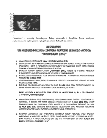 „ Monodram” – monolog dramatyczny, będący zamkniętą i kompletną formą sceniczną, przeznaczoną do wykonywania przez jednego aktora; teatr jednego aktora. 1. ORGANIZATOREM SPOTKAŃ JEST PAŁAC MŁODZIEŻY W BYDGOSZCZY. 2. CELEM SPOTKAŃ JEST KONFRONTACJA MŁODZIEŻOWYCH TEATRÓW JEDNEGO AKTORA, KTÓRE W SWOICH SPEKTAKLACH MÓWIĄ O PROBLEMACH MŁODYCH LUDZI I WSPÓŁCZESNEGO ŚWIATA ORAZ POZNANIE ZJAWISKA AKTYWNOŚCI TEATRALNEJ MŁODEGO POKOLENIA. 3. SPOTKANIA TEATRÓW JEDNEGO AKTORA „MONODRAM 2016”, ODBĘDĄ SIĘ W PAŁACU MŁODZIEŻY W BYDGOSZCZY. FINAŁ ZAPLANOWANY JEST NA DZIEŃ 28 MAJA 2016 ROKU. 4. W PRZEGLĄDZIE UCZESTNICZYĆ MOGĄ TEATRY INSTYTUCJONALNE I POZAINSTYTUCJONALNE SKUPIAJĄCE MŁODZIEŻ DO 25 ROKU ŻYCIA. 5. CZAS TRWANIA MONODRAMU, PRZYGOTOWANEGO W OPARCIU O DOWOLNY TEKST LITERACKI, NIE MOŻE PRZEKROCZYĆ 30 MINUT. 6. PODSTAWĄ ZGŁOSZENIA JEST NADESŁANIE DO DNIA 07 MAJA 2016 ROKU ZAREJESTROWANEGO NA PŁYCIE DVD SPEKTAKLU ORAZ WYPEŁNIONEJ KARTY ZGŁOSZENIA, NA ADRES : PAŁAC MŁODZIEŻY W BYDGOSZCZY (DZIAŁ SZTUKI), UL. JAGIELLOŃSKA 27, 85 – 097 BYDGOSZCZ Z DOPISKIEM „MONODRAM 2016”. 7. ORGANIZATOR POWOŁA RADĘ KWALIFIKACYJNĄ, KTÓRA DOKONA OCENY SPEKTAKLI ZGŁOSZONYCH DO KONKURSU. O DECYZJI JURY TEATRY ZOSTANĄ POWIADOMIONE DO 14 MAJA 2016 ROKU. OSOBY ZAKWALIFIKOWANE DO FINAŁOWEGO ETAPU KONKURSU SĄ ZOBOWIĄZANE PRZESŁAĆ, DO DNIA 16 MAJA 2015 ROKU OFICJALNE POTWIERDZENIE UCZESTNICTWA ORAZ MATERIAŁY REKLAMOWE (DODATKOWE INFORMACJE O AUTORACH MONODRAMU WRAZ ZE ZDJĘCIAMI). 8. INSTYTUCJA ZGŁASZAJĄCA LUB OPIEKUNOWIE POKRYWAJĄ KOSZTY PRZEJAZDU ORAZ WPŁACAJĄ AKREDYTACJĘ W WYSOKOŚCI 100 ZŁ (OD OSOBY). WPŁAT NALEŻY DOKONAĆ PRZELEWEM NA KONTO : BANK PEKAO S.A. W BYDGOSZCZY, NR 02 1240 6452 1111 0010 4797 5830 DO DNIA 16 MAJA 2016 ROKU, Z DOPISKIEM „MONODRAM 2016”. 9. OSOBY BIORĄCE UDZIAŁ W FESTIWALU WYRAŻAJĄ ZGODĘ NA REJESTRACJĘ PREZENTOWANYCH MONODRAMÓW. 10. TEATRY PRZYJEŻDŻAJĄ Z WŁASNYMI DEKORACJAMI I REKWIZYTAMI NIEZBĘDNYMI DO REALIZACJI SPEKTAKLU. W SYTUACJACH WYJĄTKOWYCH PROSIMY O KONTAKT Z KIEROWNIKIEM ARTYSTYCZNYM SPOTKAŃ. 11. TEATRY UCZESTNICZĄ W PROGRAMIE ZAPROPONOWANYM PRZEZ ORGANIZATORÓW. 12. ORGANIZATORZY ZAPEWNIAJĄ PROFESJONALNE JURY ORAZ WARUNKI SCENICZNE I OBSŁUGĘ TECHNICZNĄ ZGODNIE Z INFORMACJAMI PRZESŁANYMI W KARCIE ZGŁOSZENIA. 13. SPOTKANIA MAJĄ CHARAKTER KONKURSOWY. 14. JURY OCENIAĆ BĘDZIE: UMIEJĘTNOŚCI AKTORSKIE, SZCZEROŚĆ WYPOWIEDZI (ZGODNOŚĆ Z OSOBOWOŚCIĄ I WIEKIEM WYKONAWCY), INTERESUJĄCE ZABIEGI SCENICZNE, ZASTOSOWANE ŚRODKI WYRAZU ARTYSTYCZNEGO ORAZ REŻYSERIĘ. 15. PRZEWIDZIANE SĄ NAGRODY DLA WYKONAWCÓW ORAZ DYPLOMY I PAMIĄTKI. JURY PRZYZNA ZŁOTY, SREBRNY ORAZ BRĄZOWY MONODRAM. 16. ORGANIZATORZY SPOTKAŃ, W UZASADNIONY7CH PRZYPADKACH, ZASTRZEGAJĄ SOBIE PRAWO DO ZMIAN REGULAMINOWYCH. KIEROWNIK ARTYSTYCZNY SPOTKAŃ: JACEK MAŁACHOWSKI TEL. +48 505241309, E-MAIL [email protected] 1. IMIĘ, NAZWISKO ORAZ WIEK WYKONAWCY ....................................................................................... 2. PLACÓWKA DELEGUJĄCA (ADRES) ..................................................................................................... 3. IMIĘ I NAZWISKO INSTRUKTORA ........................................................................................................ 4. ADRES KONTAKTOWY, NR TELEFONU ................................................................................................. 5. TYTUŁ MONODRAMU ......................................................................................................................... 6. SCENARIUSZ ..................................................................................................................................... 7. REŻYSERIA ........................................................................................................................................ 8. OPRACOWANIE MUZYCZNE ............................................................................................................... 9. OPRACOWANIE PLASTYCZNE .............................................................................................................. 10. CZAS TRWANIA .................................................................................................................................. 11. CZAS PRZYGOTOWANIA (MONTAŻ, DEMONTAŻ) .................................................................................... 12. POTRZEBY SPEKTAKLU W ZAKRESIE WARUNKÓW WYSTĘPU - OŚWIETLENIE ........................................................................................................................ - NAGŁOŚNIENIE ..................................................................................................................... - INNE .................................................................................................................................... 13. TERMIN PRZYJAZDU DO BYDGOSZCZY ................................................................................................. UWAGA! PODPISANIE KARTY ZGŁOSZENIA JEST JEDNOZNACZNE Z ZAAKCEPTOWANIEM WSZYSTKICH PUNKTÓW REGULAMINU. PLACÓWKA DELEGUJĄCA PODPIS UCZESTNIKA